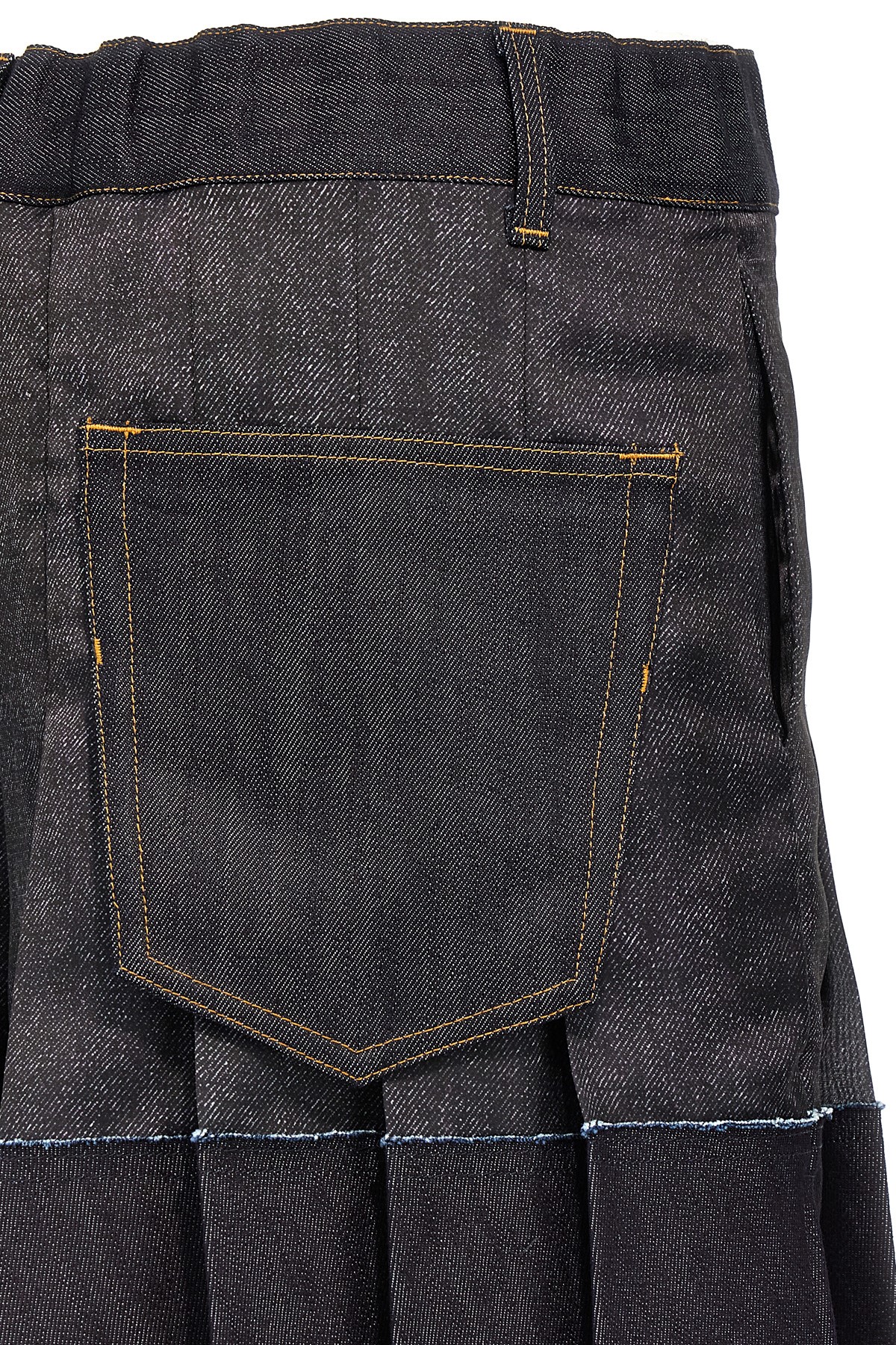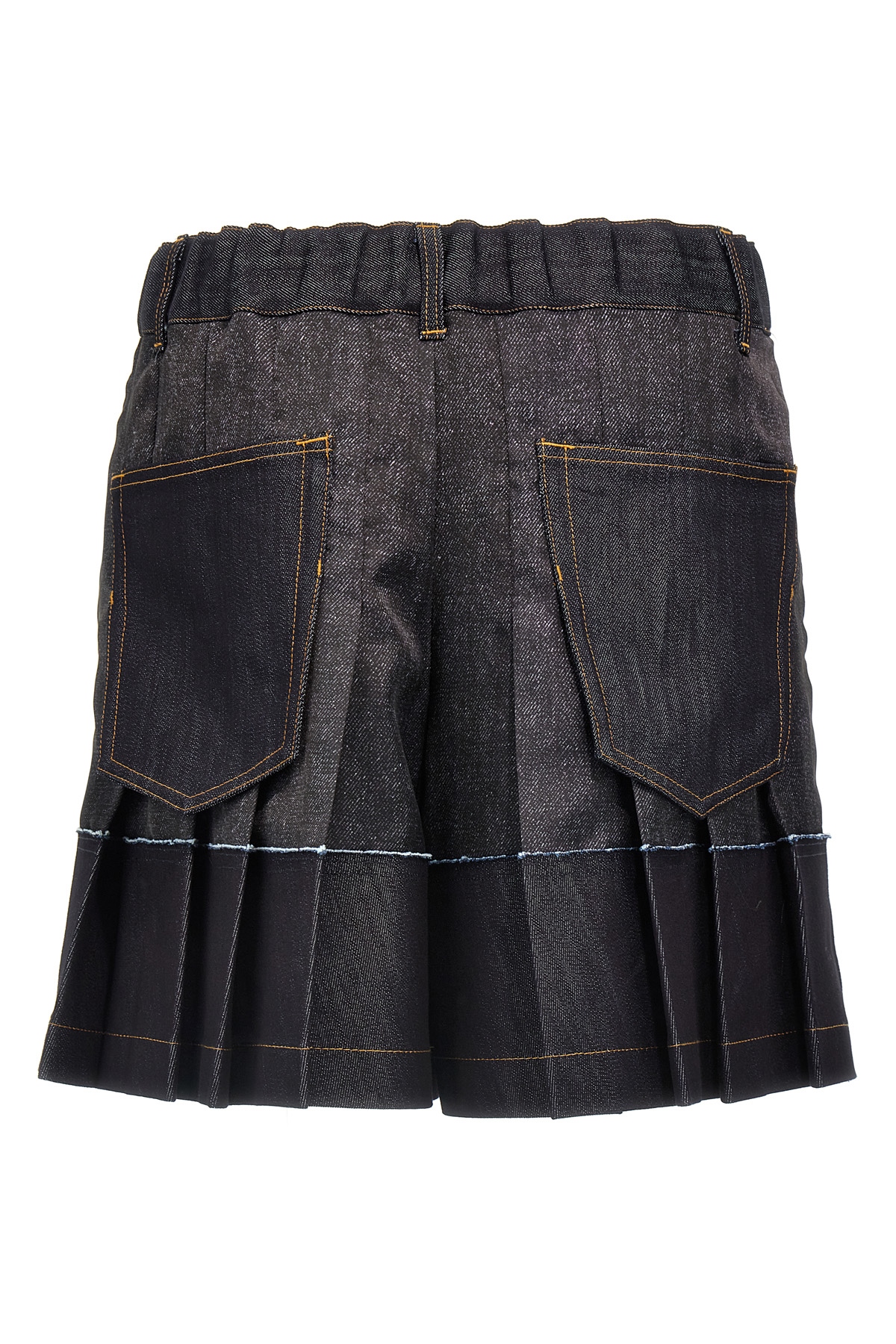 Denim print synthetic fabric shorts with cotton denim details, flounced model with wide leg, zip and button closure, elastic waistband, pockets.