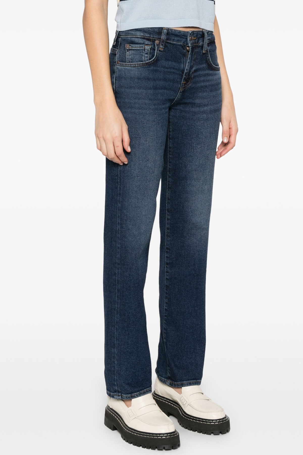 Luxe Vintage stretch cotton denim 'Calie' five-pocket jeans, zip and button closure, back leather logo tag.