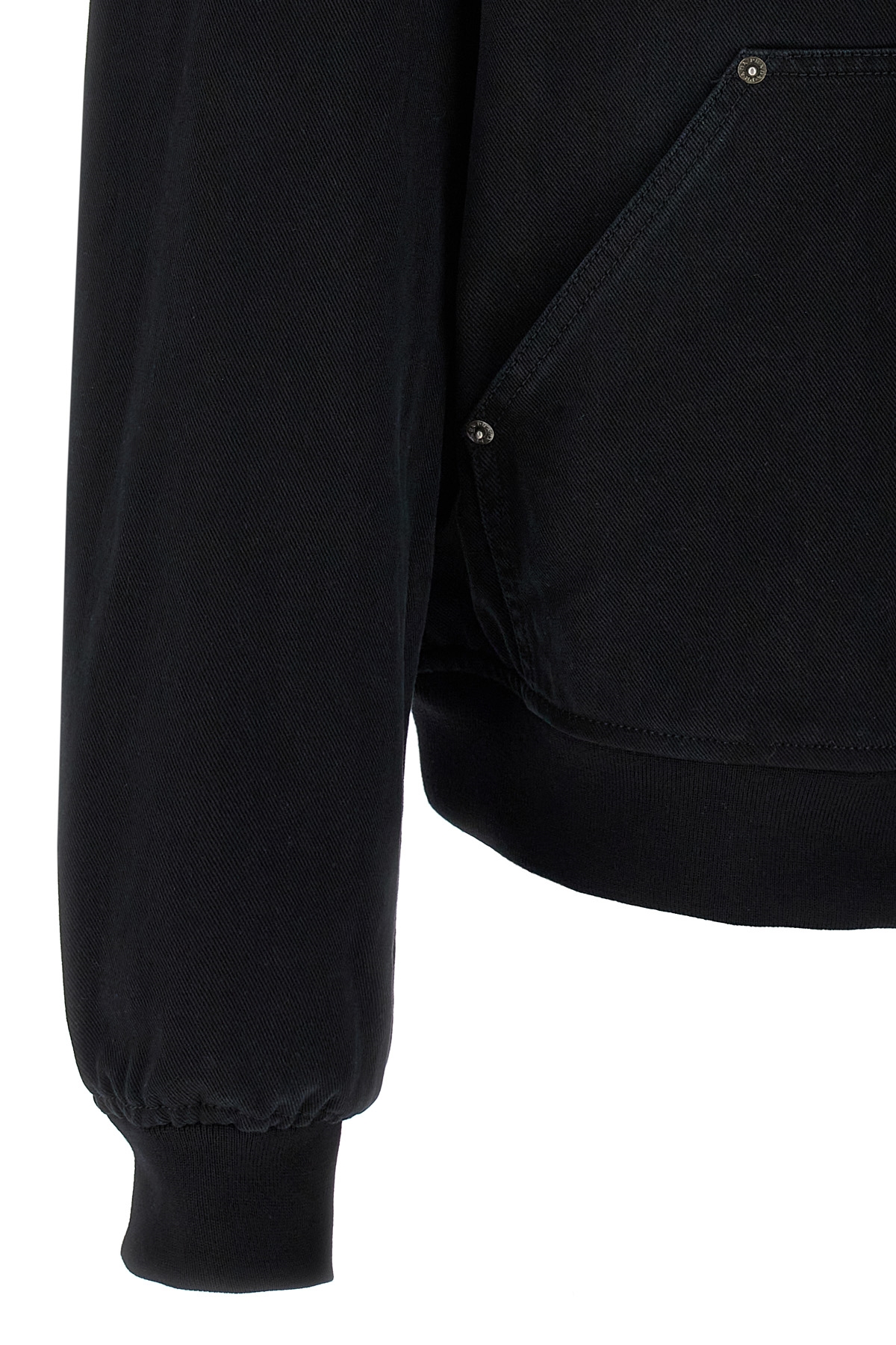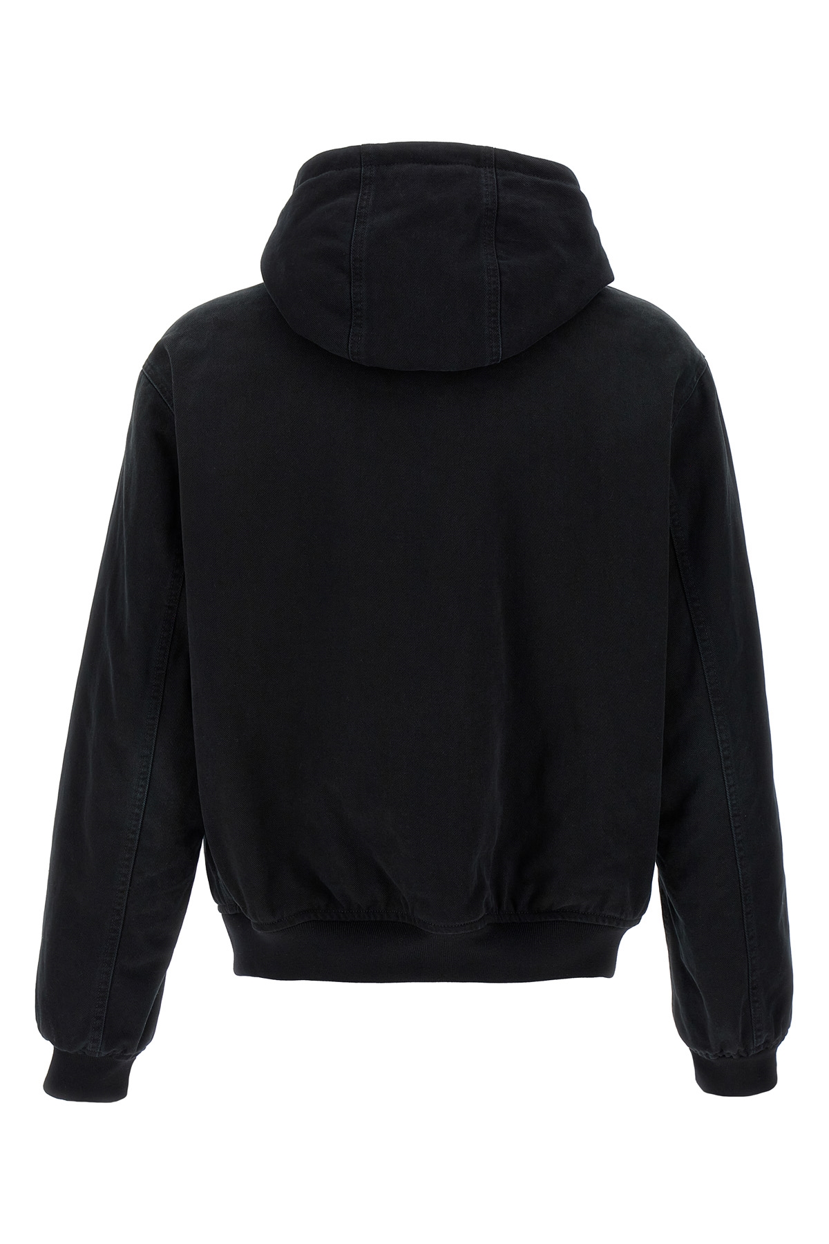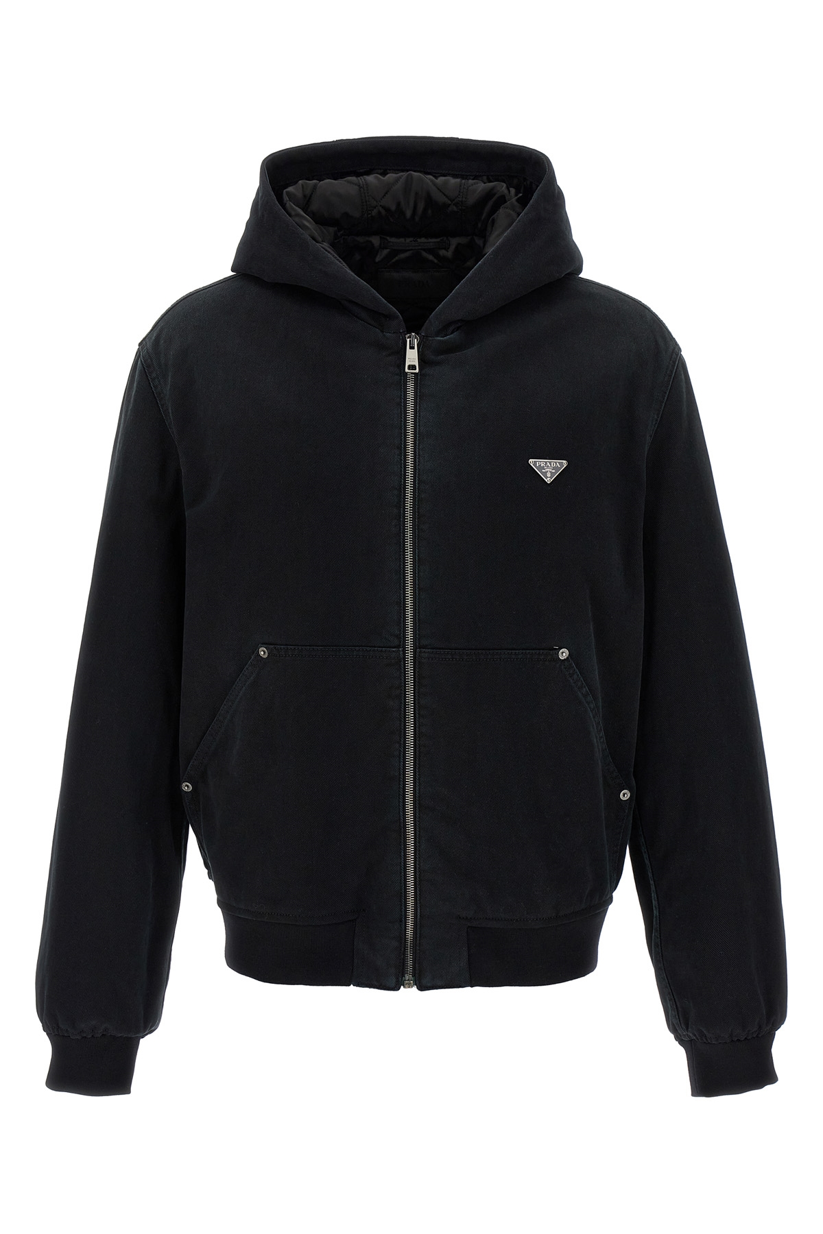 Padded washed cotton denim jacket, front enameled metal triangle logo, quilted viscose lining, hood with adjustable drawstring, front pockets with rivets, zip closure, long cuffed sleeves.