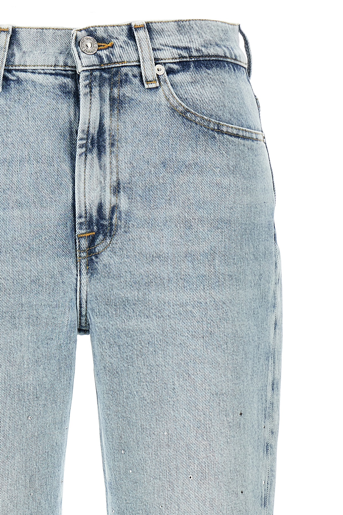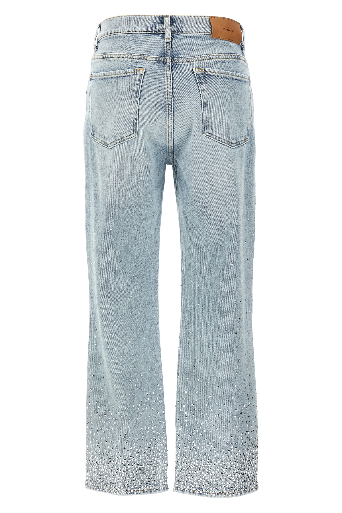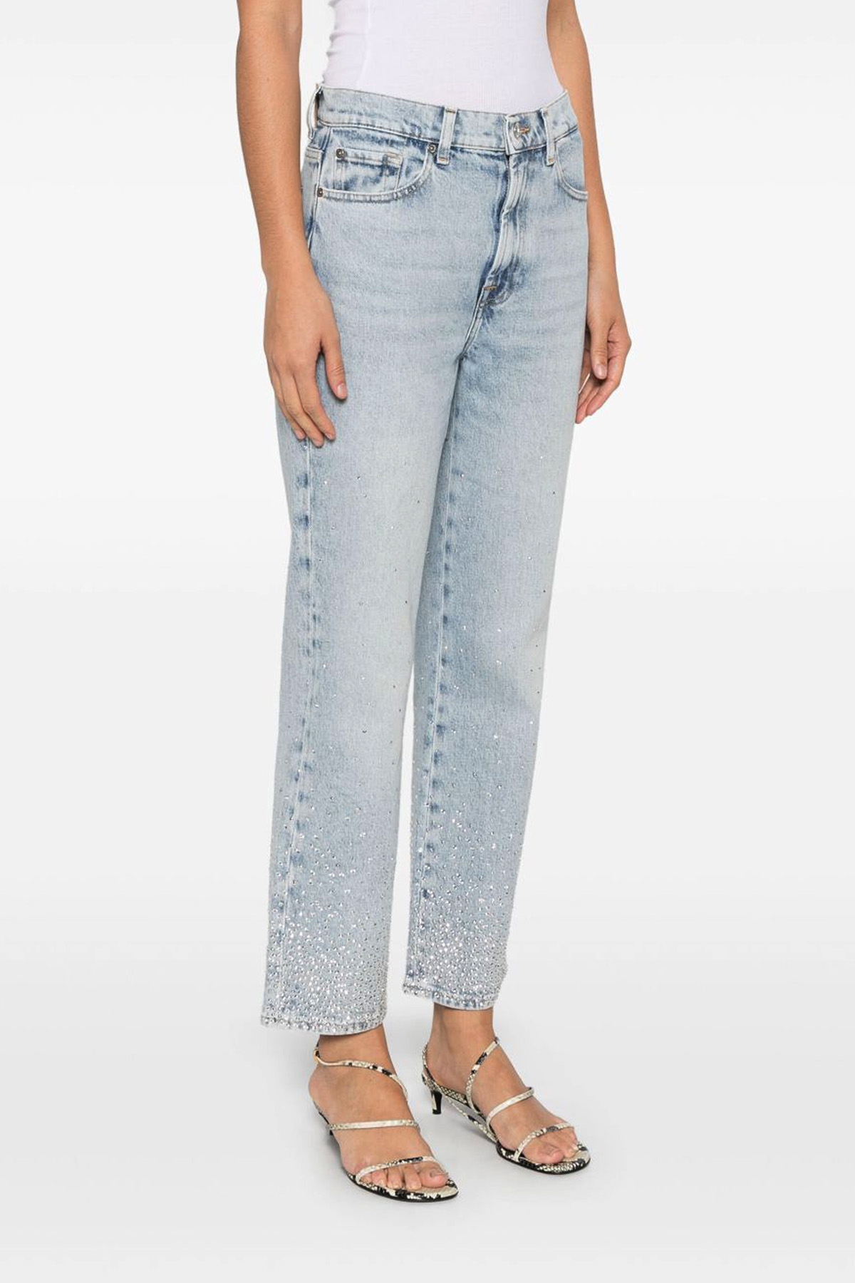 Logan Stovepipe' denim jeans with vintage wash and cascading crystal applique on the hems, high waist and straight leg, zip and button closure, five pockets, and leather logo label at the back.
