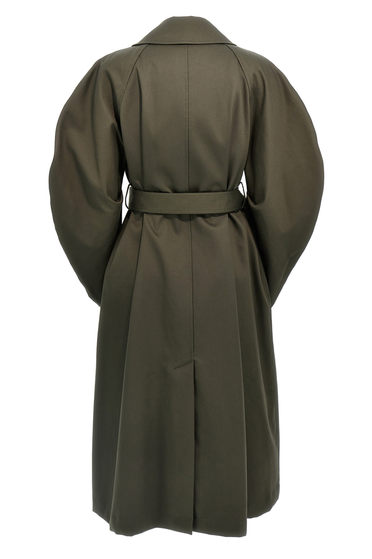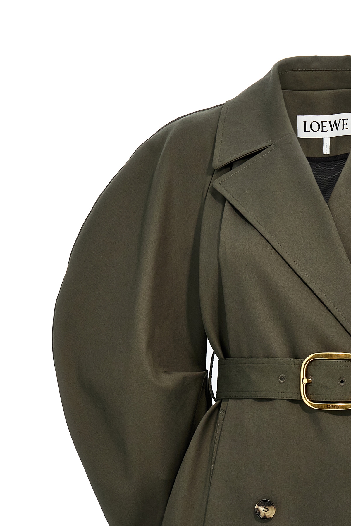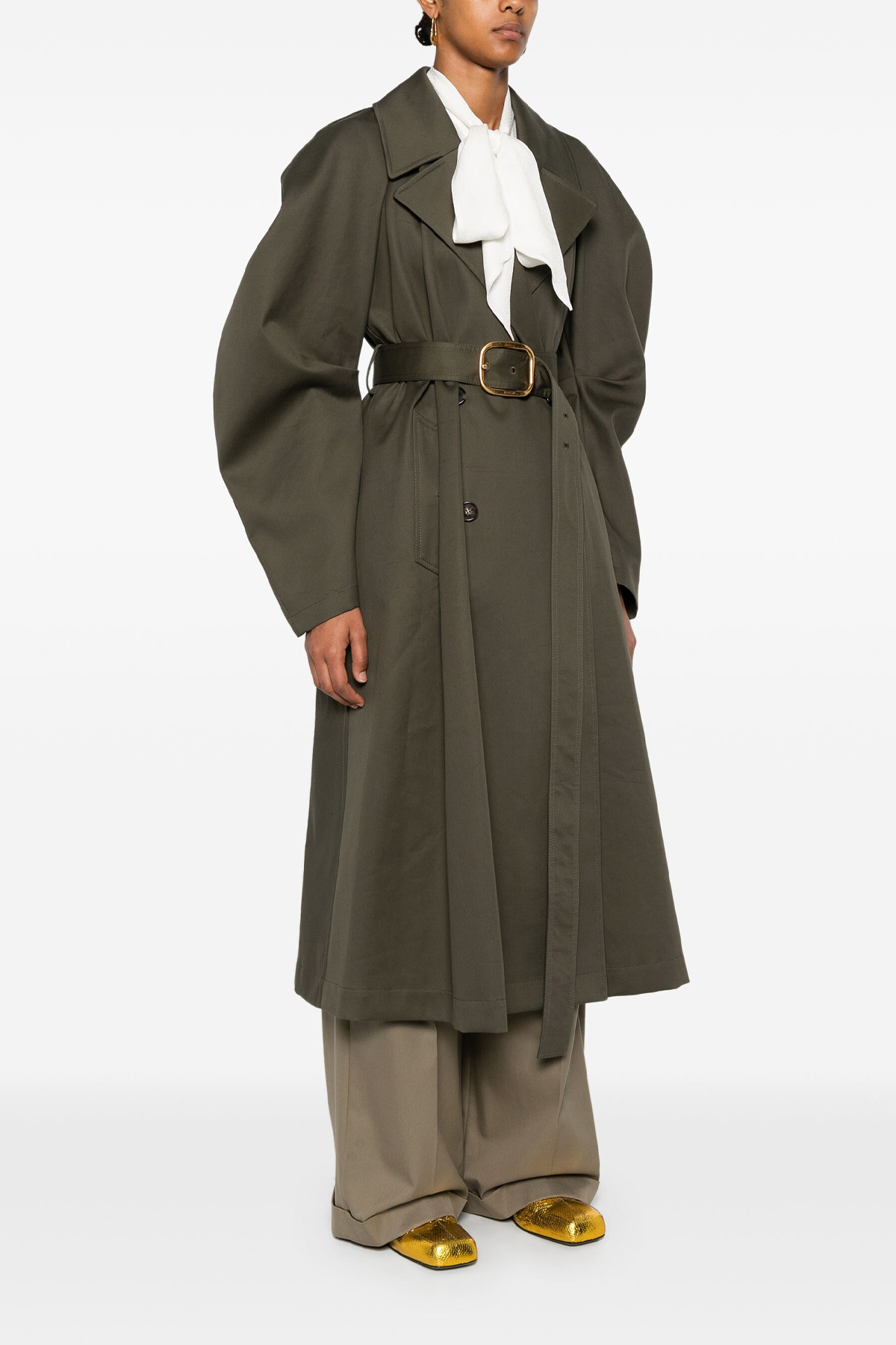Double-breasted water-repellent cotton drill trench coat, classic lapels, curved long sleeves, button closure, pockets, back split, matching and removable fabric belt with engraved buckle.