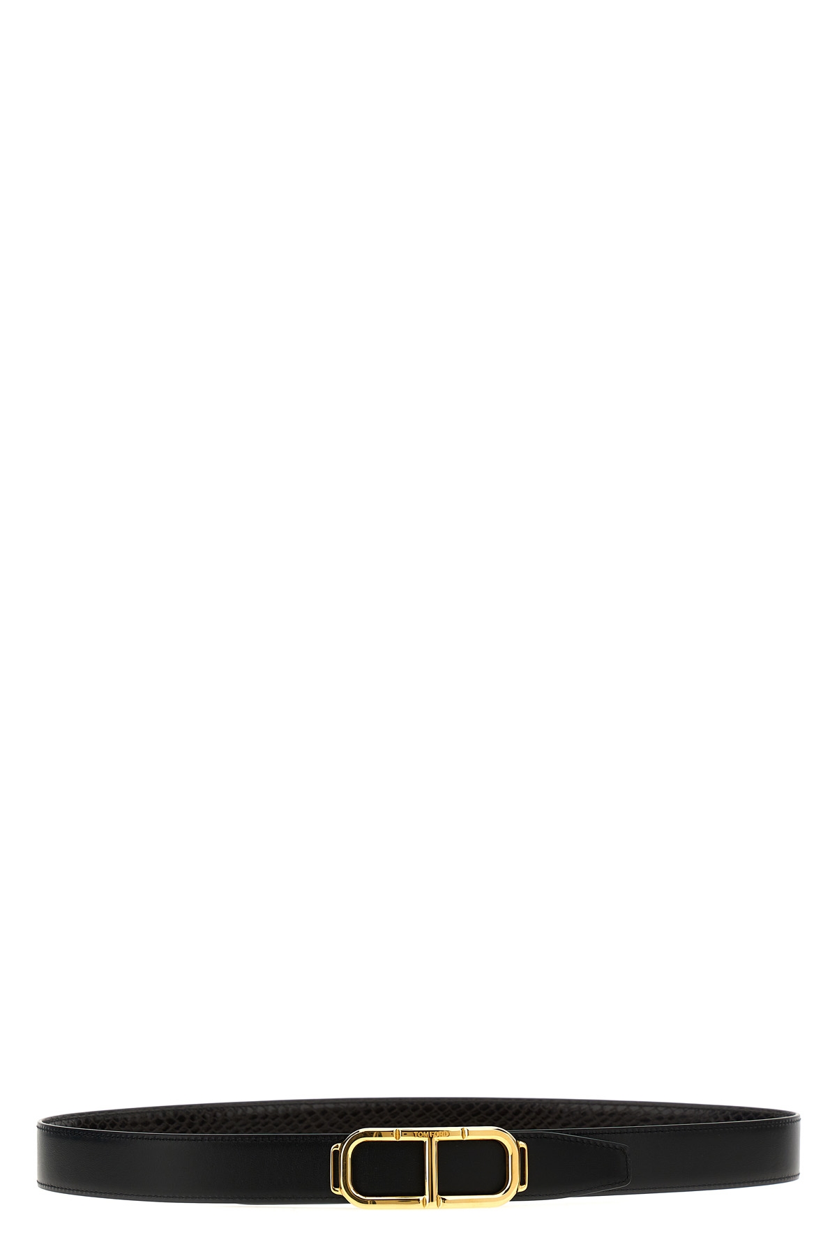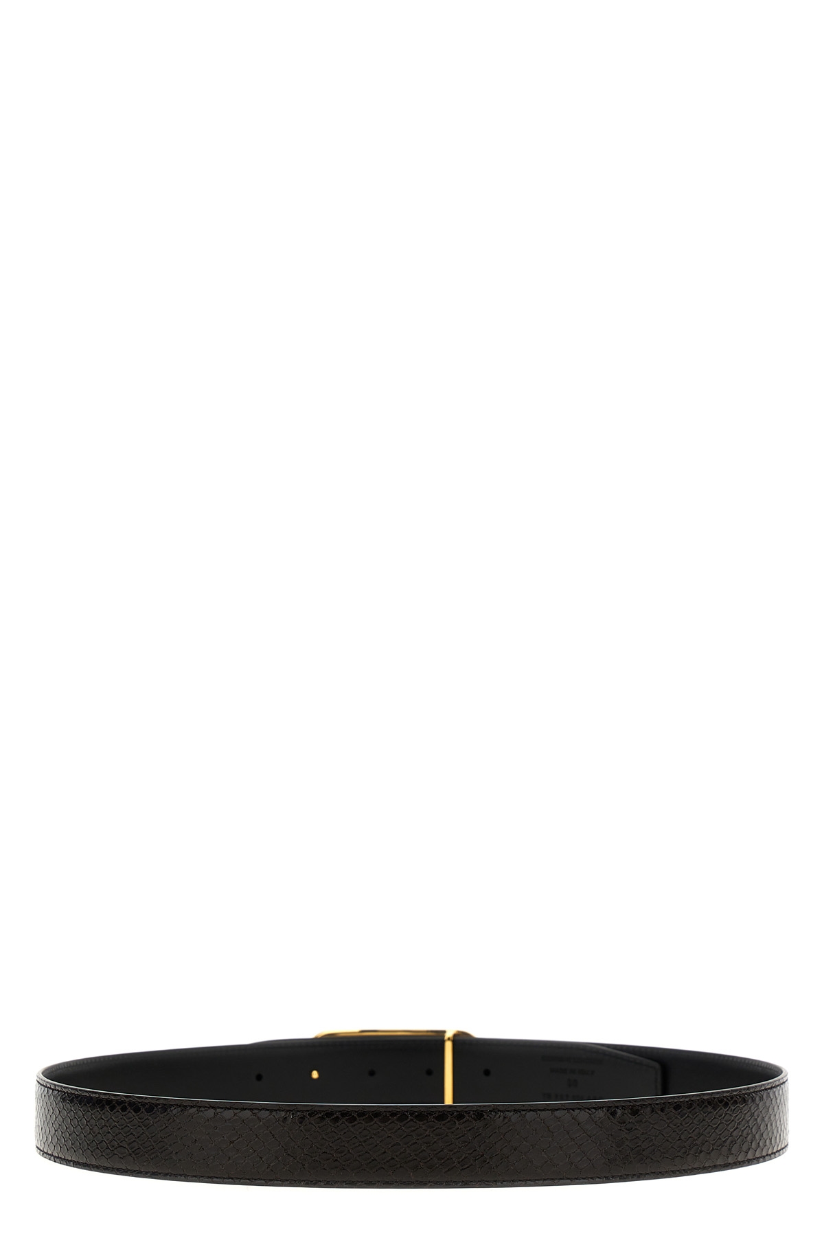 Reversible leather belt with python print side in glossy patent leather and metal logo buckle.