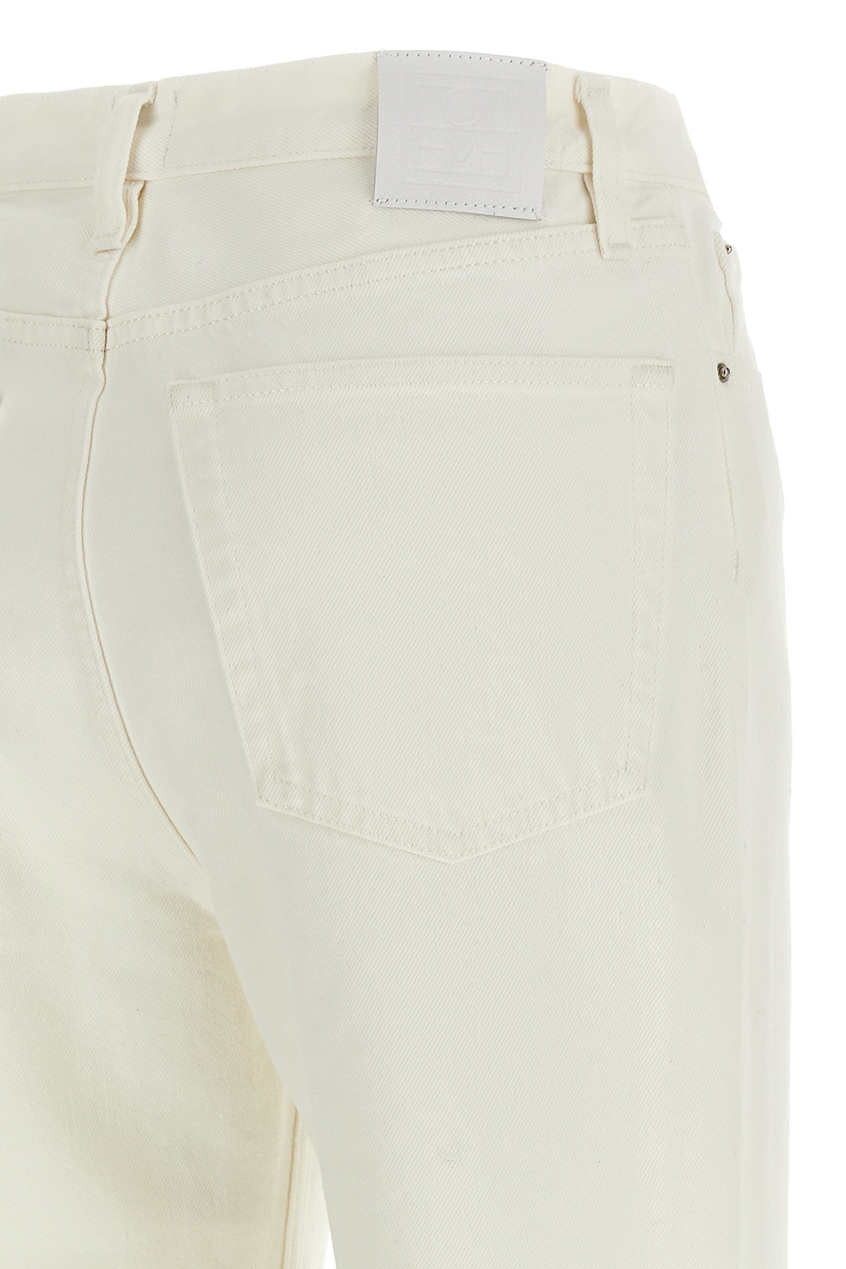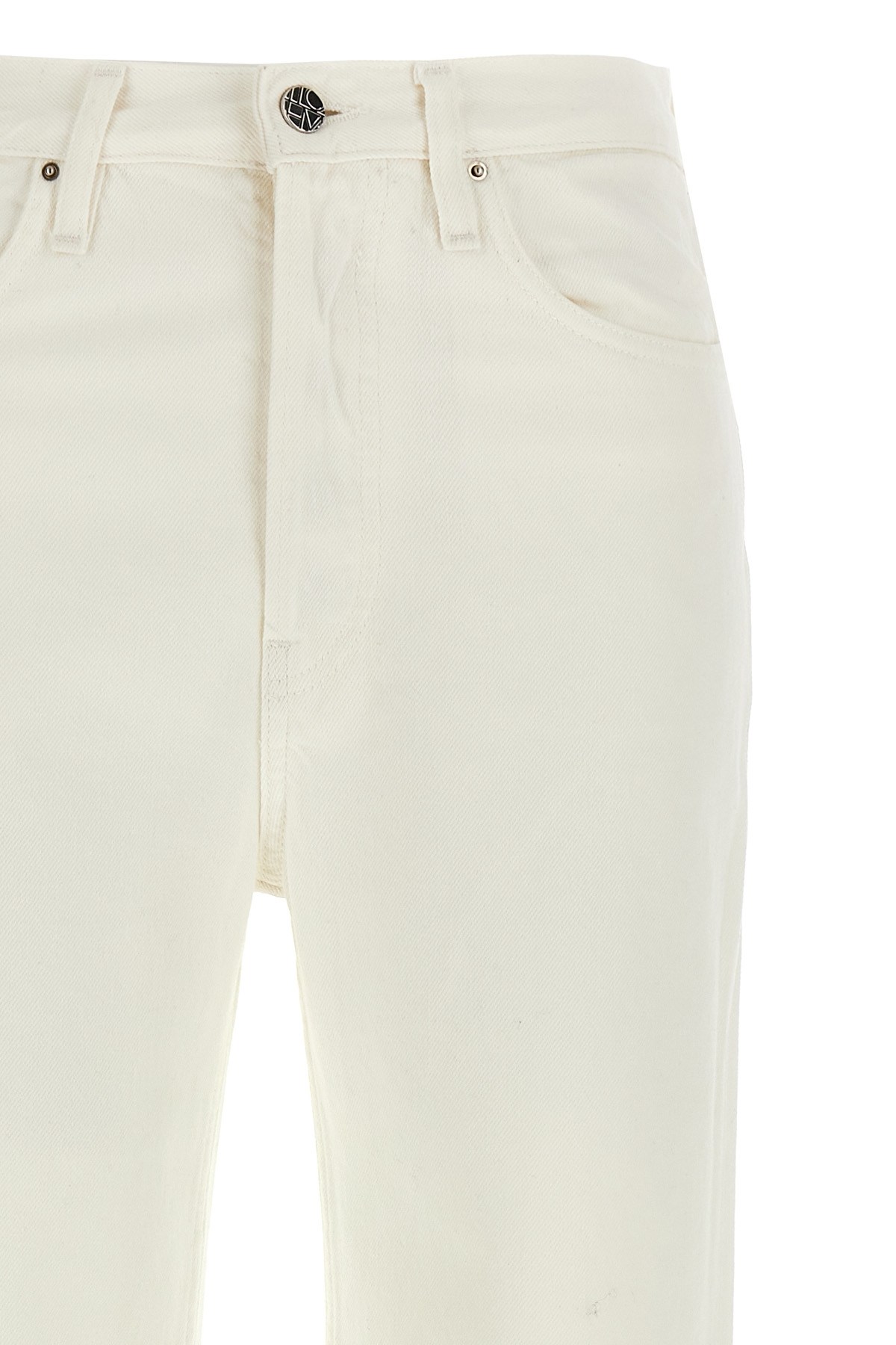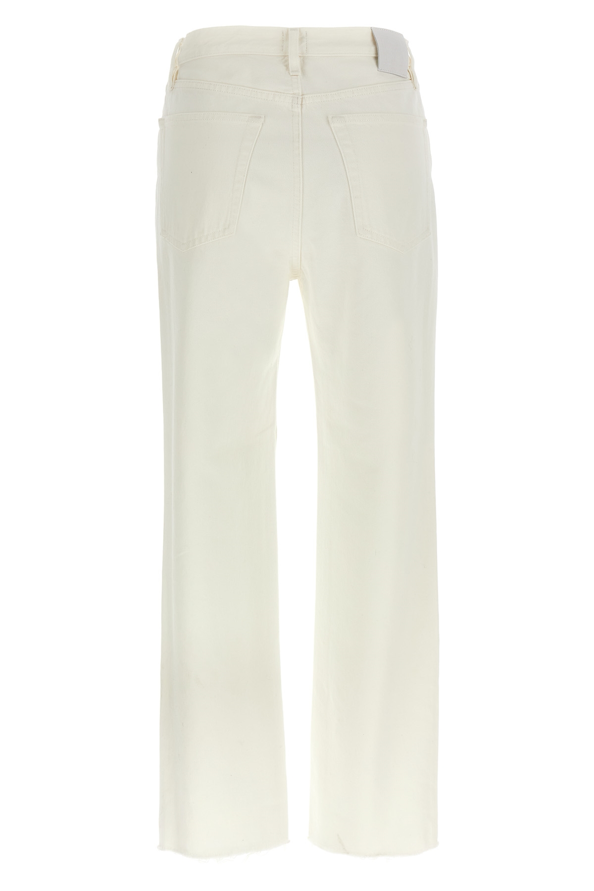 High-waisted cotton denim jeans with straight leg, five pockets, button closure, raw cut leg bottoms, and leather logo label on the back.