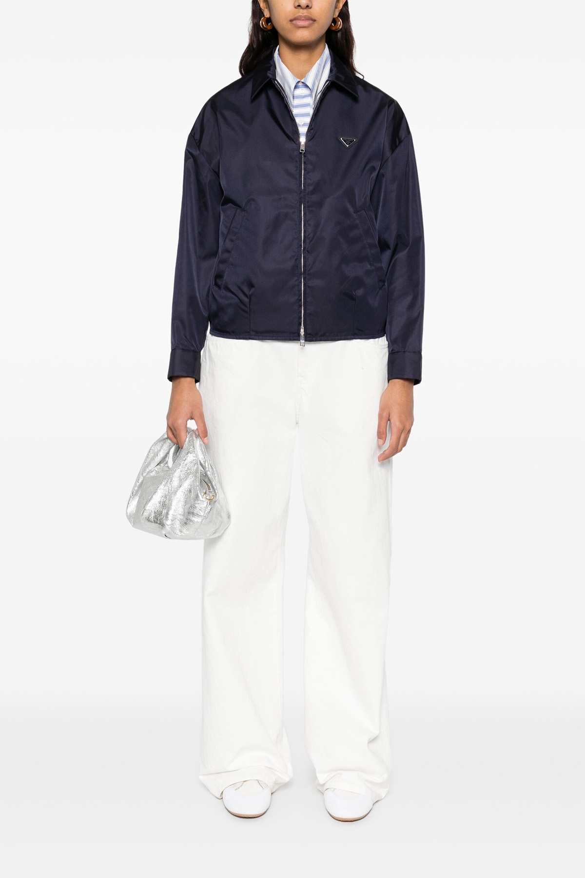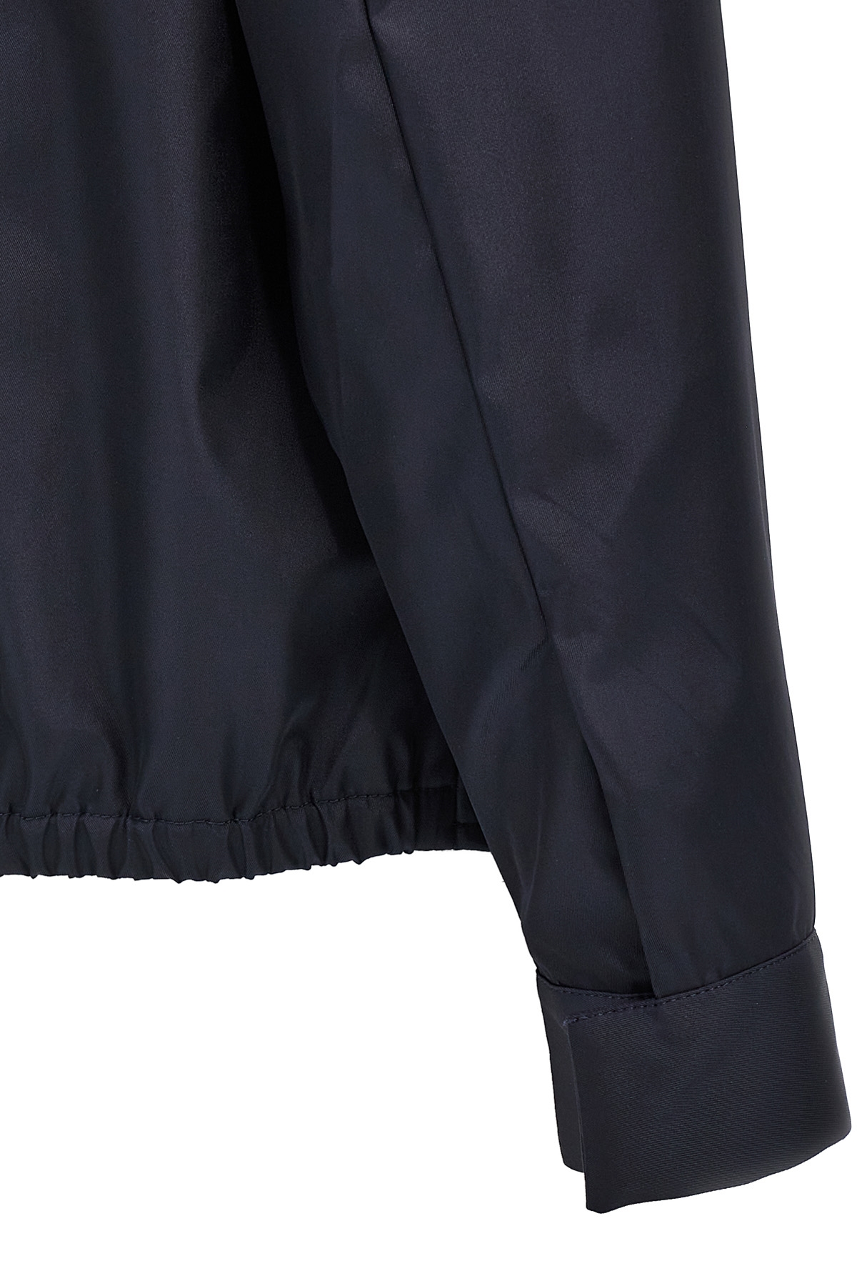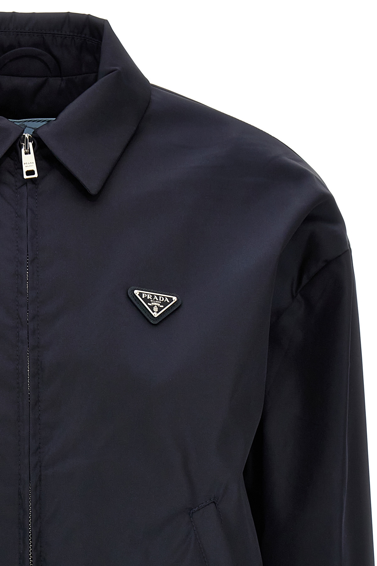 Re-Nylon jacket, triangle logo in enameled metal on the front, collar, zip closure, long sleeves with cuffs, pockets, elastic on the hem.