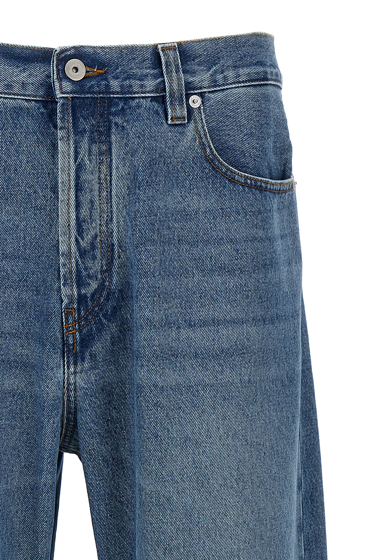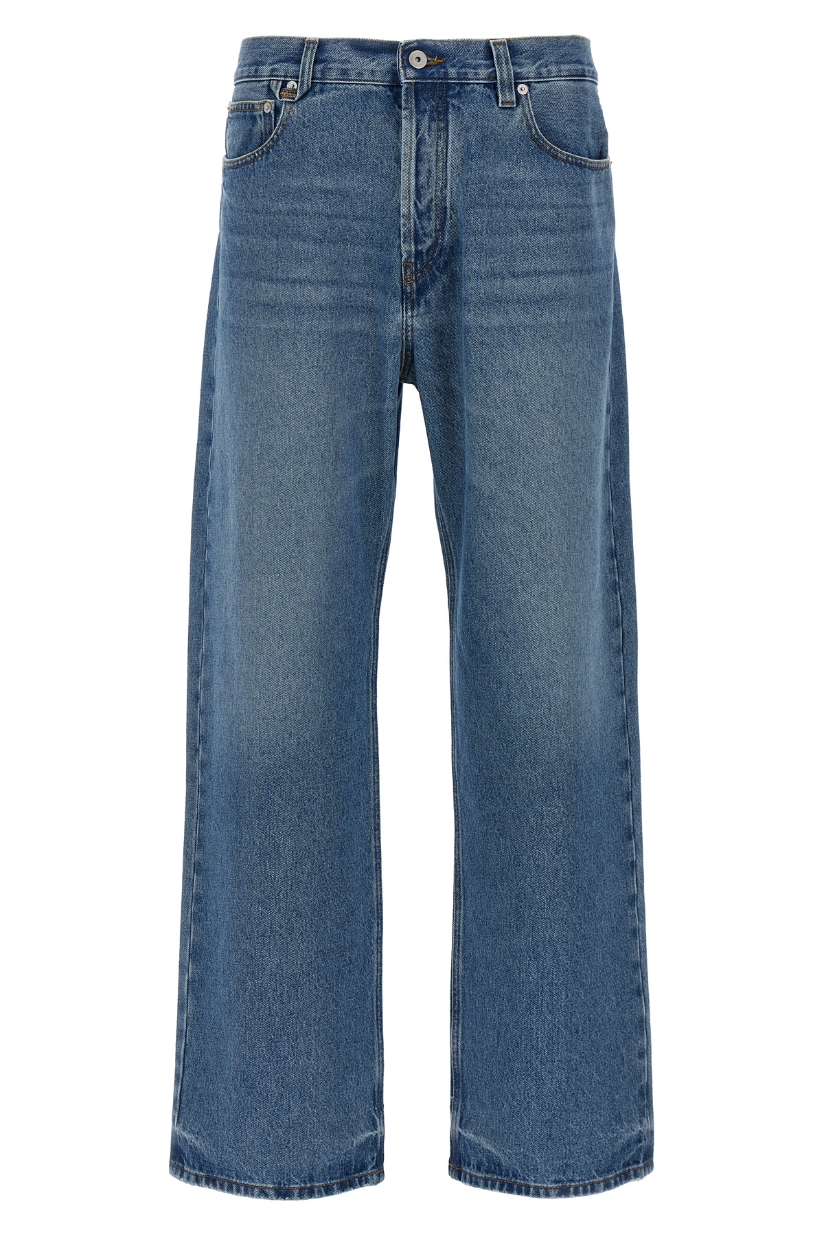 'Le De-Nimes Droit' jeans in slightly delave cotton denim, high waist model with wide and straight leg, button closure, five pockets, maxi leather logo label at the back.