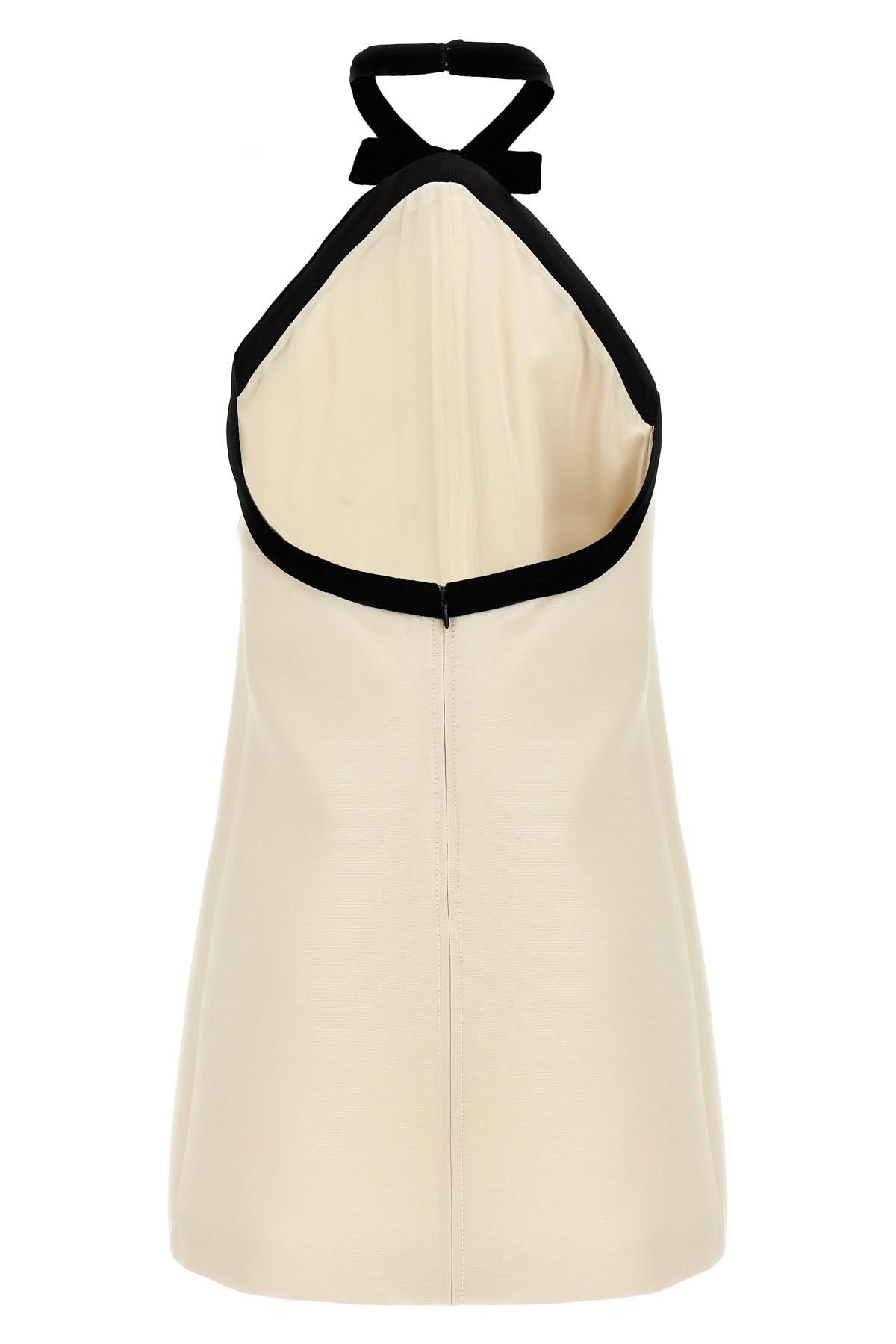 Mini dress in wool and silk blend with velvet details, American neckline, front bow, back zip closure and hooks in the neck.