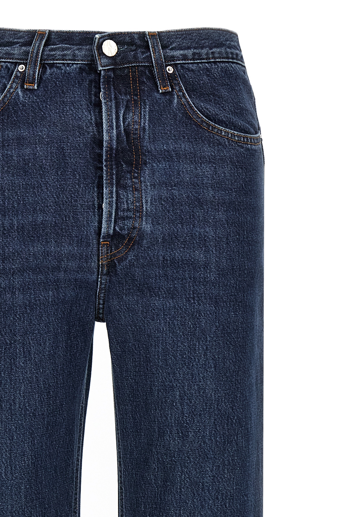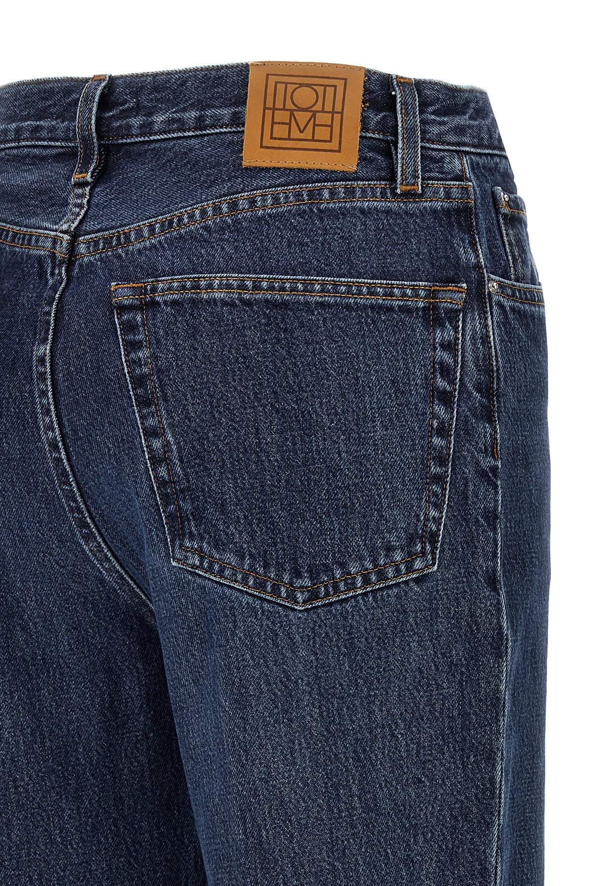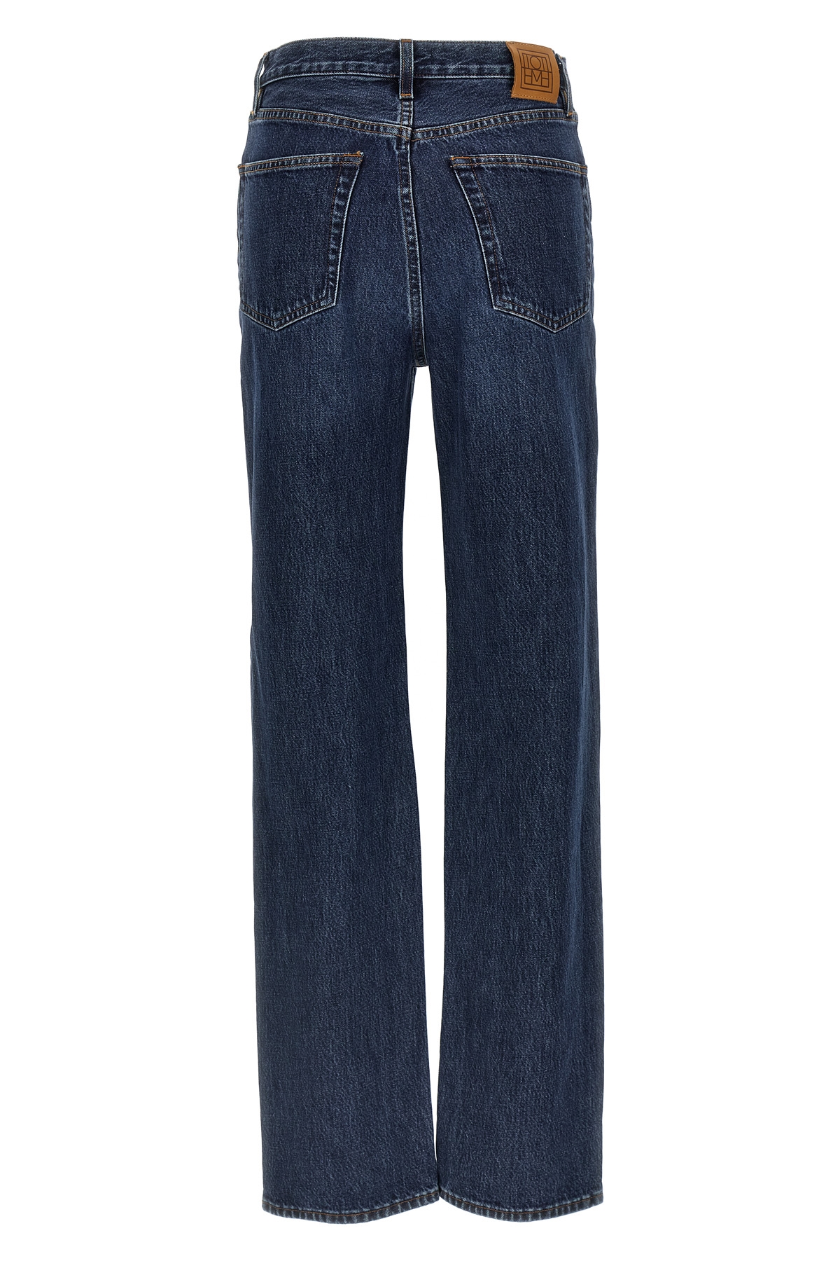 Cotton denim jeans with button closure, five pockets, high waist with straight leg, and leather logo label on the back.