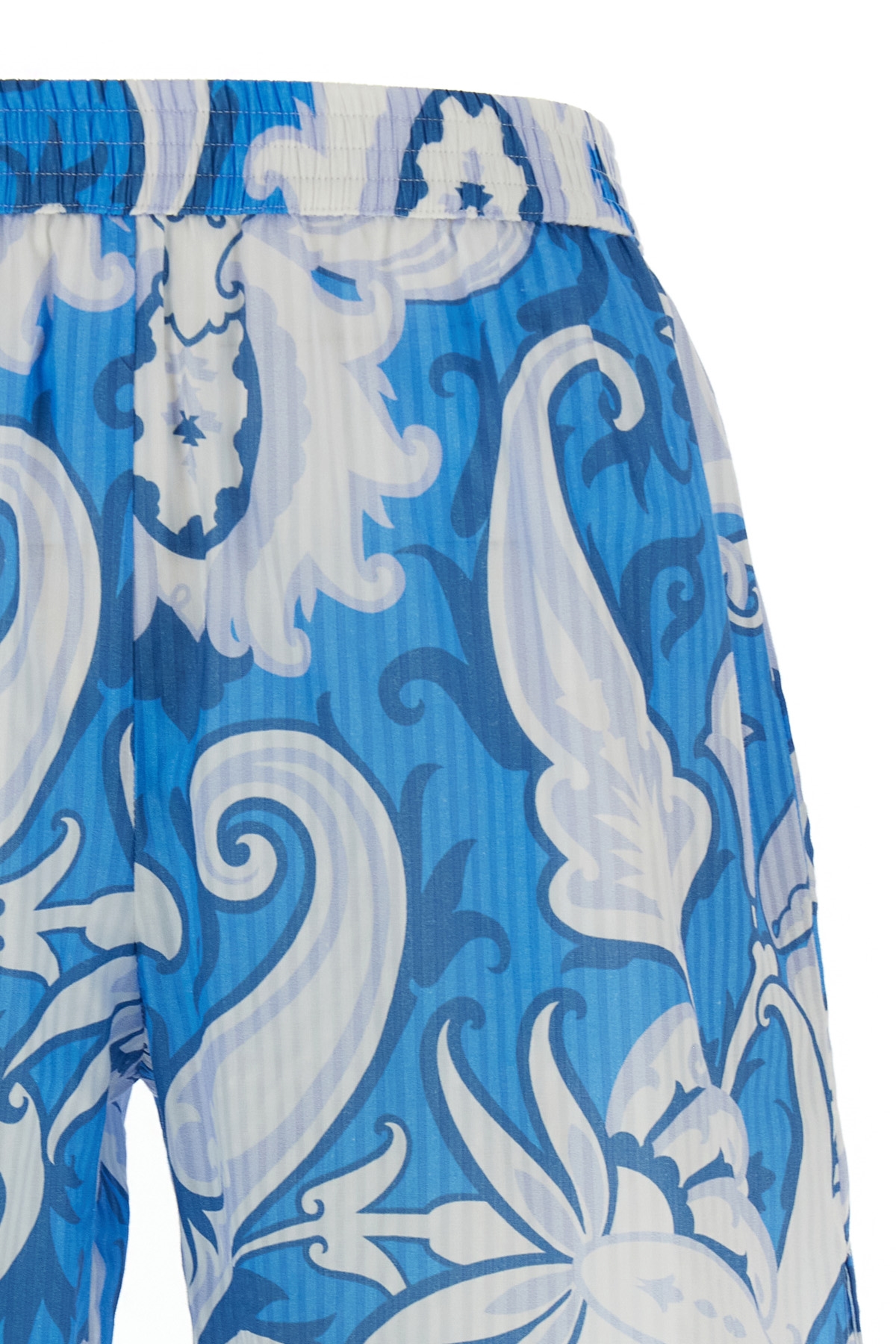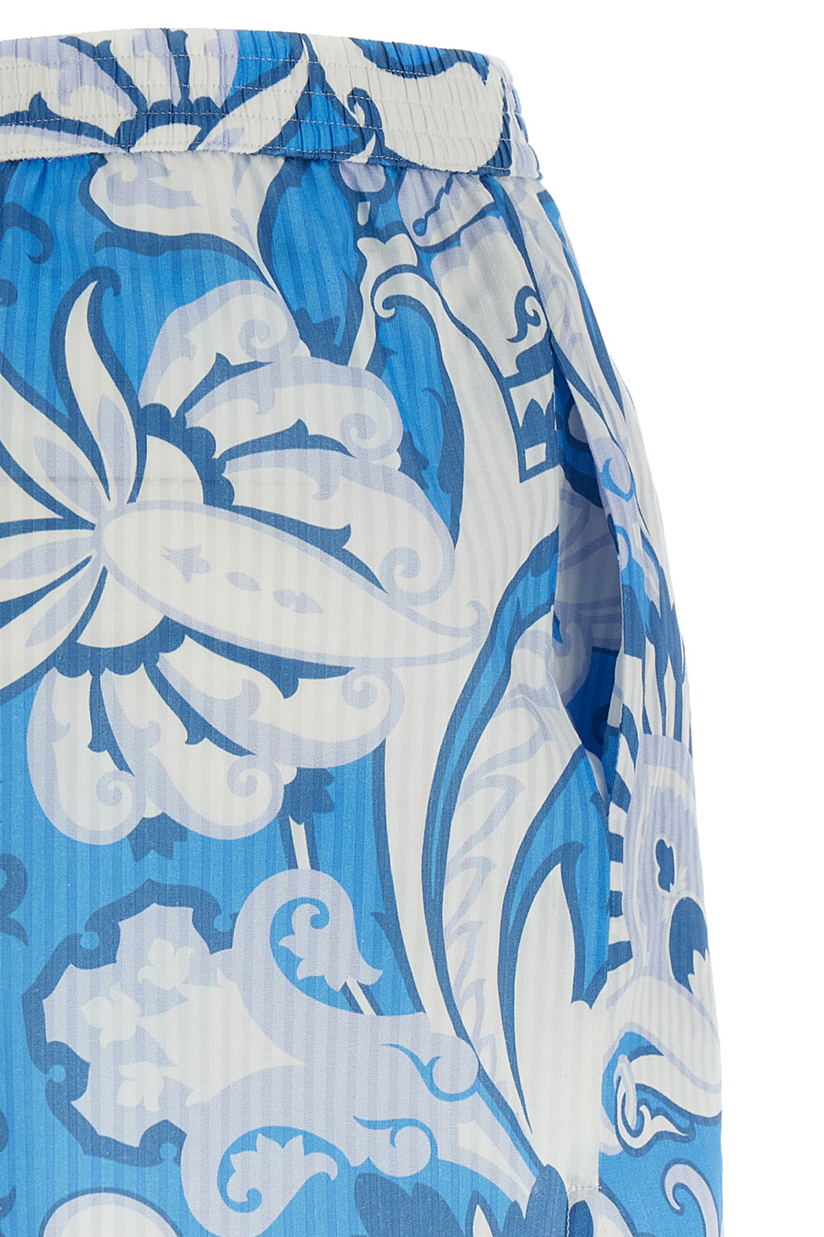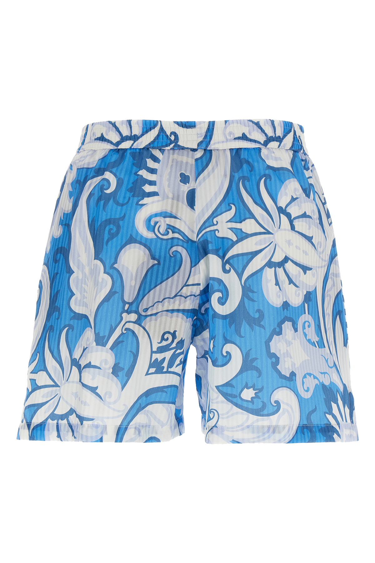 Floral print striped cotton and silk blend shorts, elastic waistband, pockets, side splits.
