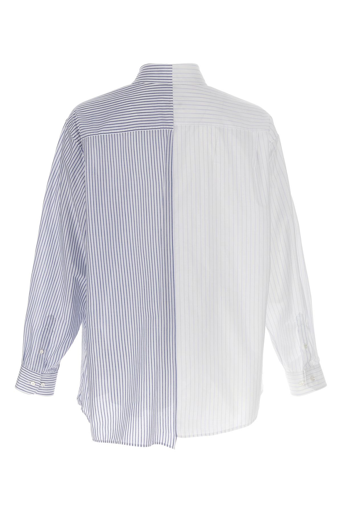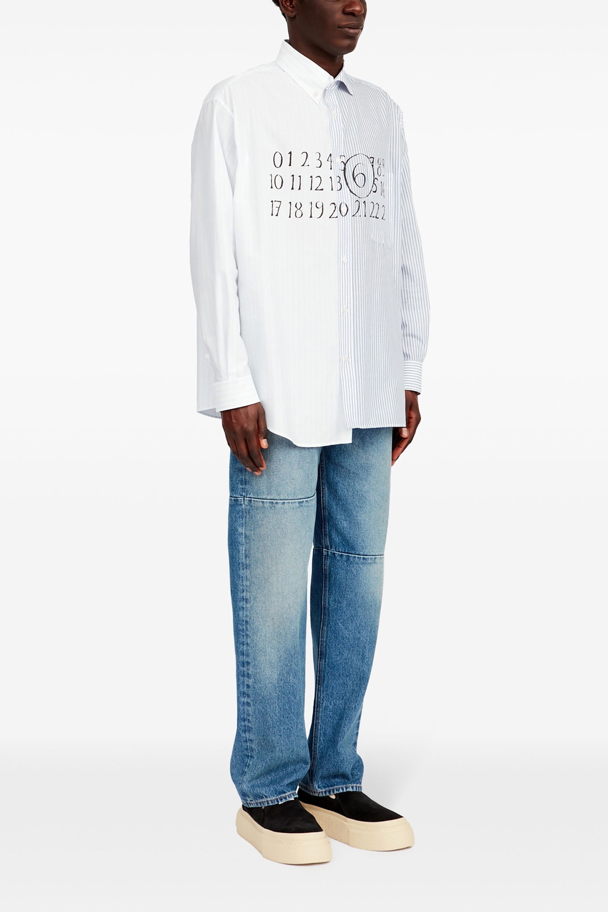 Asymmetric patchwork cotton poplin shirt with front 'Numeric Signature MM6' logo print, button closure, long cuffed sleeves, chest pocket.