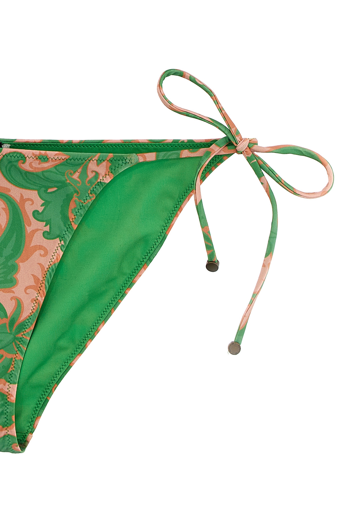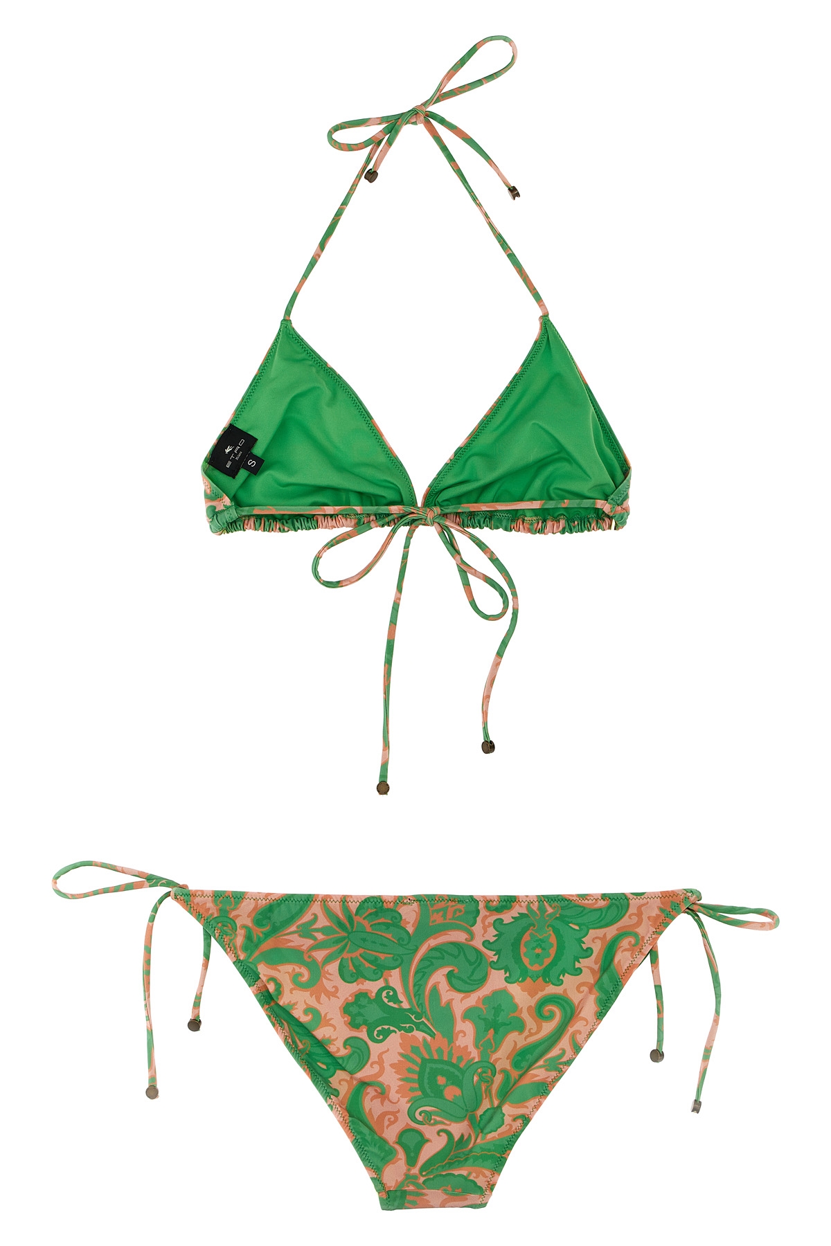 Paisley floral print stretch bikini, triangle top with adjustable laces, briefs with adjustable laces.