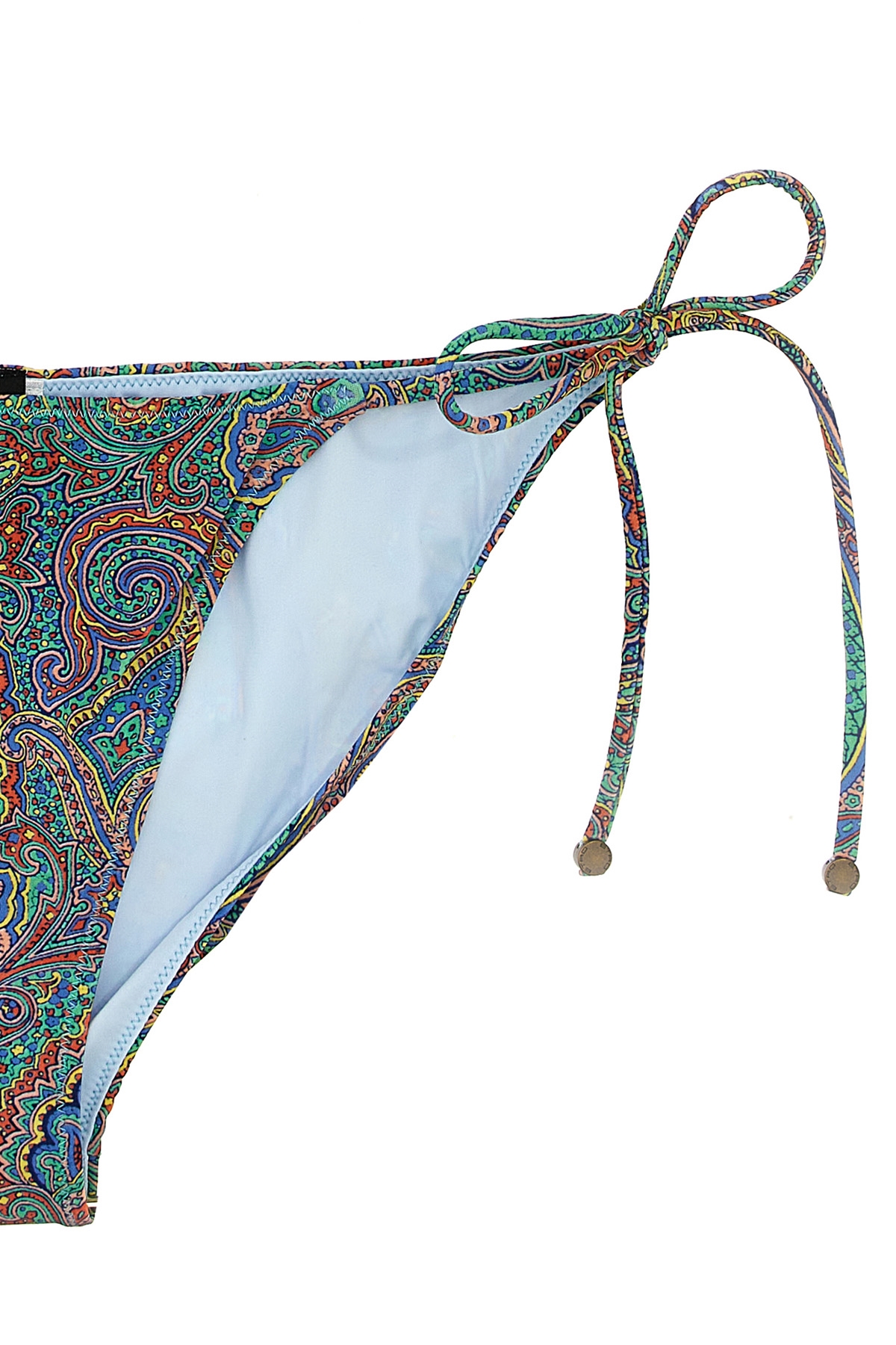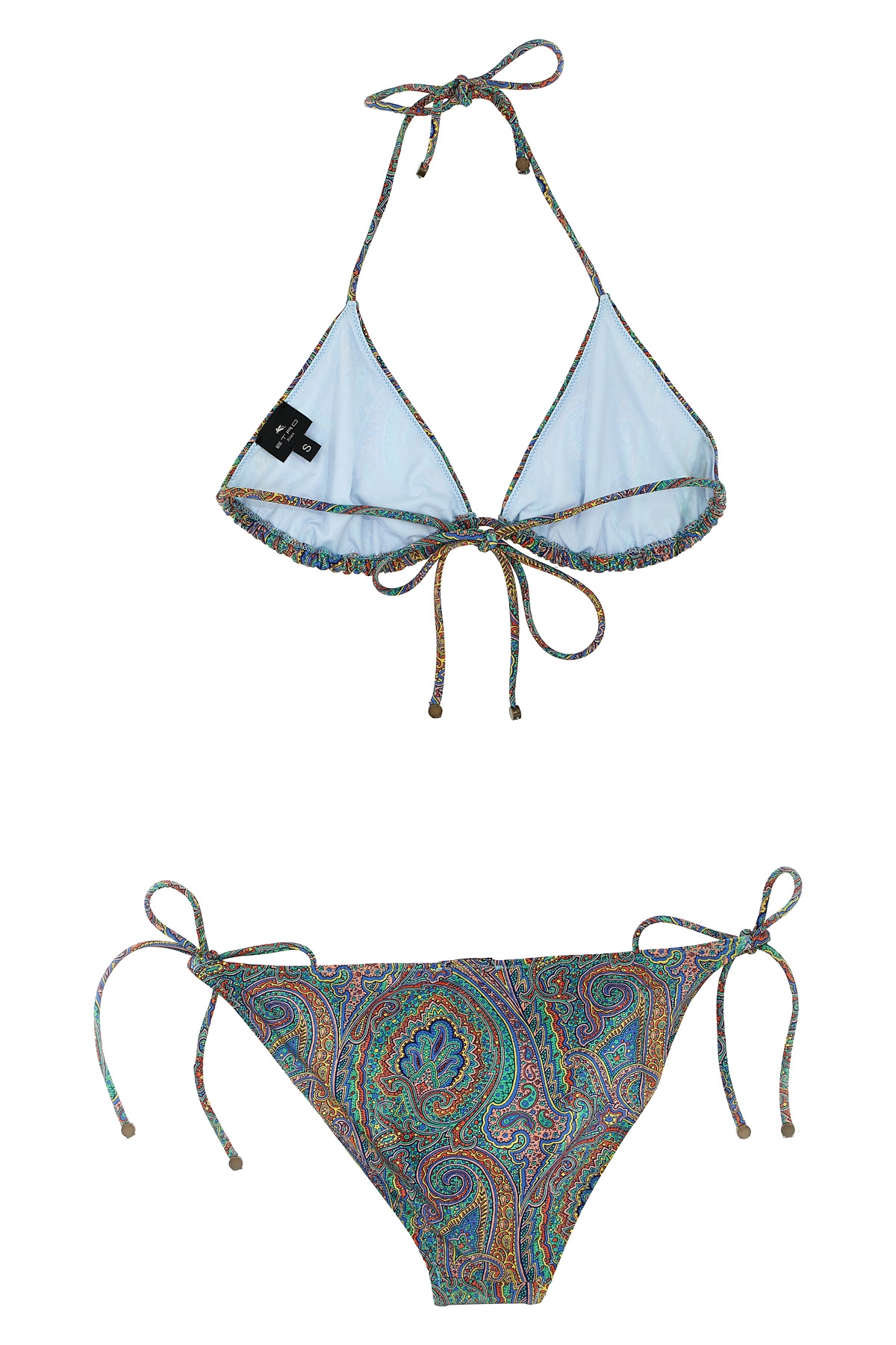 Paisley print stretch fabric bikini, triangle top with adjustable laces, briefs with adjustable laces.