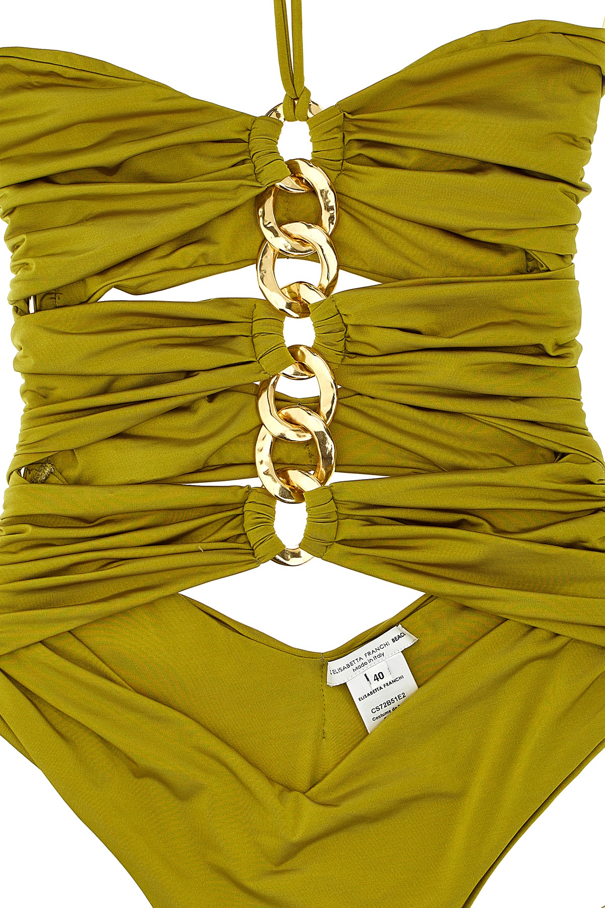 Shiny Lycra one-piece swimsuit, cut out details on the front and back, front chain, lacing around the neck.