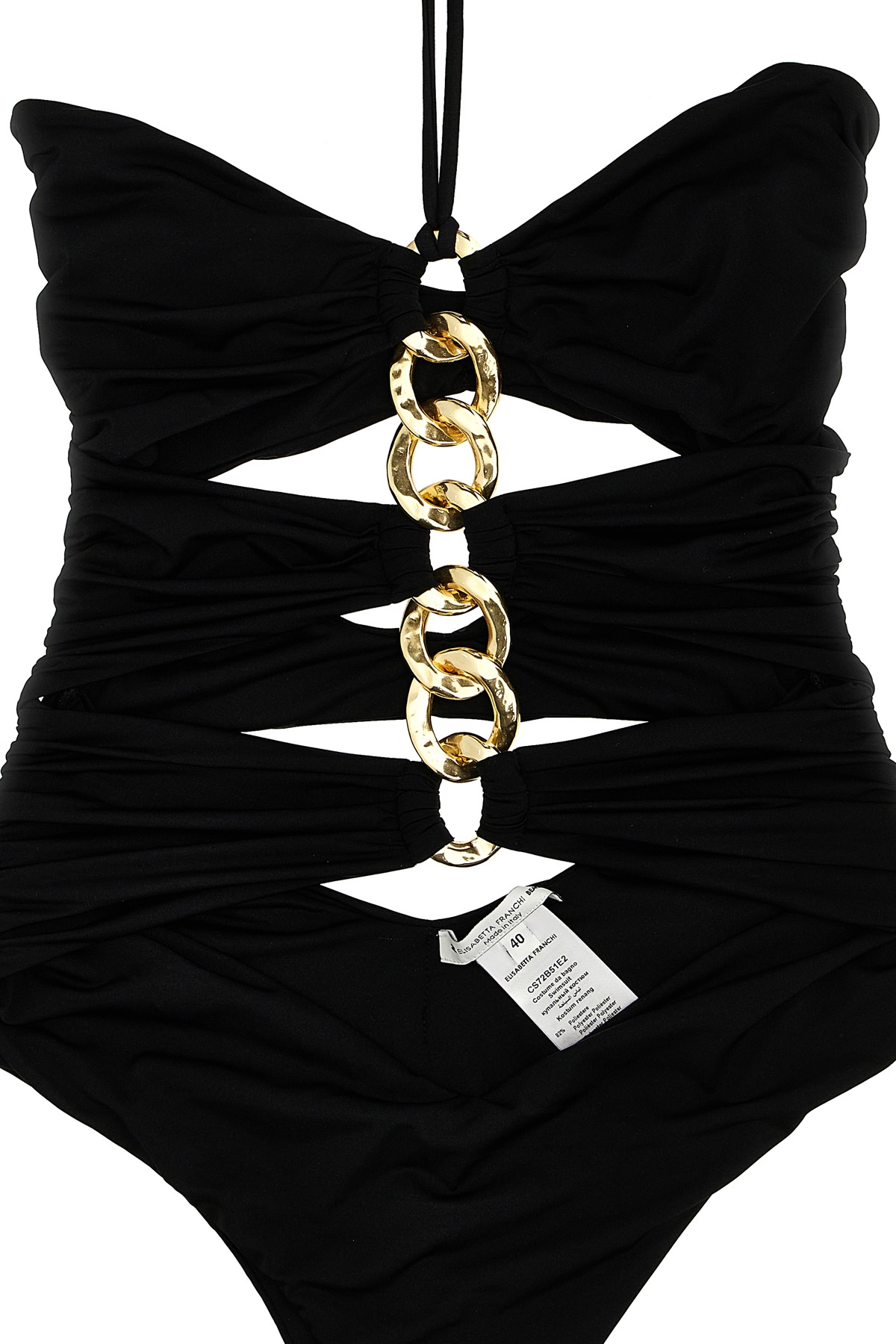 Shiny Lycra one-piece swimsuit, cut out details on the front and back, front chain, lacing around the neck.