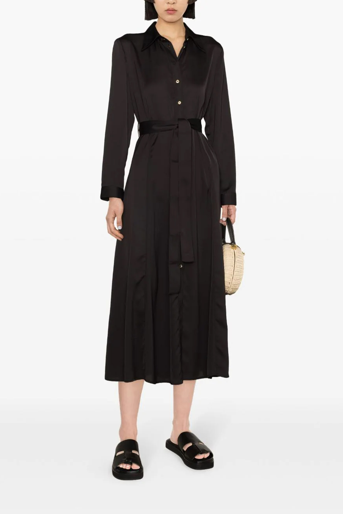 'Amimone' satin shirt dress with front button closure, long cuffed sleeves.