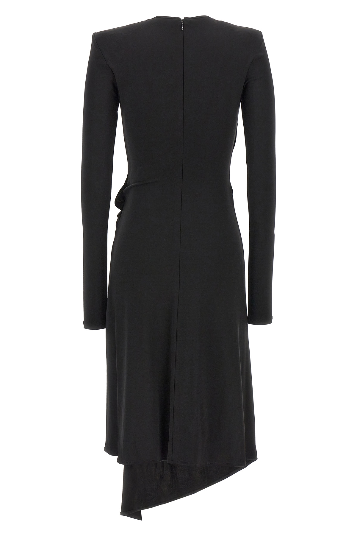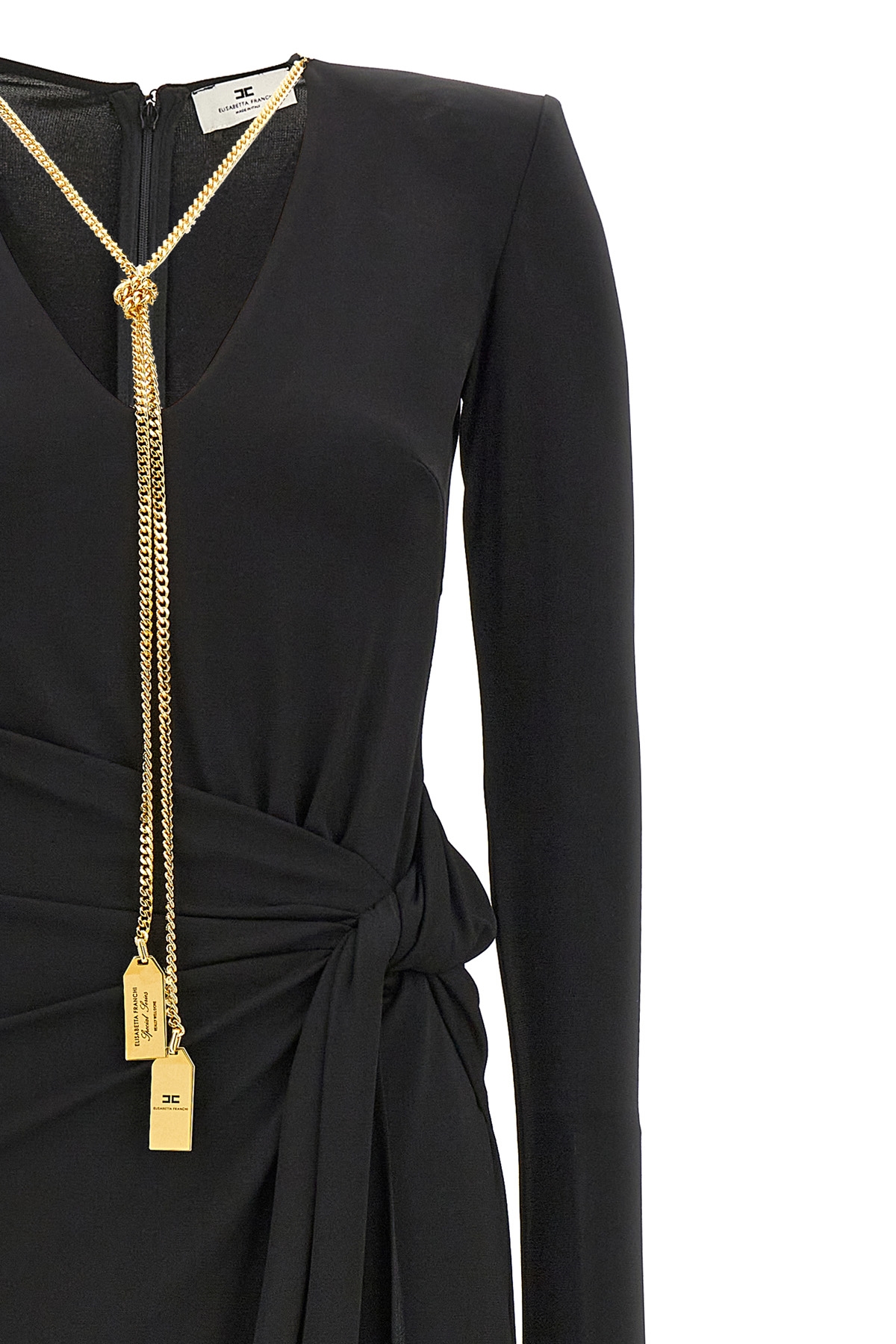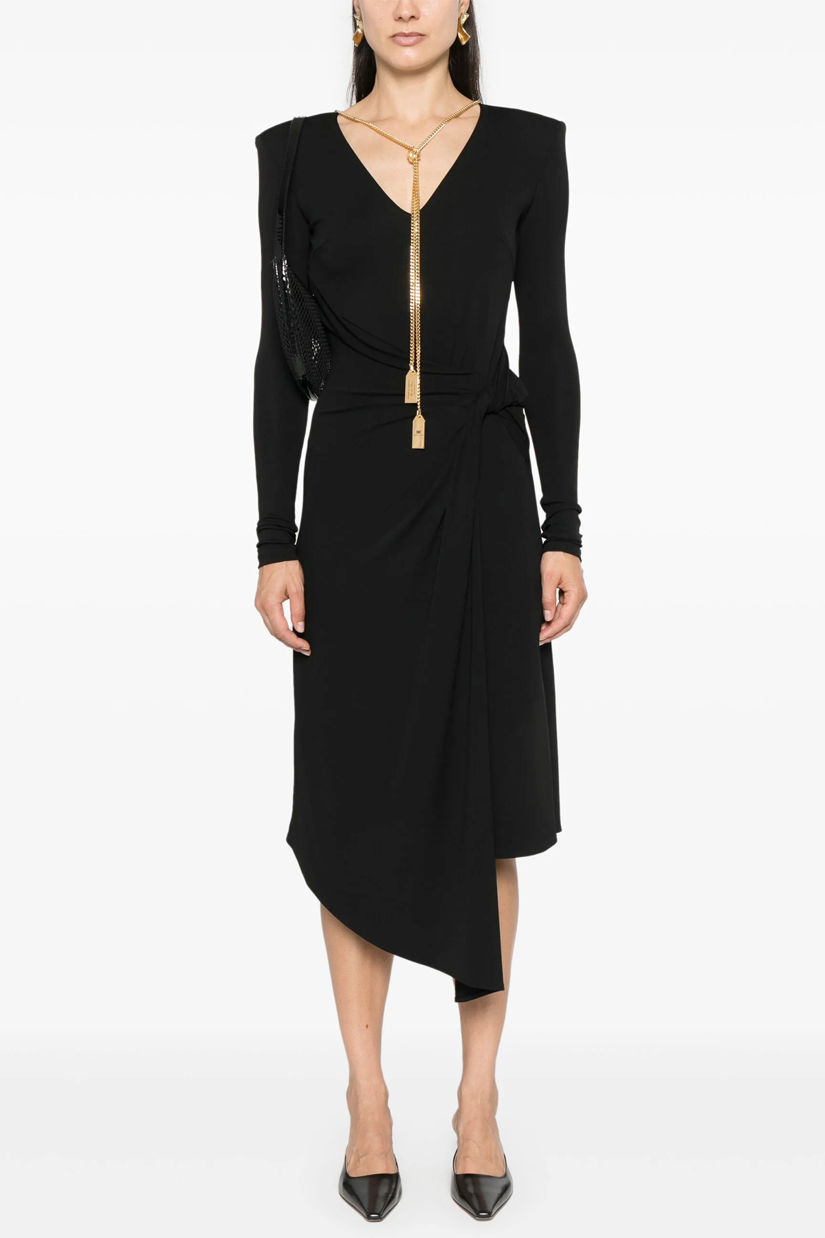 Viscose midi dress, asymmetrical, front knot detail, V-neck, back zip closure, chain detail with removable logo.