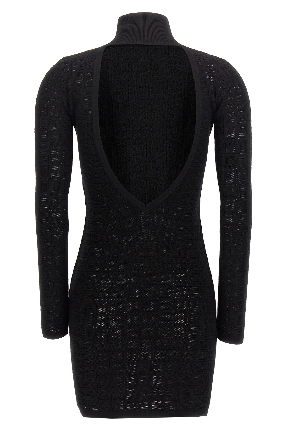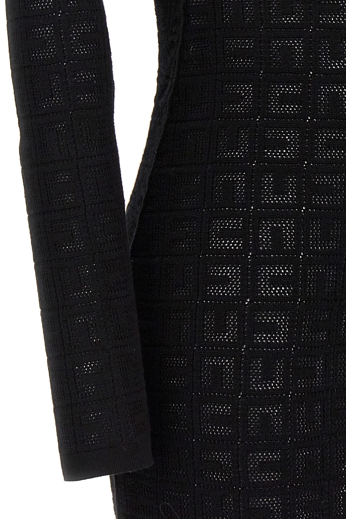 Viscose blend knit dress with all-over openwork logo pattern, high neck, long sleeves.