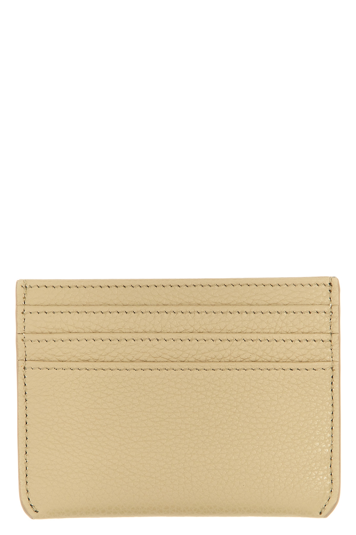 Hammered leather card holder with front lettering logo and contrast stitching.