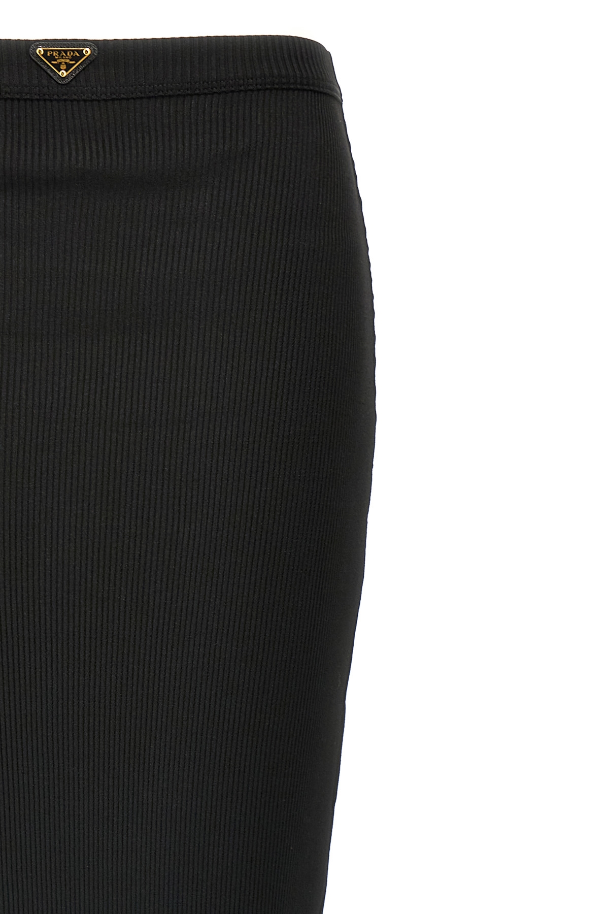 Stretch ribbed jersey midi skirt, front enameled metal triangle logo, pencil pattern, elastic waistband.