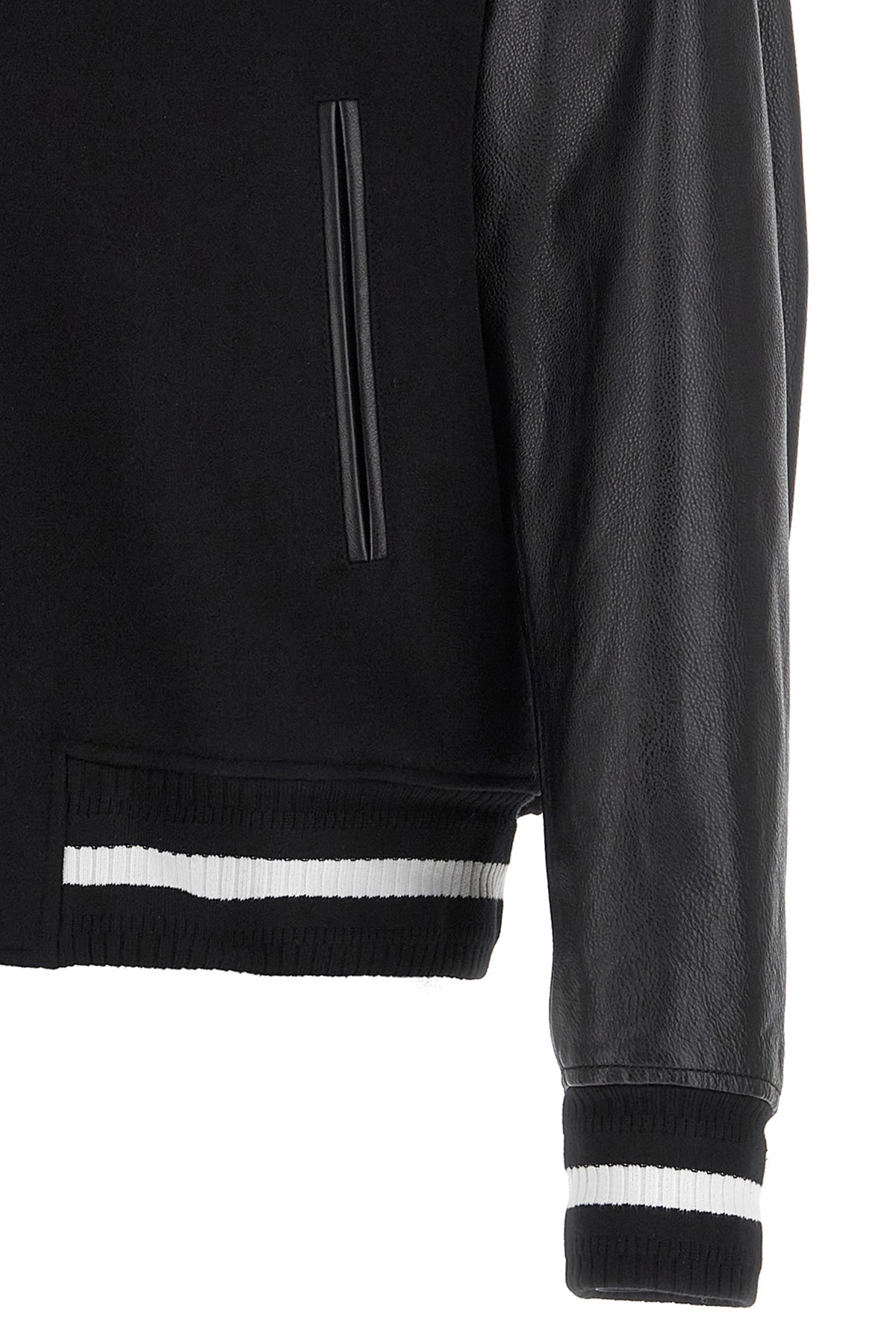 'Varsity' wool bomber jacket with leather sleeves. Front logo patch, knit edging and cuffs.