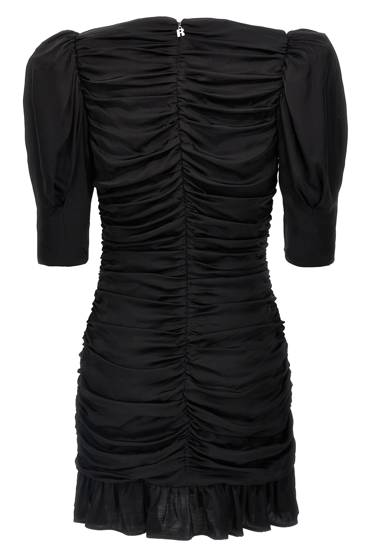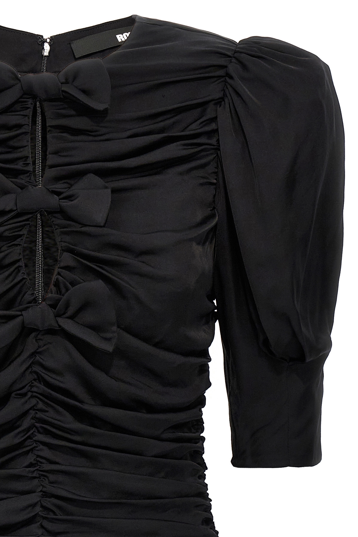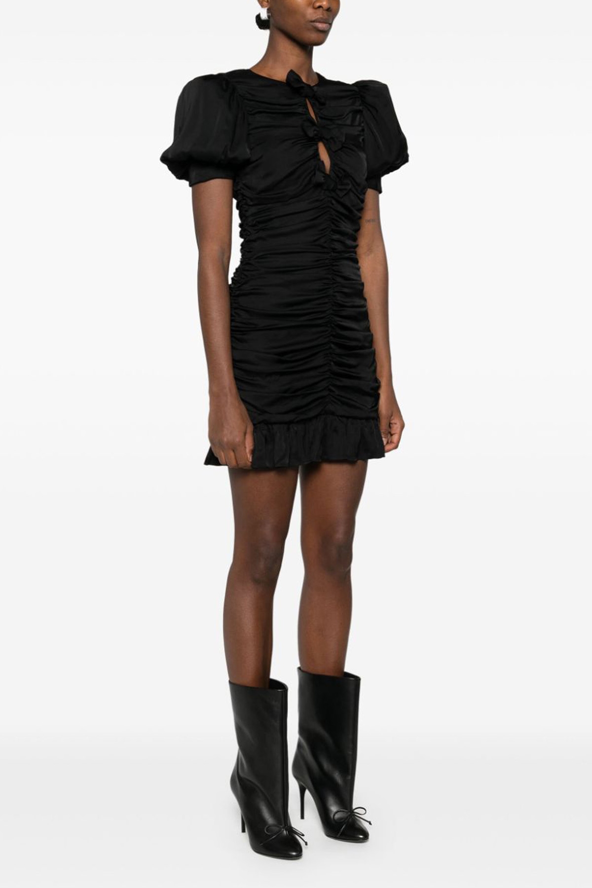'Satin Mini Ruffle' satin dress, crew neck, front bows with cut-out details, short puff sleeves, ruffles on the hem, back zip closure.