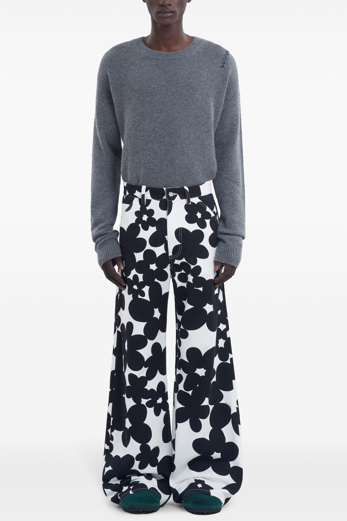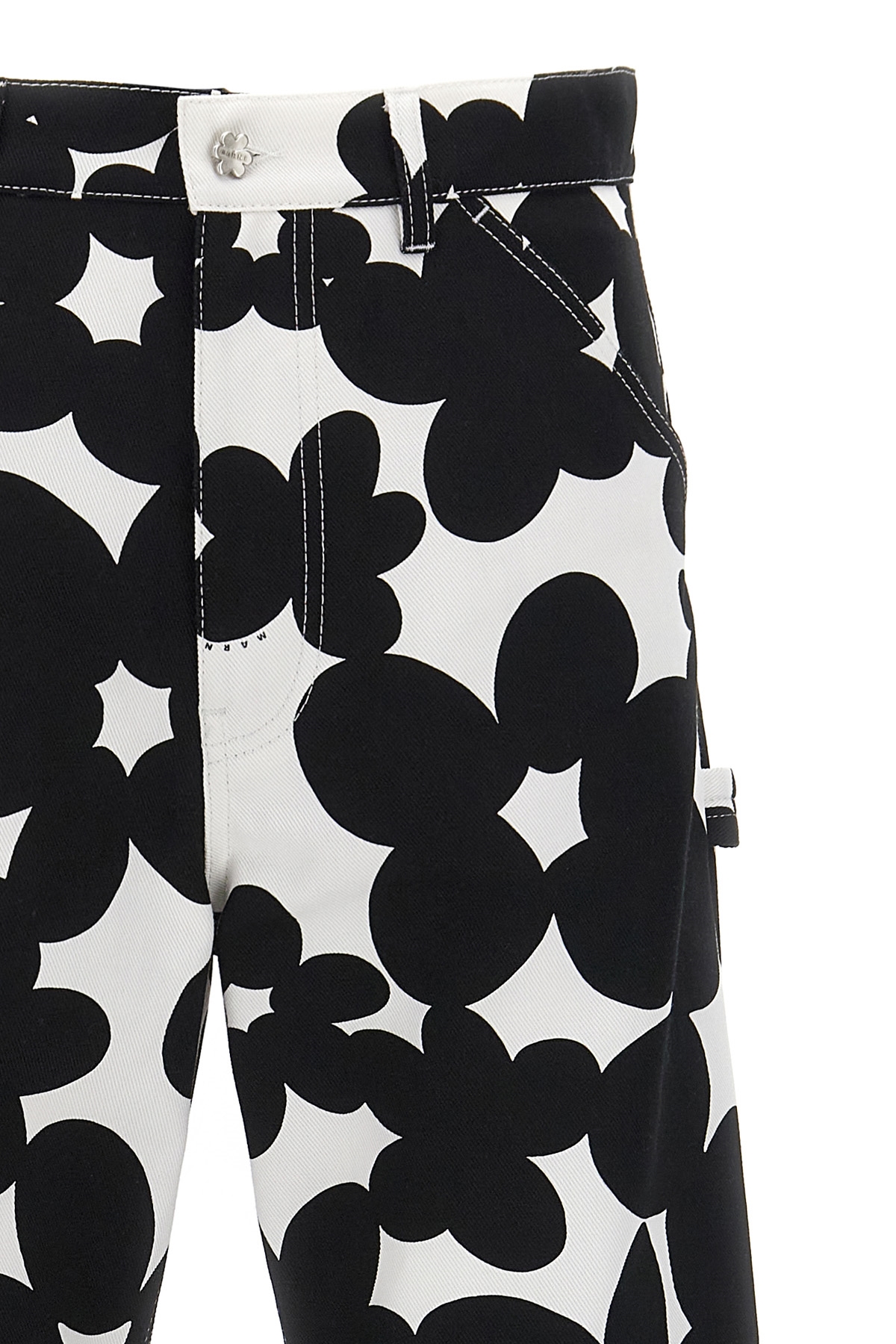 Dillies' cotton gabardine pants with all-over 'Dillies' print, cargo style with flared, wide leg, five pockets, zip and button closure.