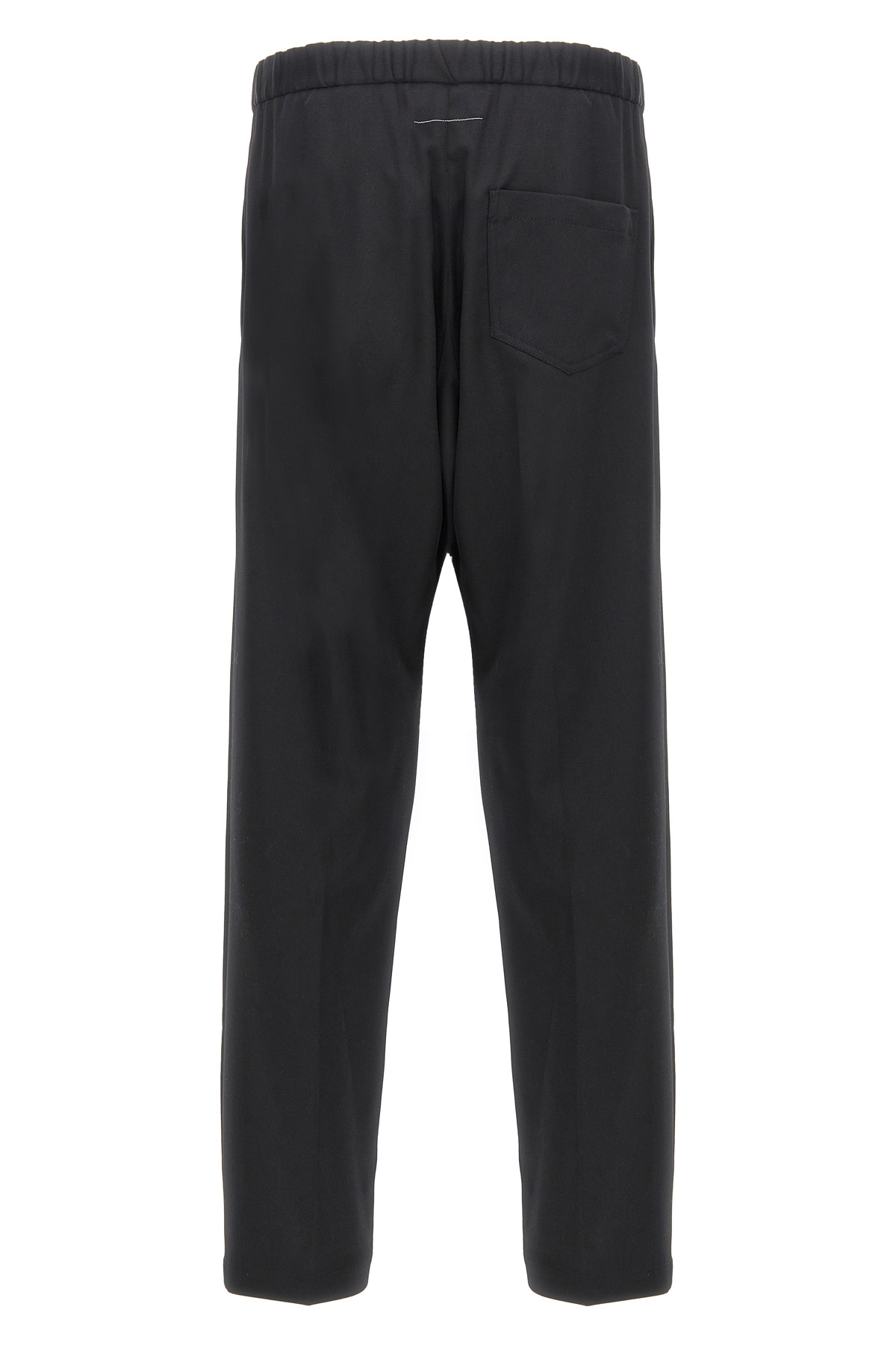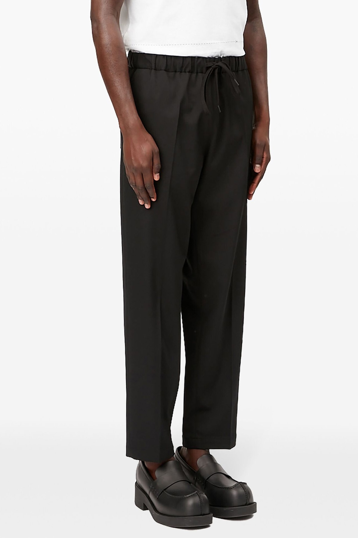 Wool blend trousers, straight leg with stretched pleat, adjustable drawstring elastic at the waist, pockets, back 'White stitch line'.