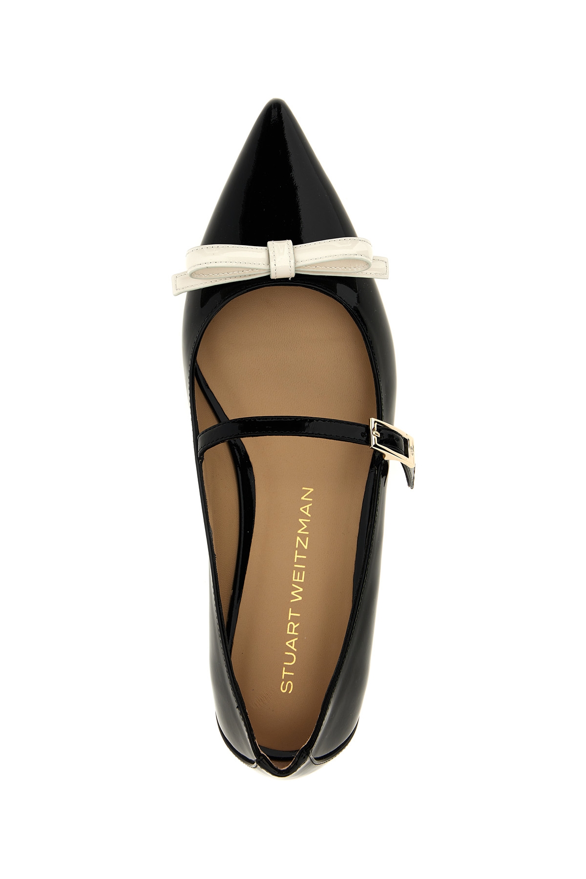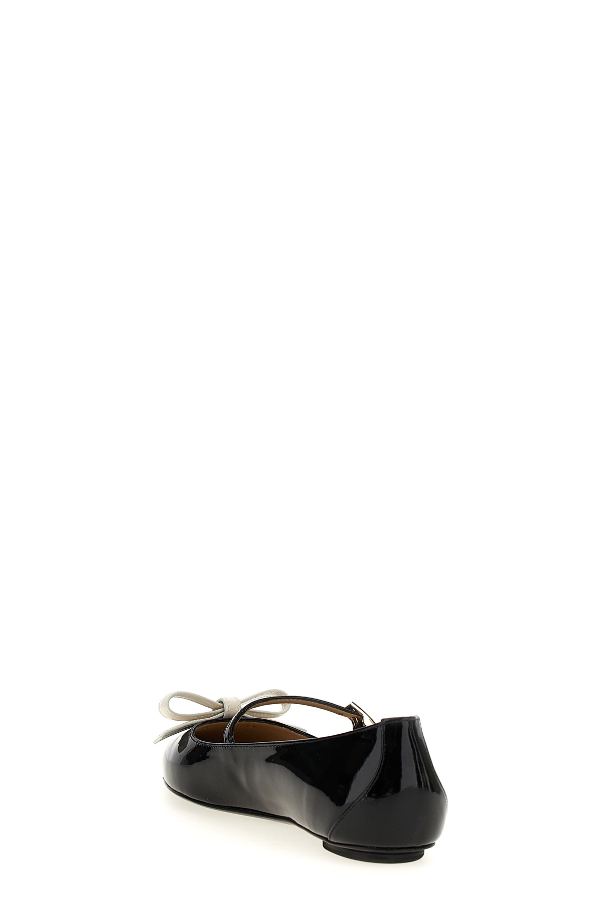'Felicity' patent leather ballet flats, pointed toe with contrasting bow decoration, adjustable strap, leather sole.