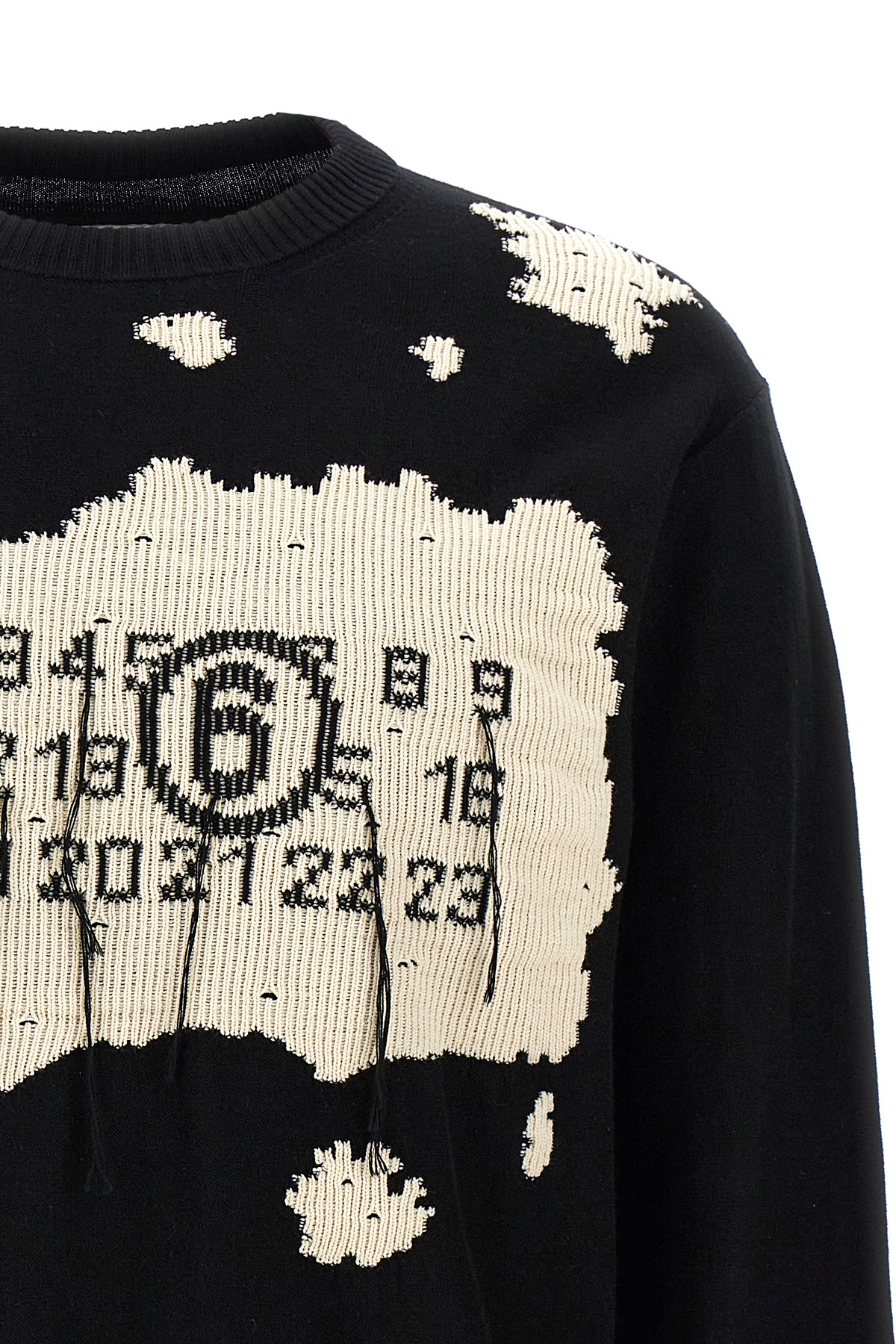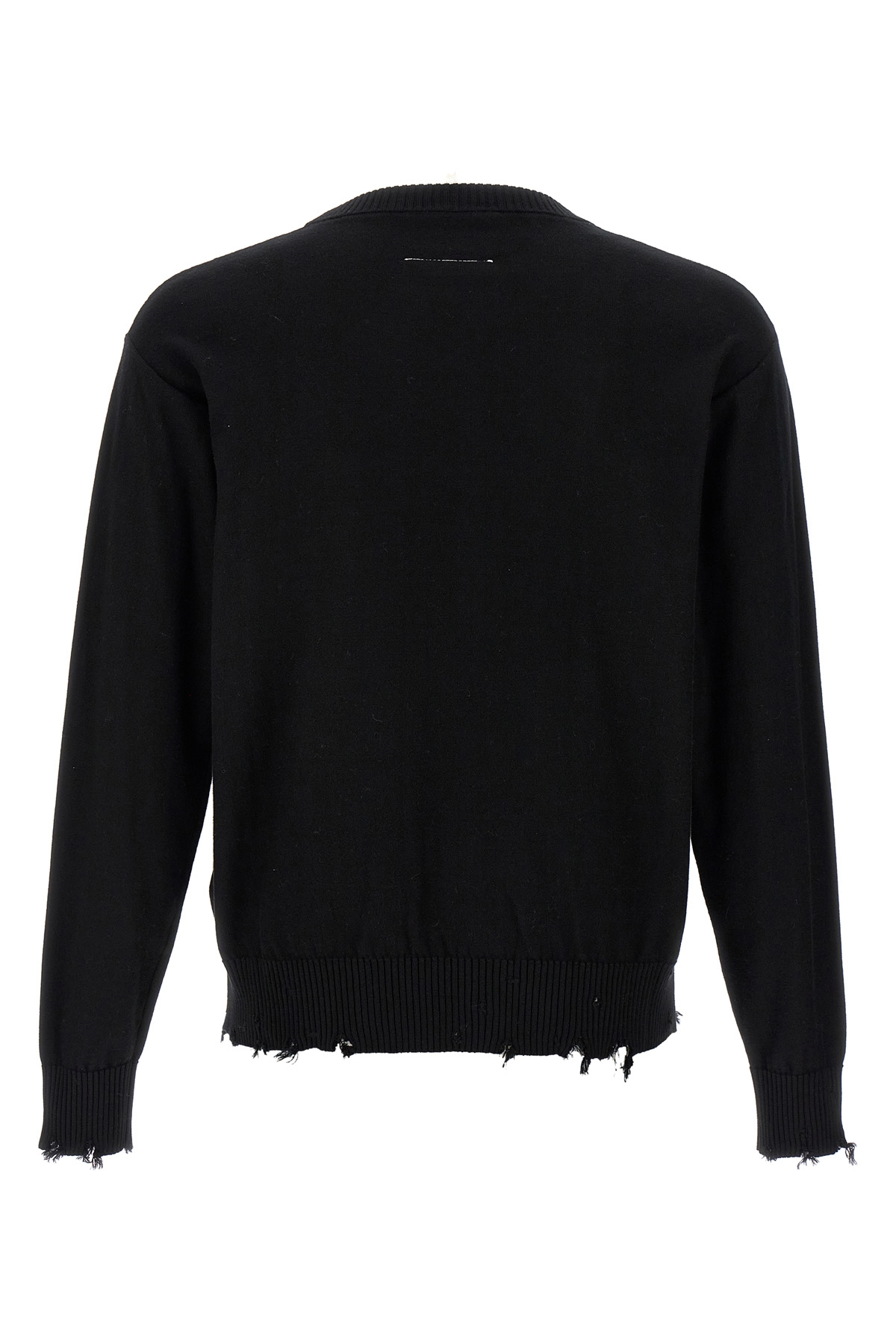 Cotton crewneck sweater with front knitted logo intarsia with used-effect fringes, edges and cuffs.