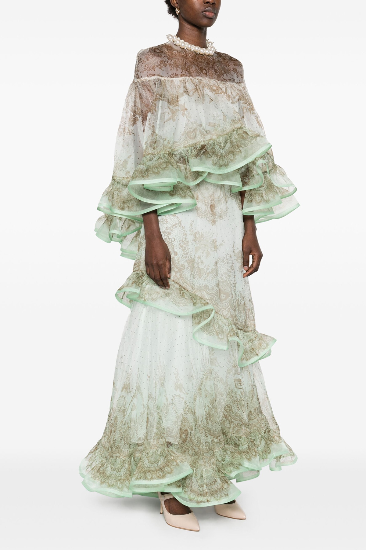 'Crush Embellished' linen and silk organza blouse with lace print I don't see, crew neck with pearls and crystals, ruffle sleeves, crinoline on the hem, back button closure with cut-out detail,