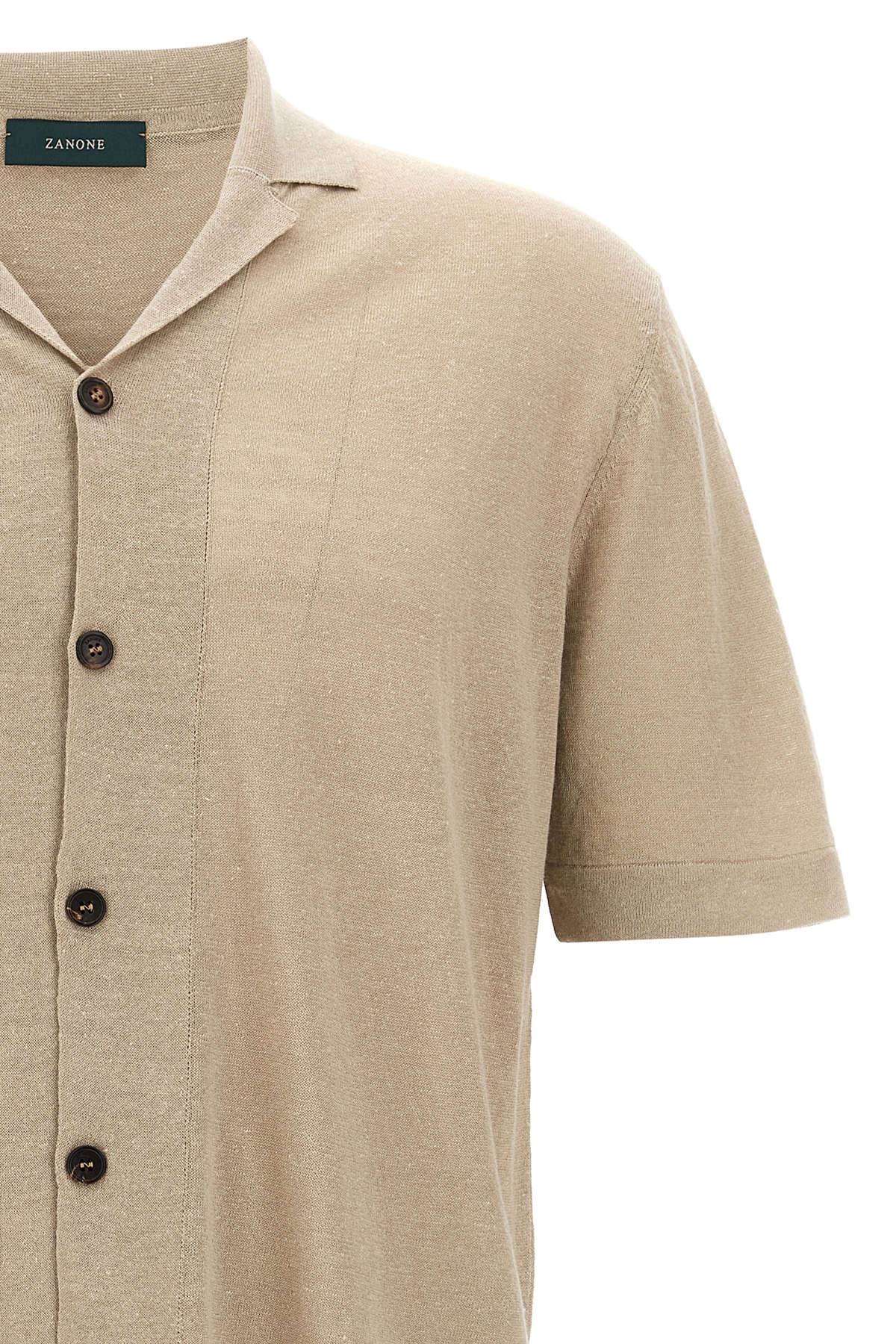 Linen blend jersey shirt with lapel neckline, button closure, short sleeves.