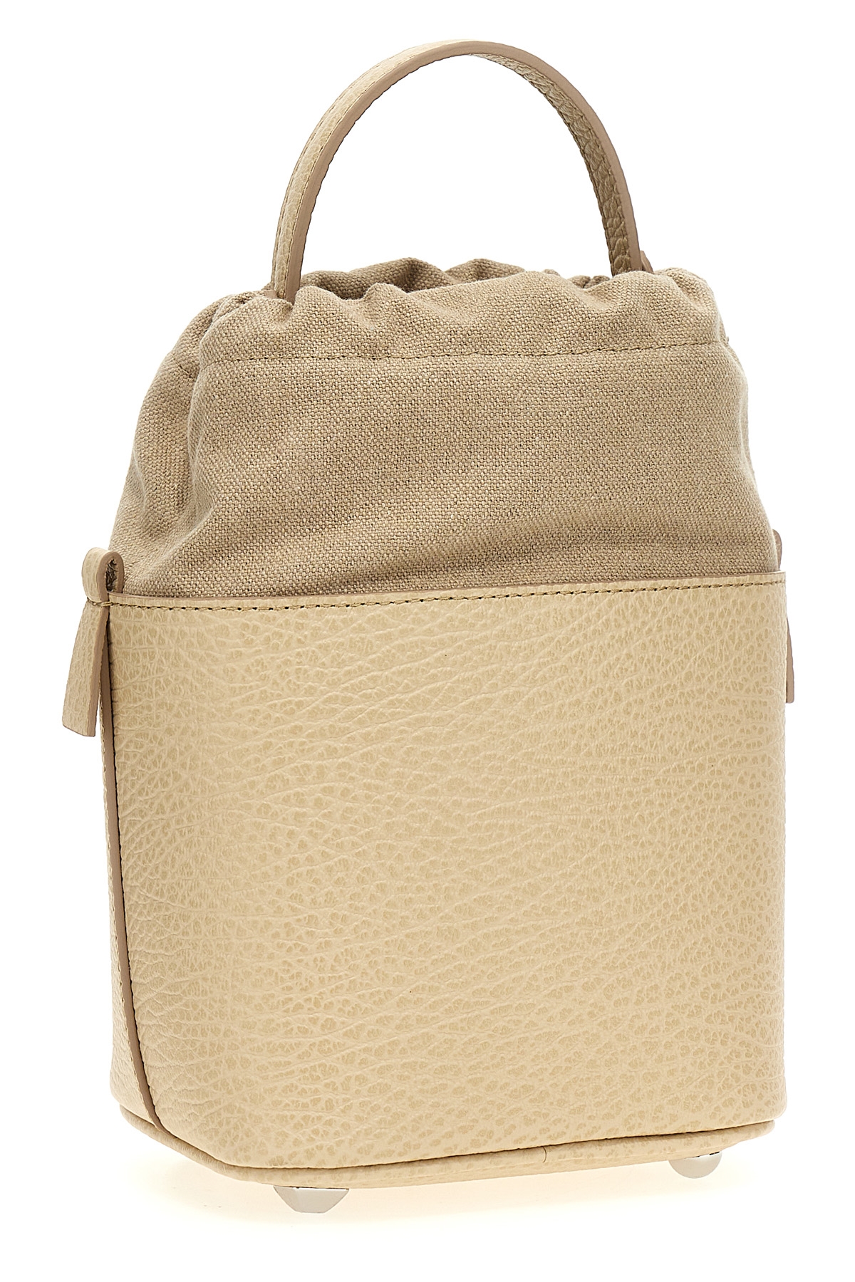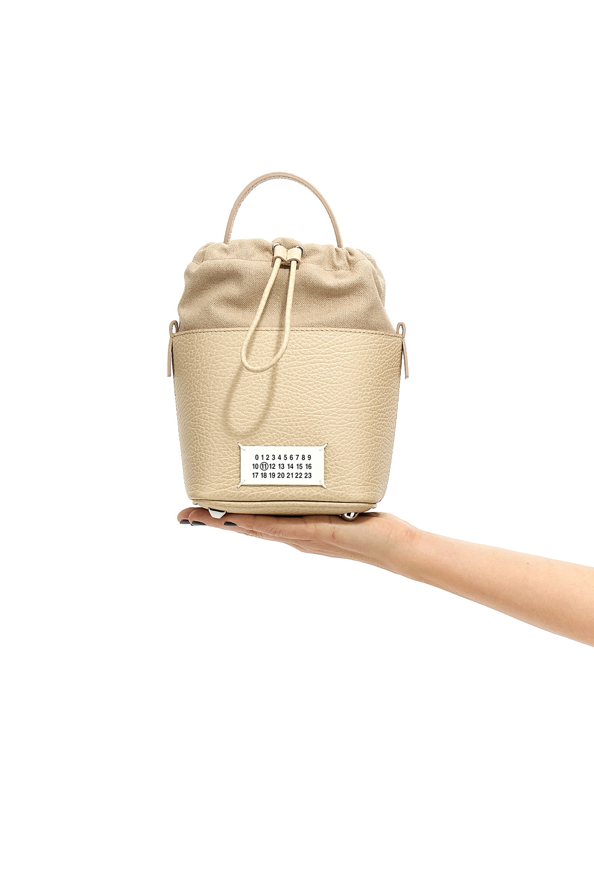 5AC' leather bucket bag with contrast drawstring closure and logo, can be worn over the shoulder, which is removable.