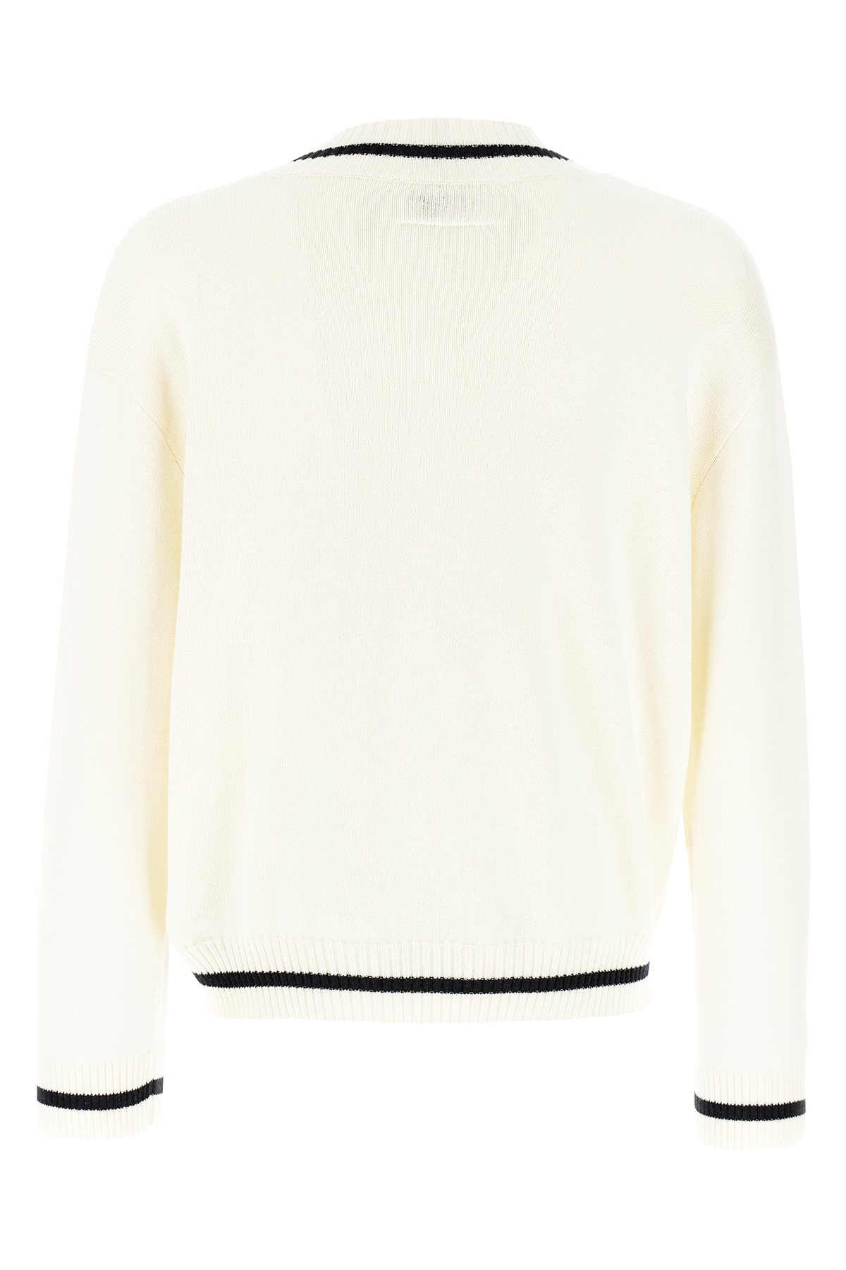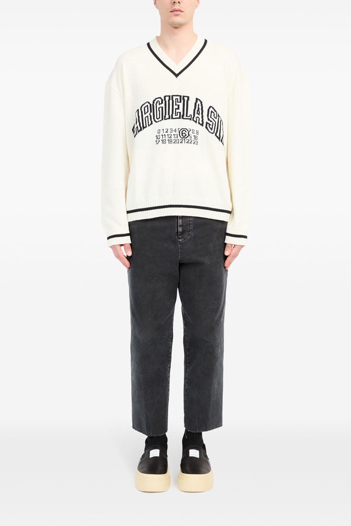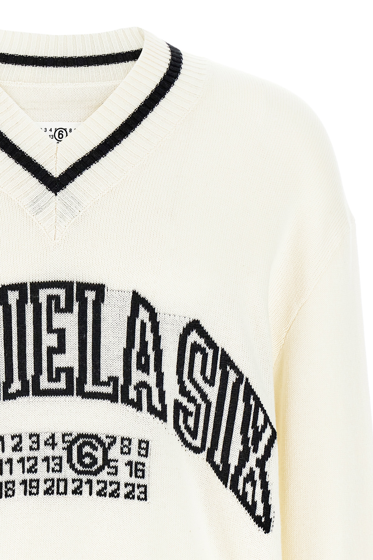 Cotton blend sweater with V-neck, front logo, long cuffed sleeves.