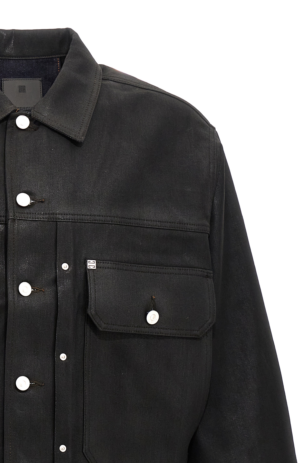Coated cotton denim jacket, pockets, button closure, long cuffed sleeves.