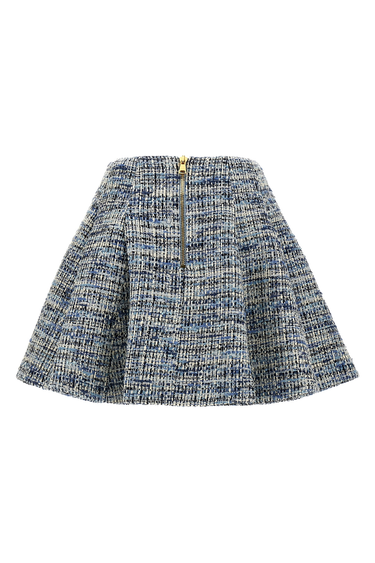 High-waisted flared pleated mini skirt in tweed, front 'Leone doppia catena' buttons, back zip closure, and serge lining.