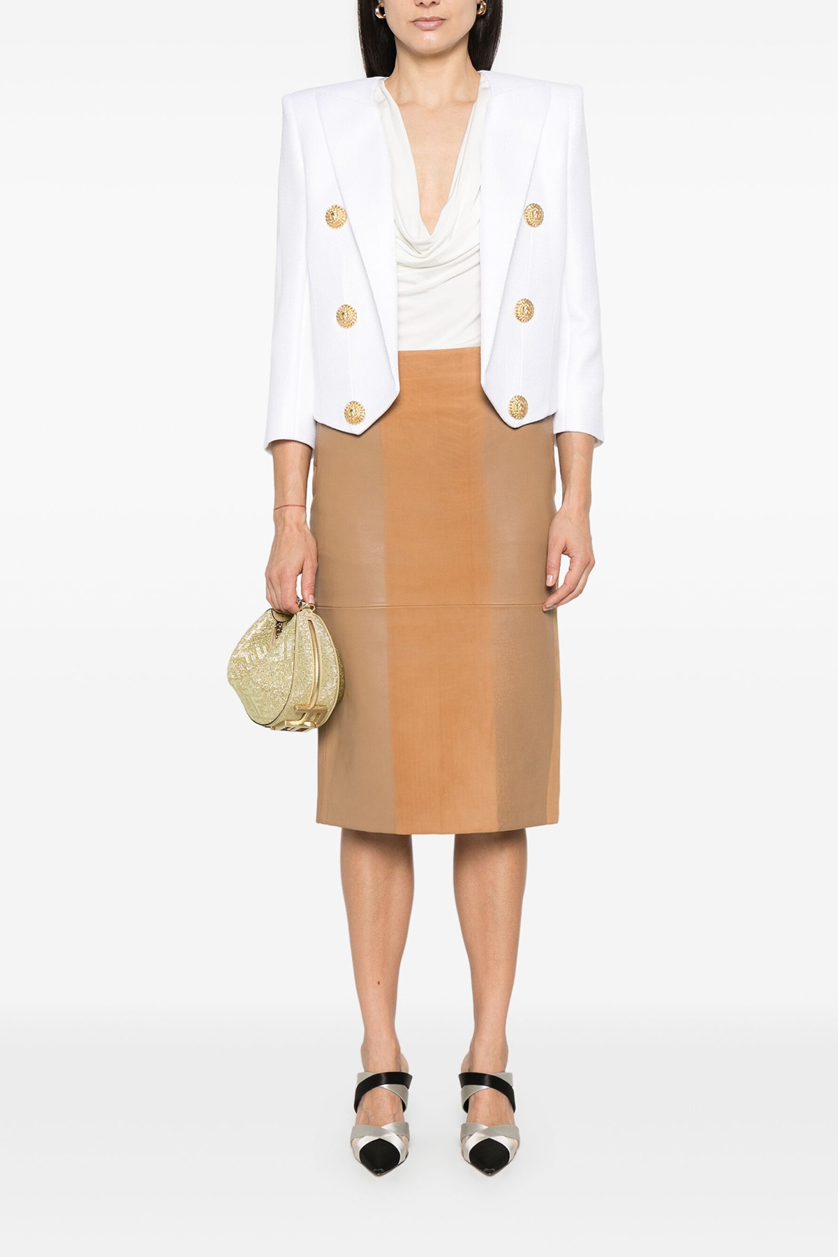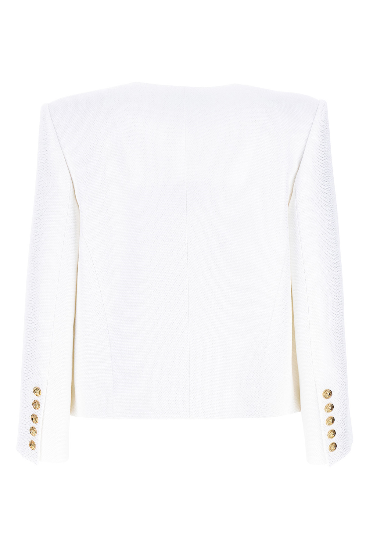 Viscose blazer with 'Leone doppia catena' logo buttons, round neckline with cut-out Italian tailored collar, Spencer style peak lapels, padded structured shoulders, 3/4 sleeves.