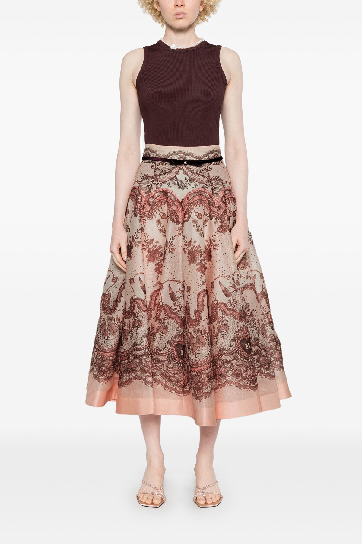 'Crush Flared Midi' high waisted skirt in silk organza and linen with crinoline on the hem, pockets, back zip closure, velvet belt with crystals and removable bow.