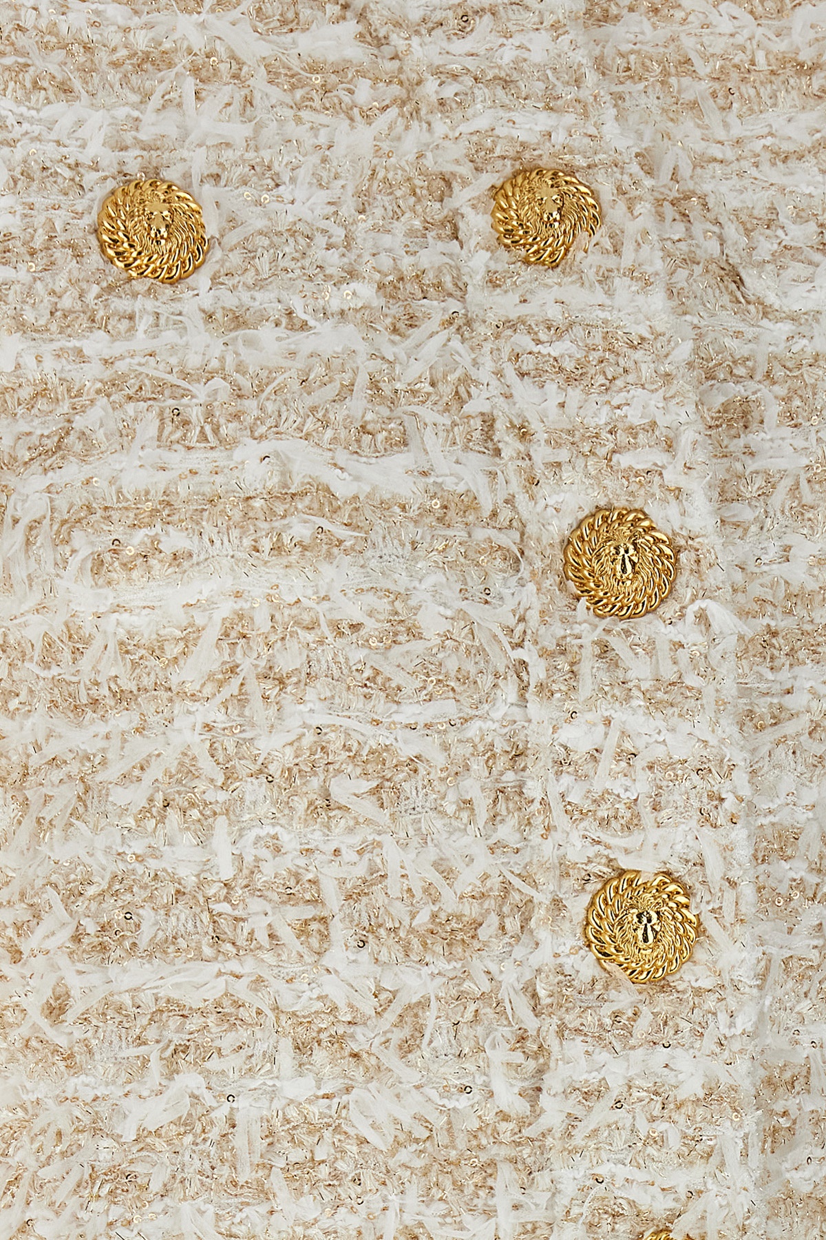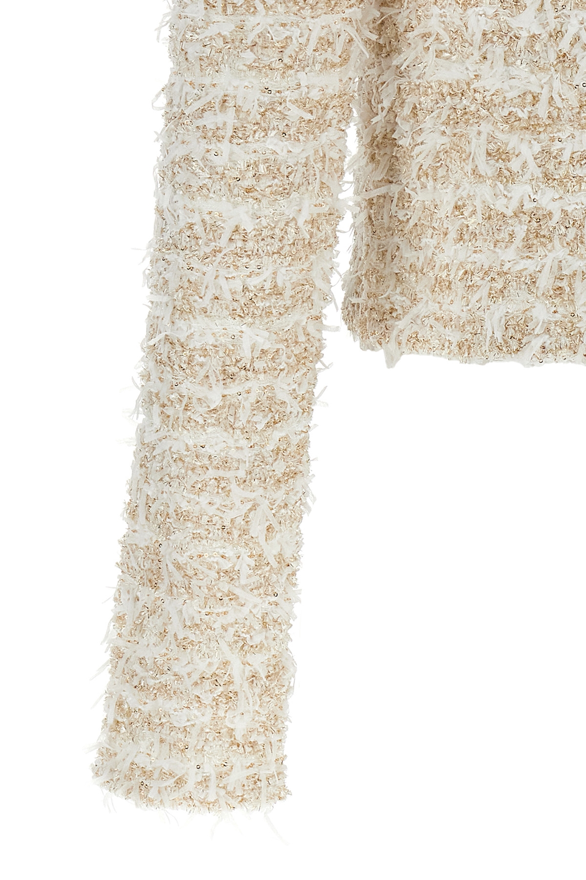 Tweed blazer with lurex threads and fringes, crop model, structured shoulder straps, 'Leone doppia catena' snap button closure, crew neck, trompe l'oeil pockets, long sleeves.