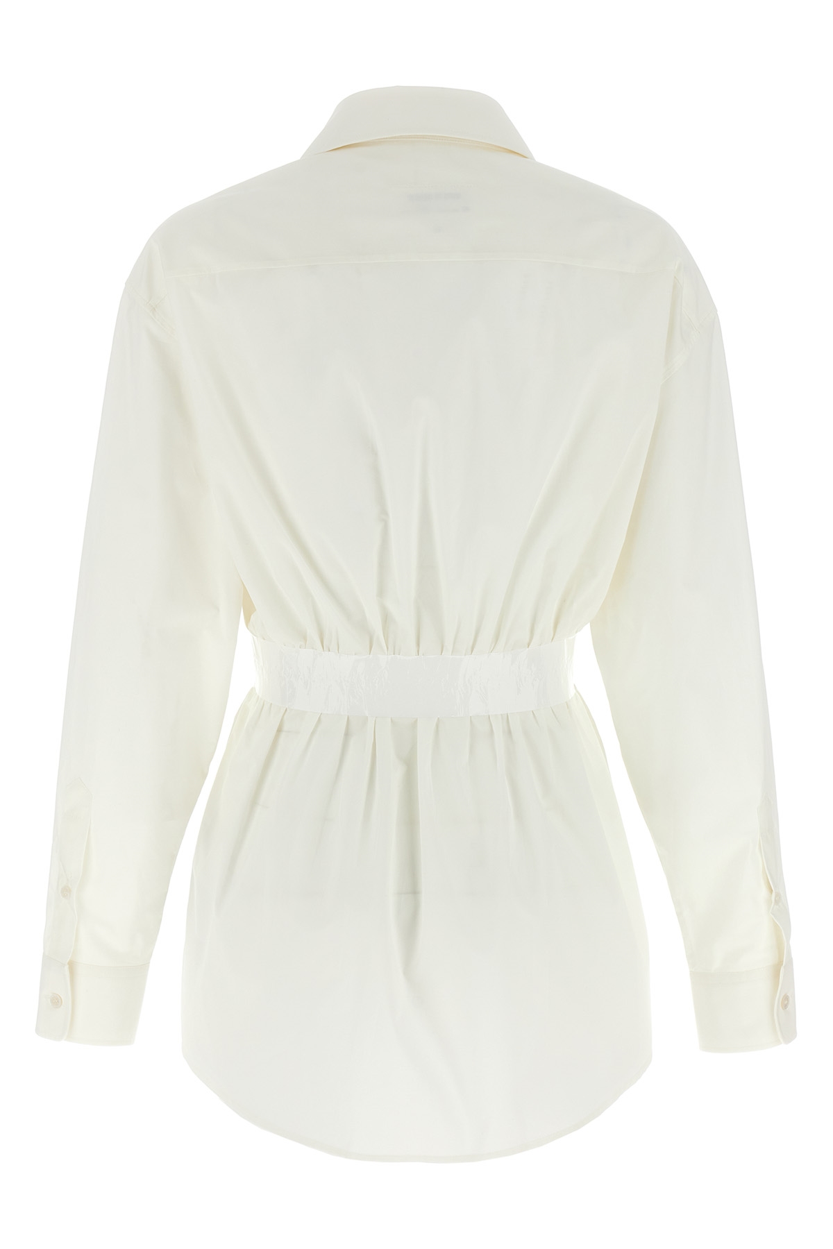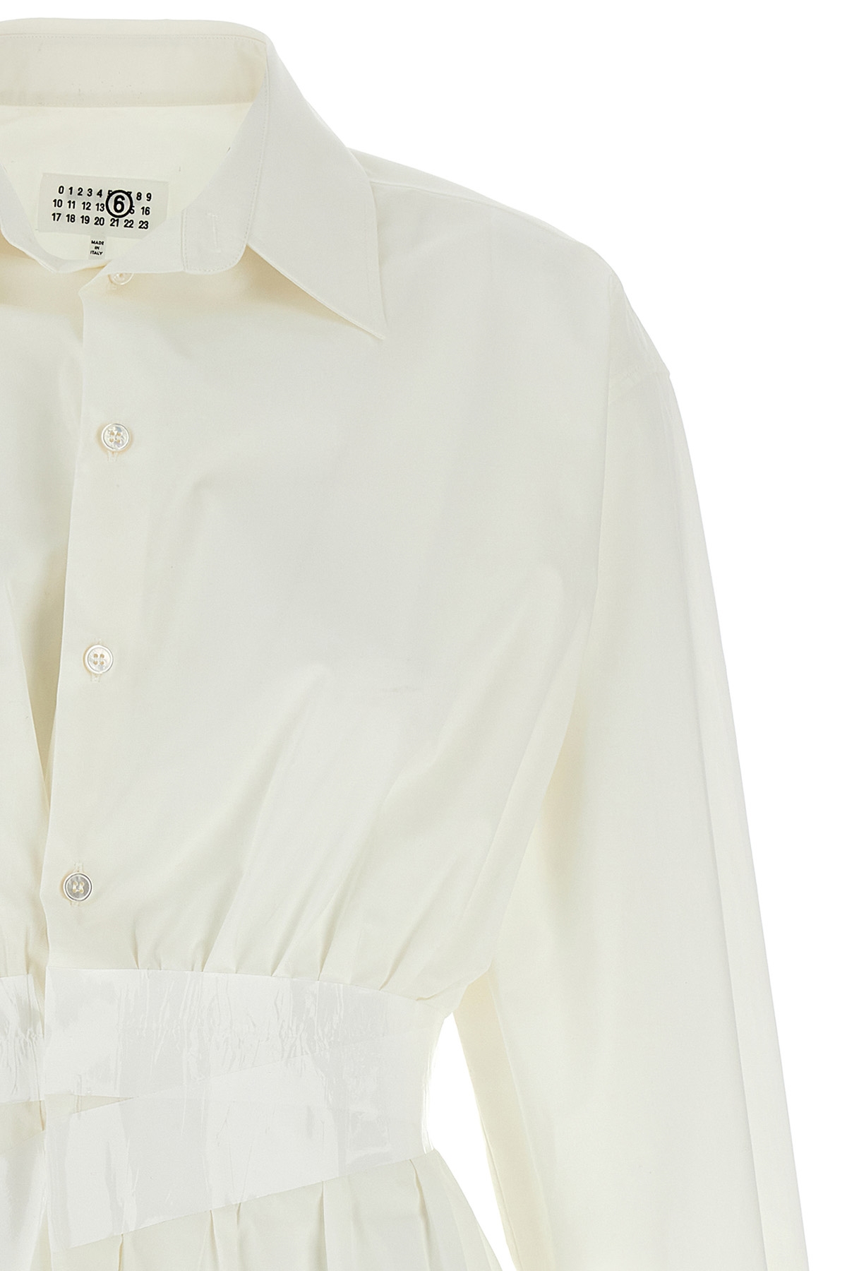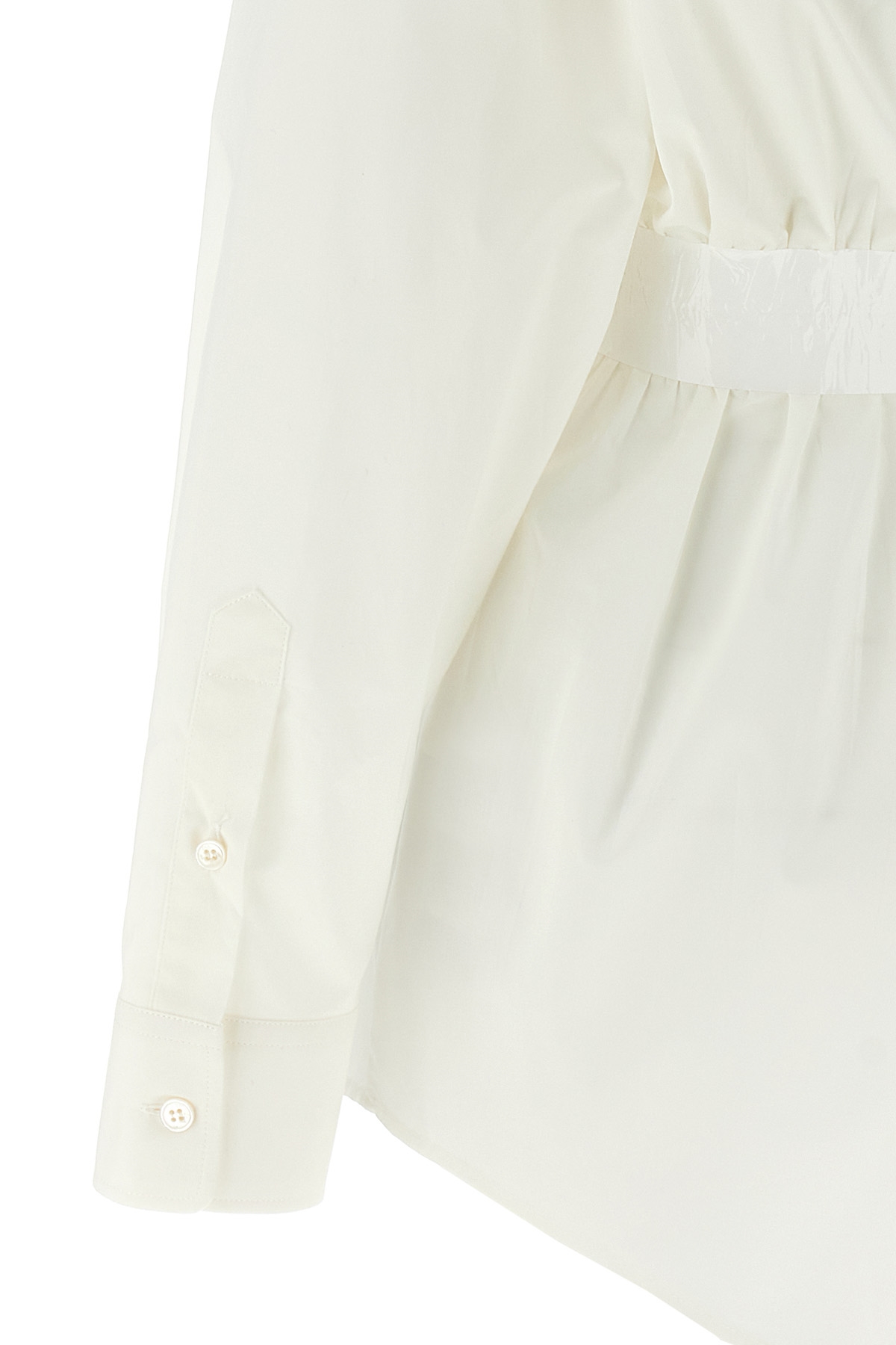 Cotton poplin shirt with taped details at the waist, button closure, long cuffed sleeves.