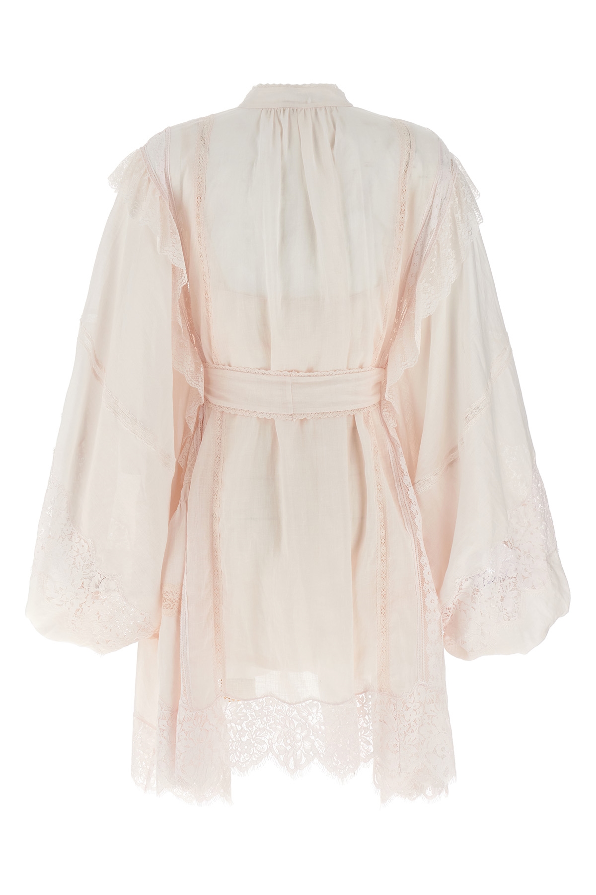 Crush Lace Billow' mini dress in ramie with lace inserts, kaftan style with elastic and sash at the waist, jewel button closure, long wide sleeves with elastic cuffs, petticoat with thin adjustable straps.