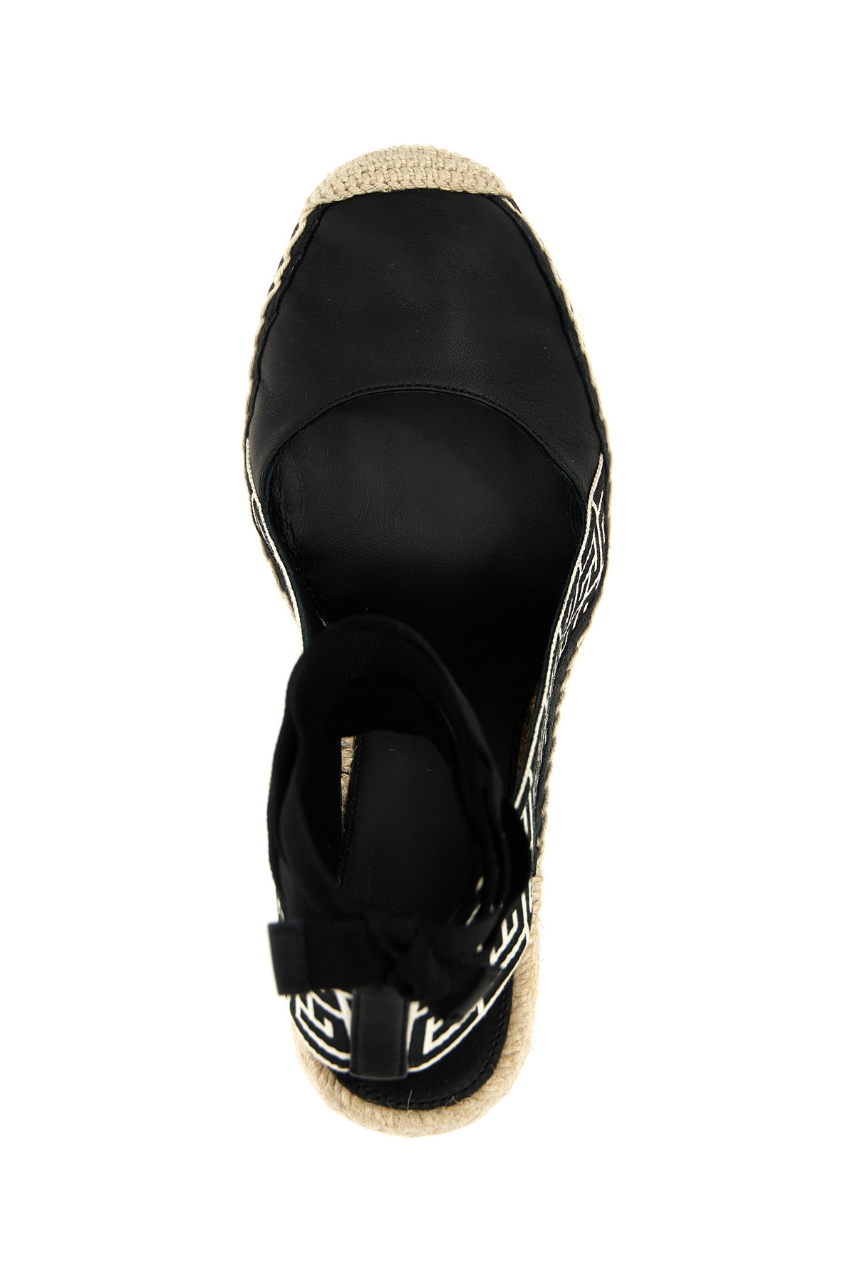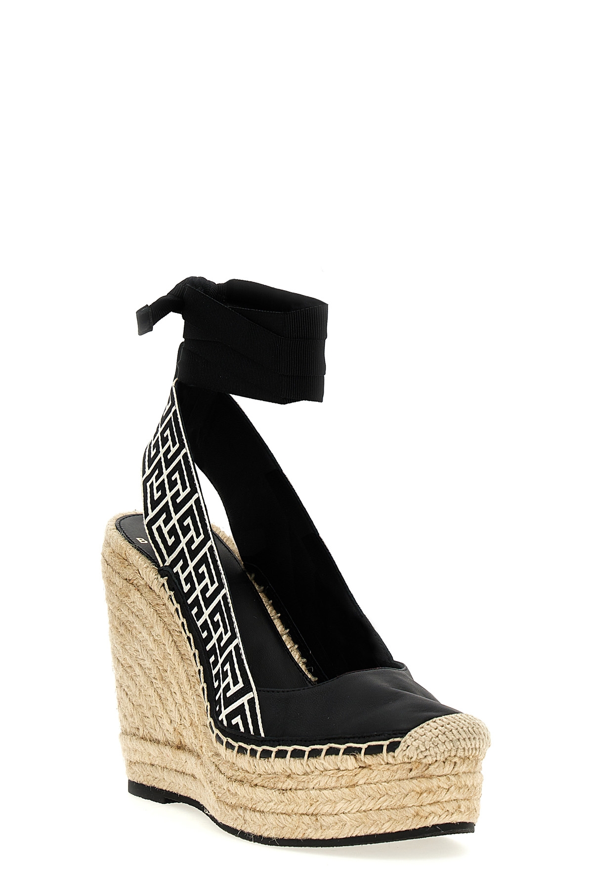 Alex' espadrilles in PB monogram jacquard fabric with leather toe, adjustable grosgrain strap at the ankle, and woven rope wedge sole.