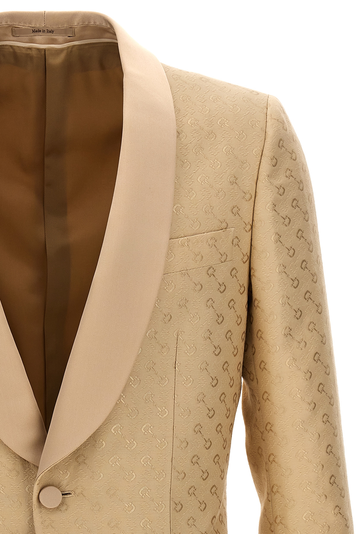 Wool and silk blend blazer with all-over jacquard clamps, single-breasted model fully lined with shawl lapels and flap pockets.