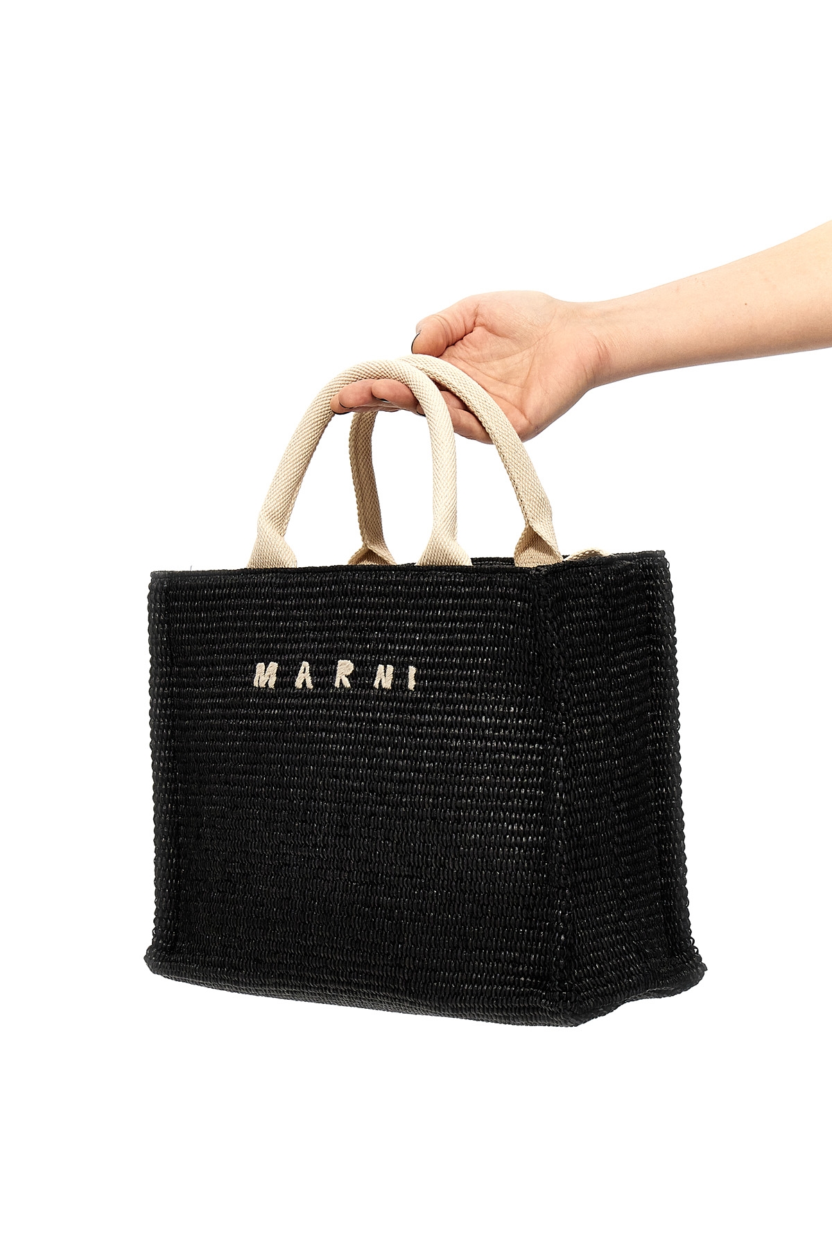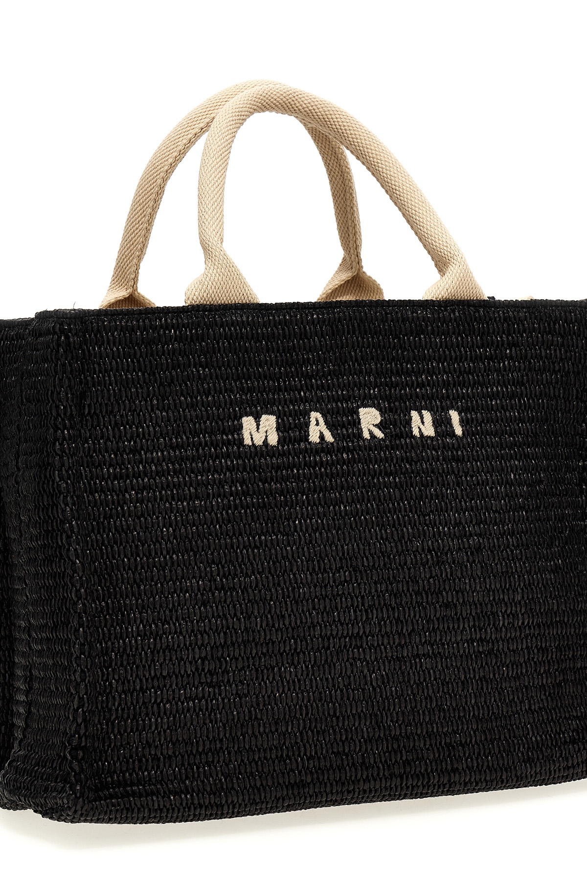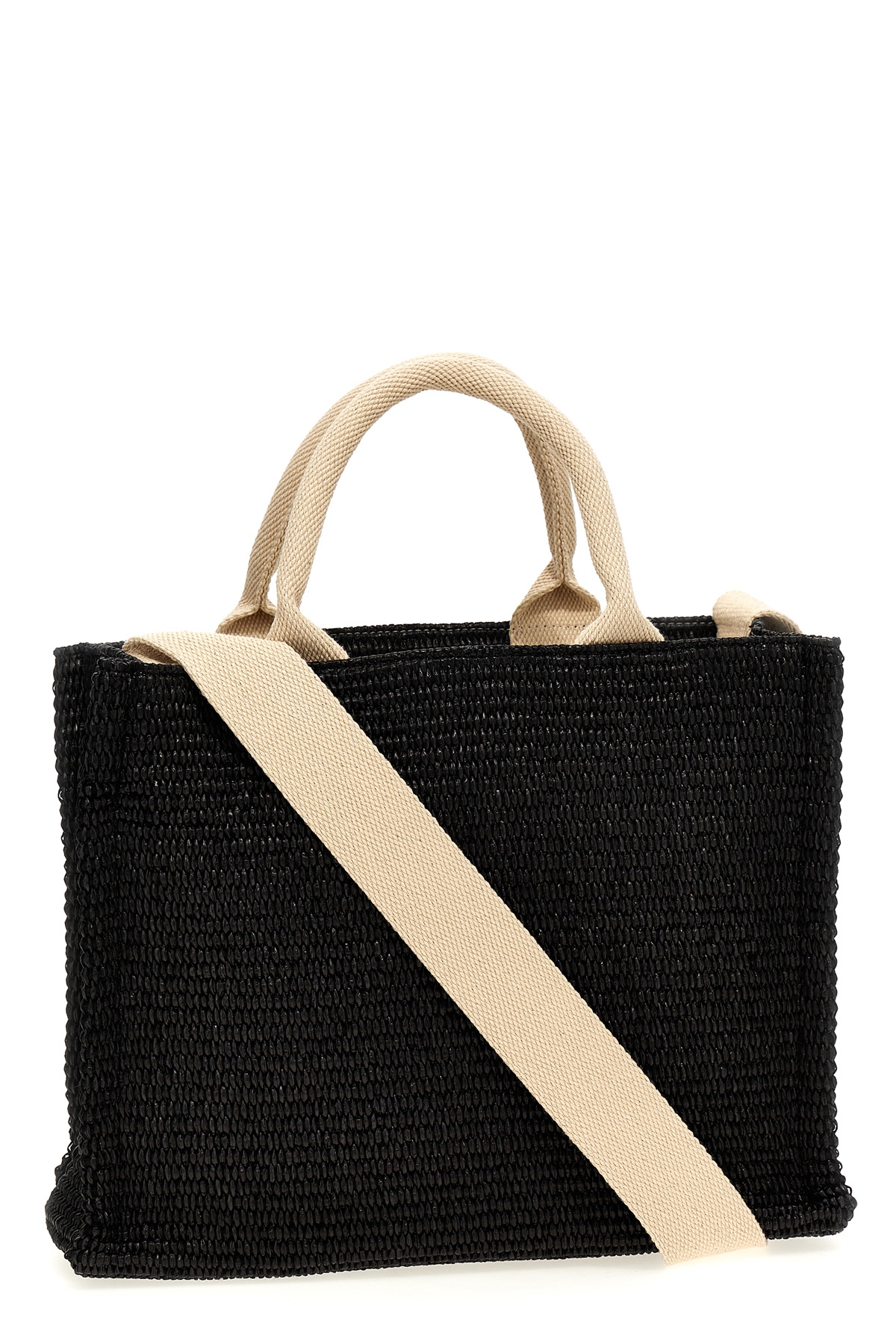 'Mini Tote' raffia shopping bag with double canvas handle and front logo embroidery.