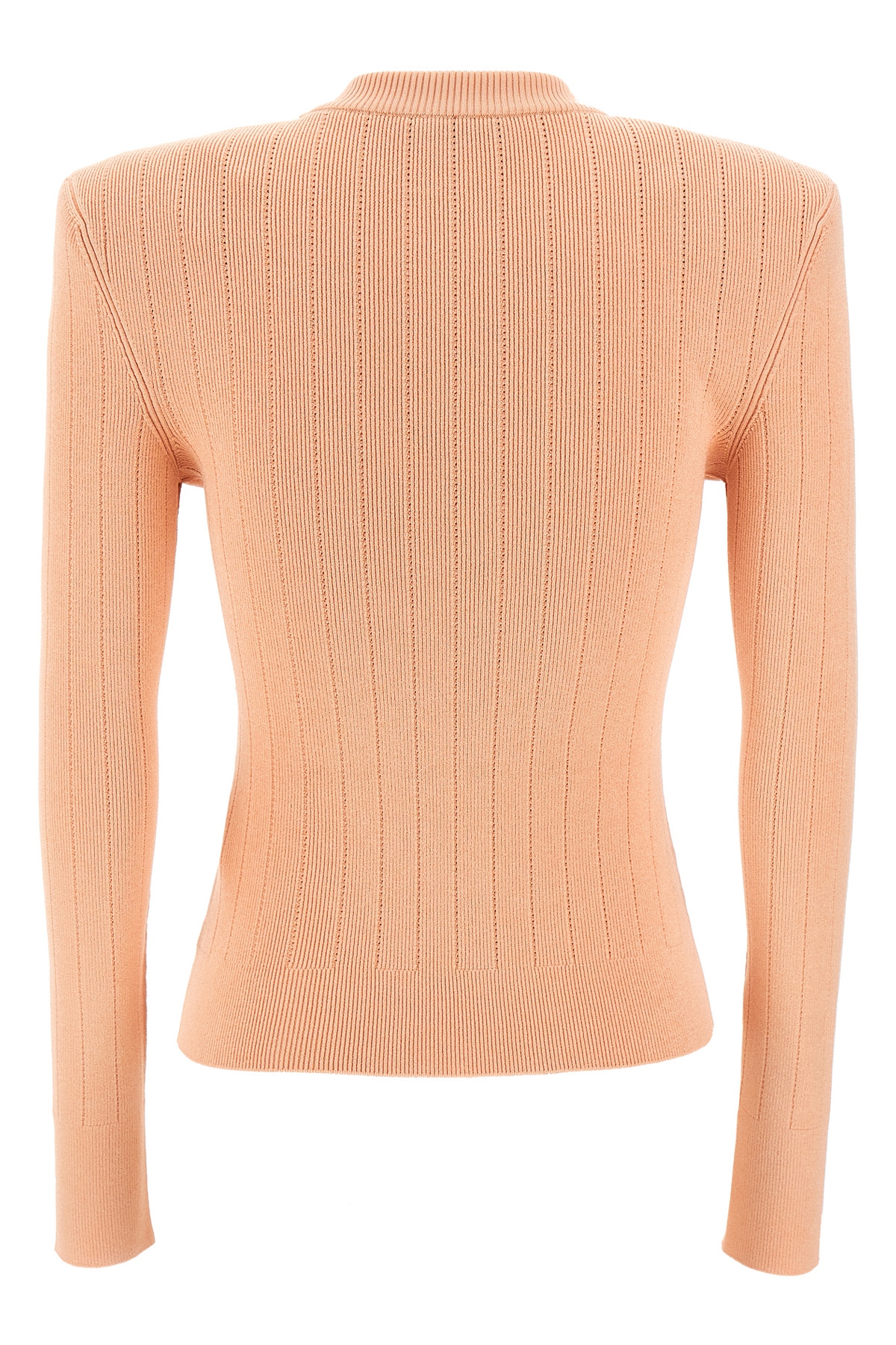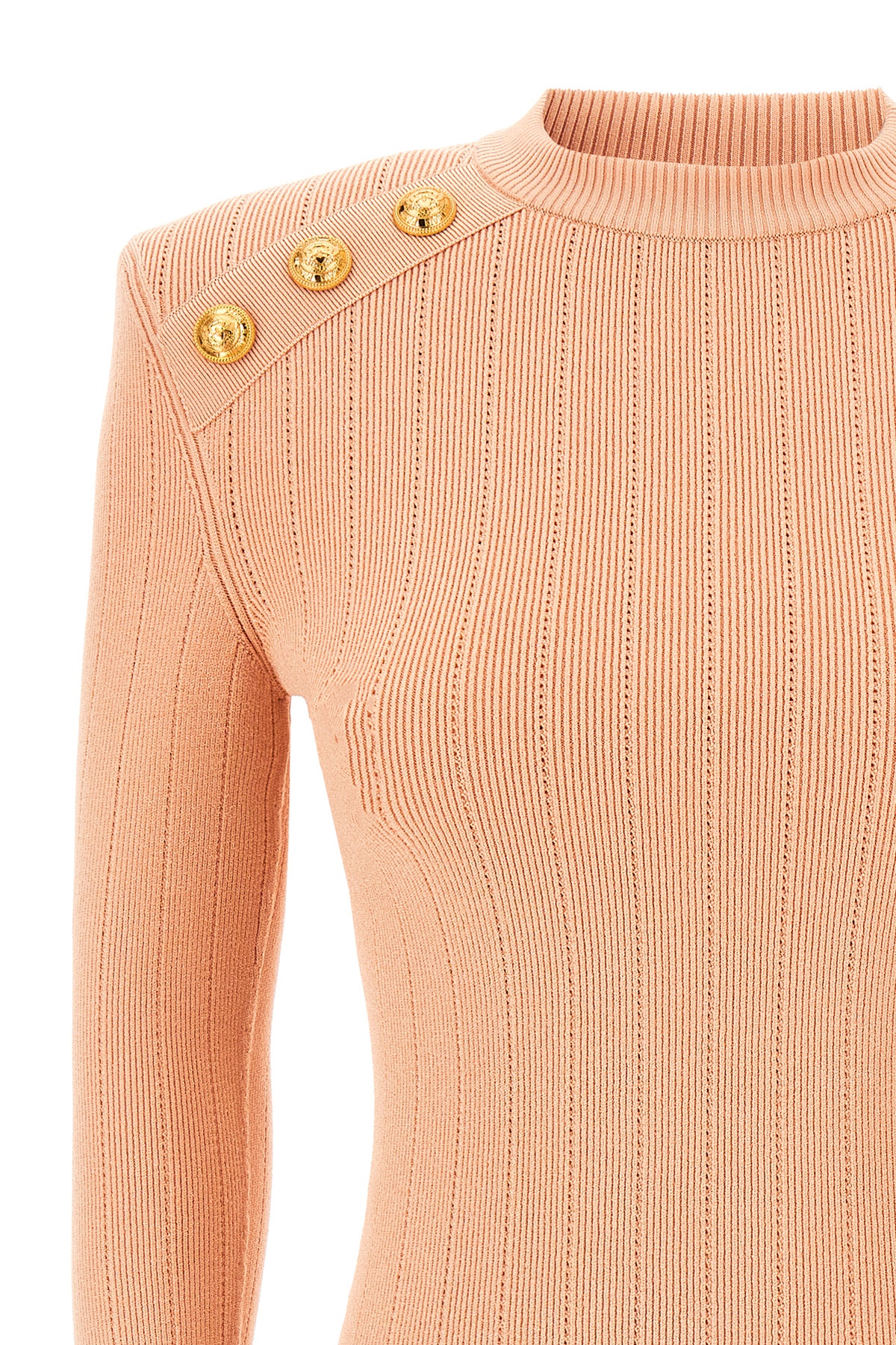 Stretch viscose blend sweater with 'Chiocciola' logo buttons on the shoulders, padded shoulders, crew neck, long sleeves.