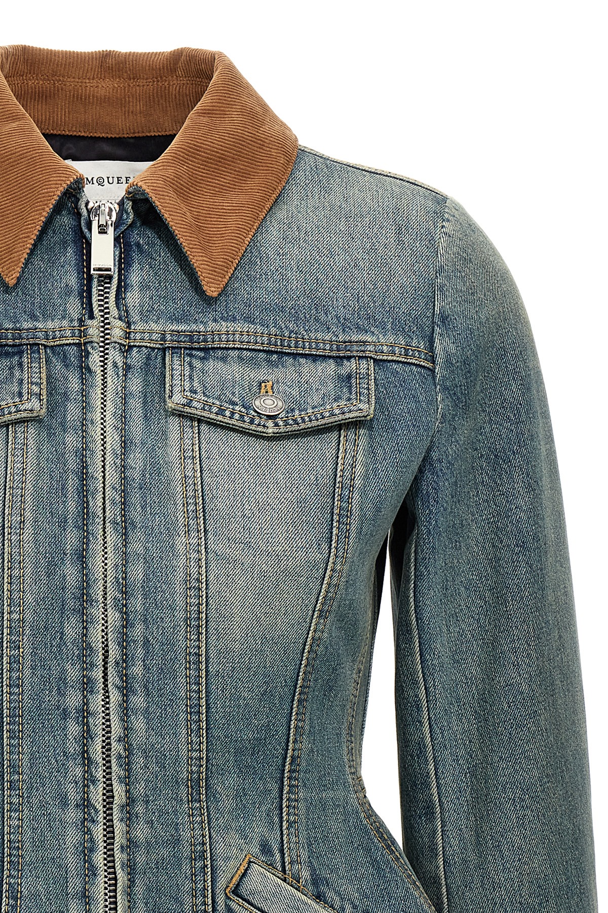 Denim jacket with flared design, front pockets, velvet collar, front zip closure, long sleeves with button.