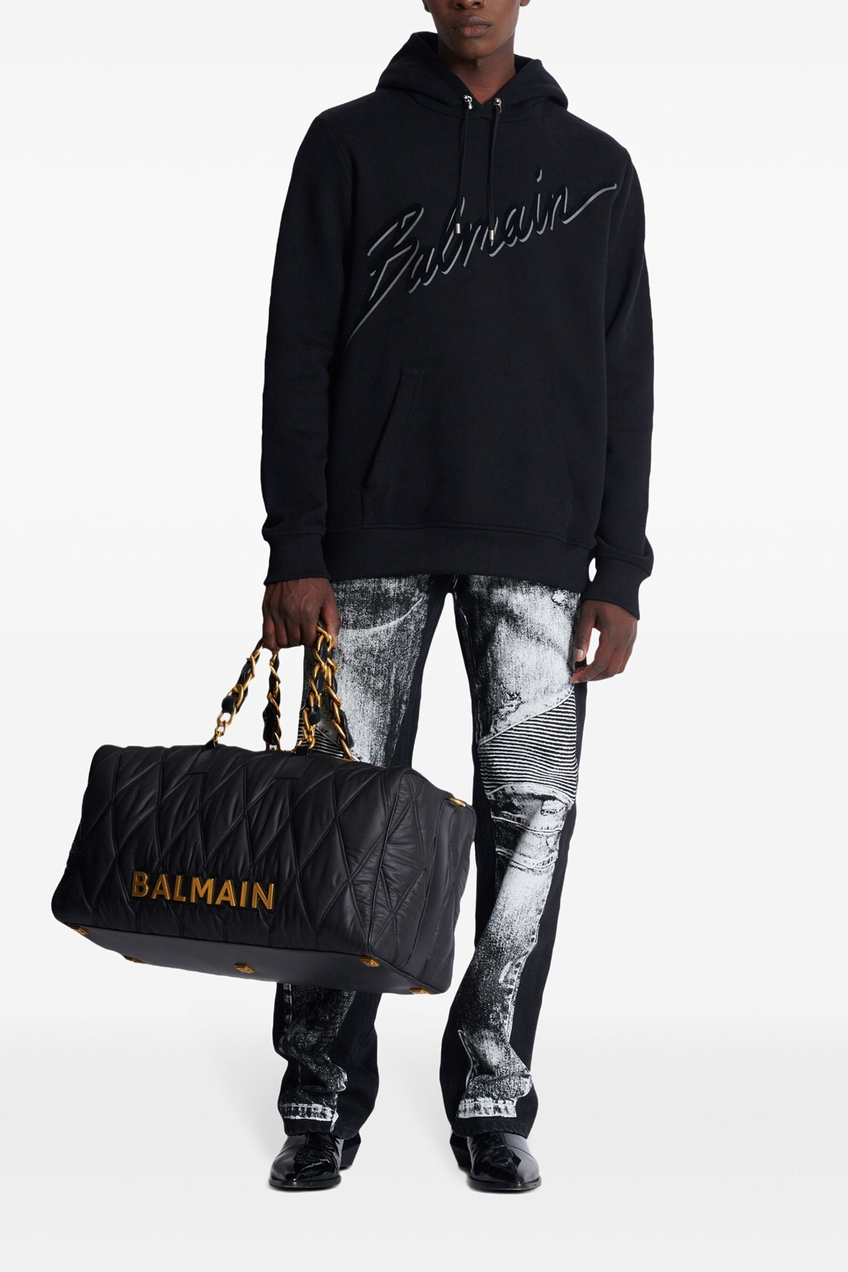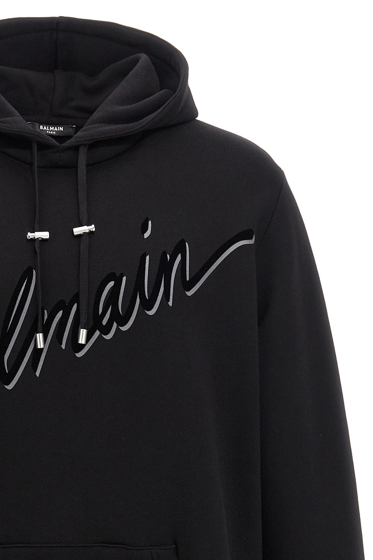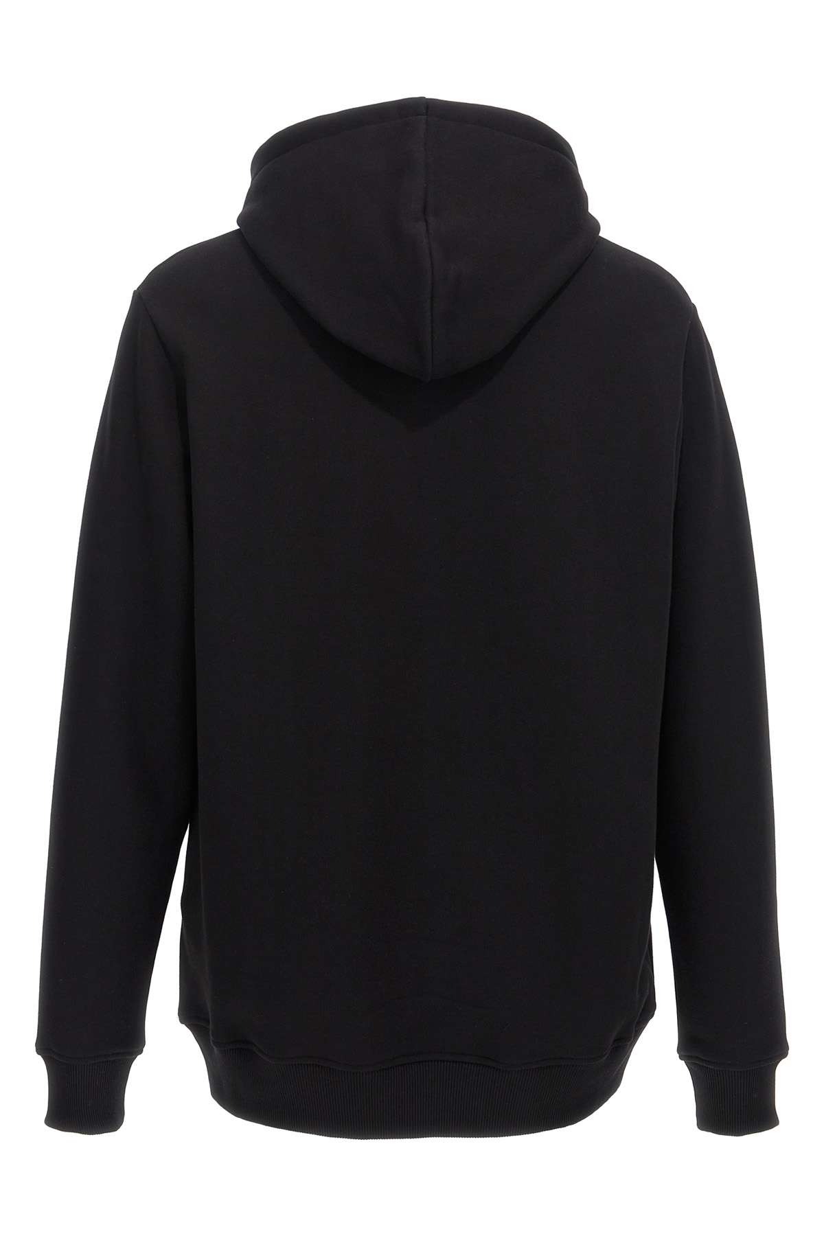 Cotton hoodie with embossed velvet logo on the front, kangaroo pocket, long cuffed sleeves.