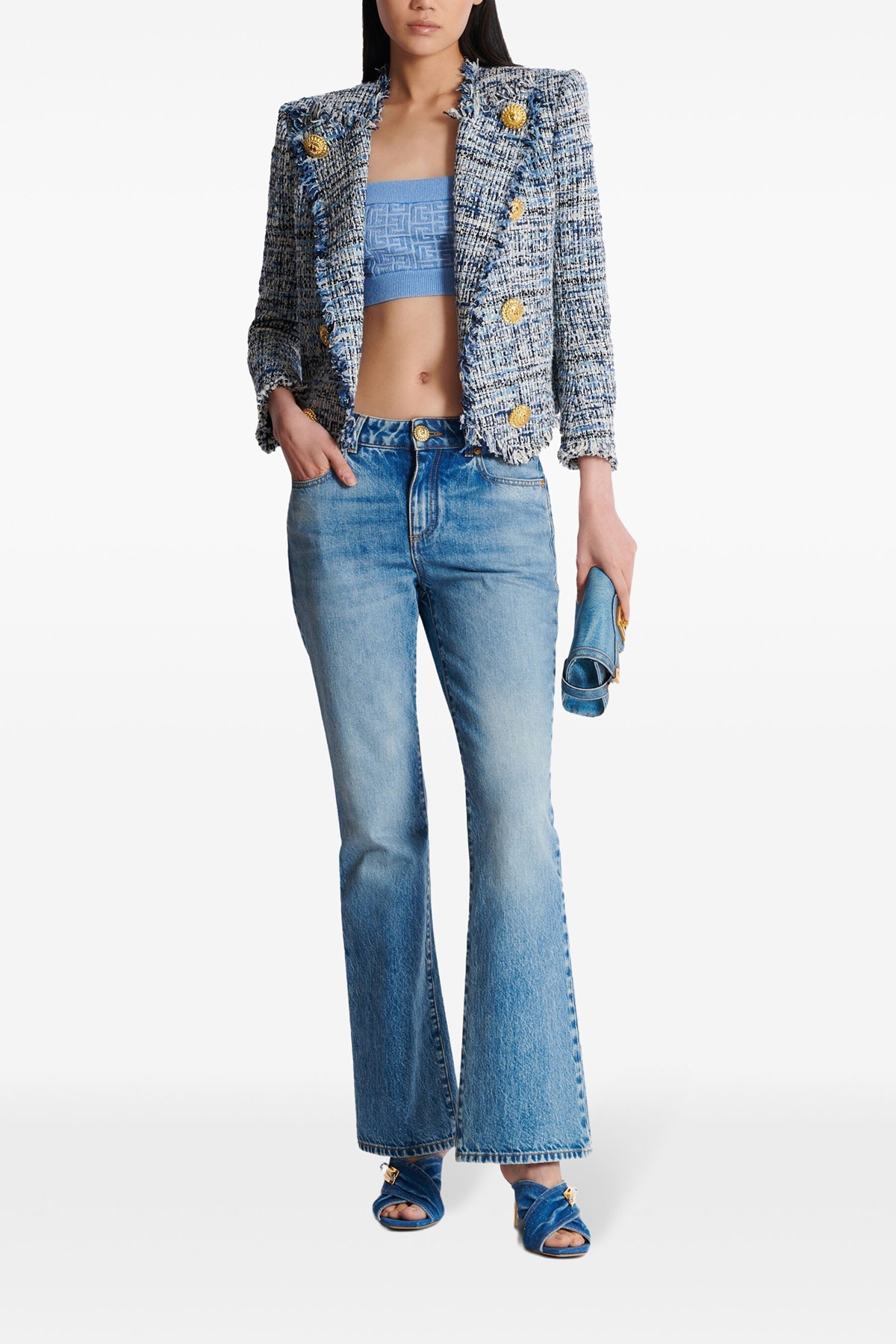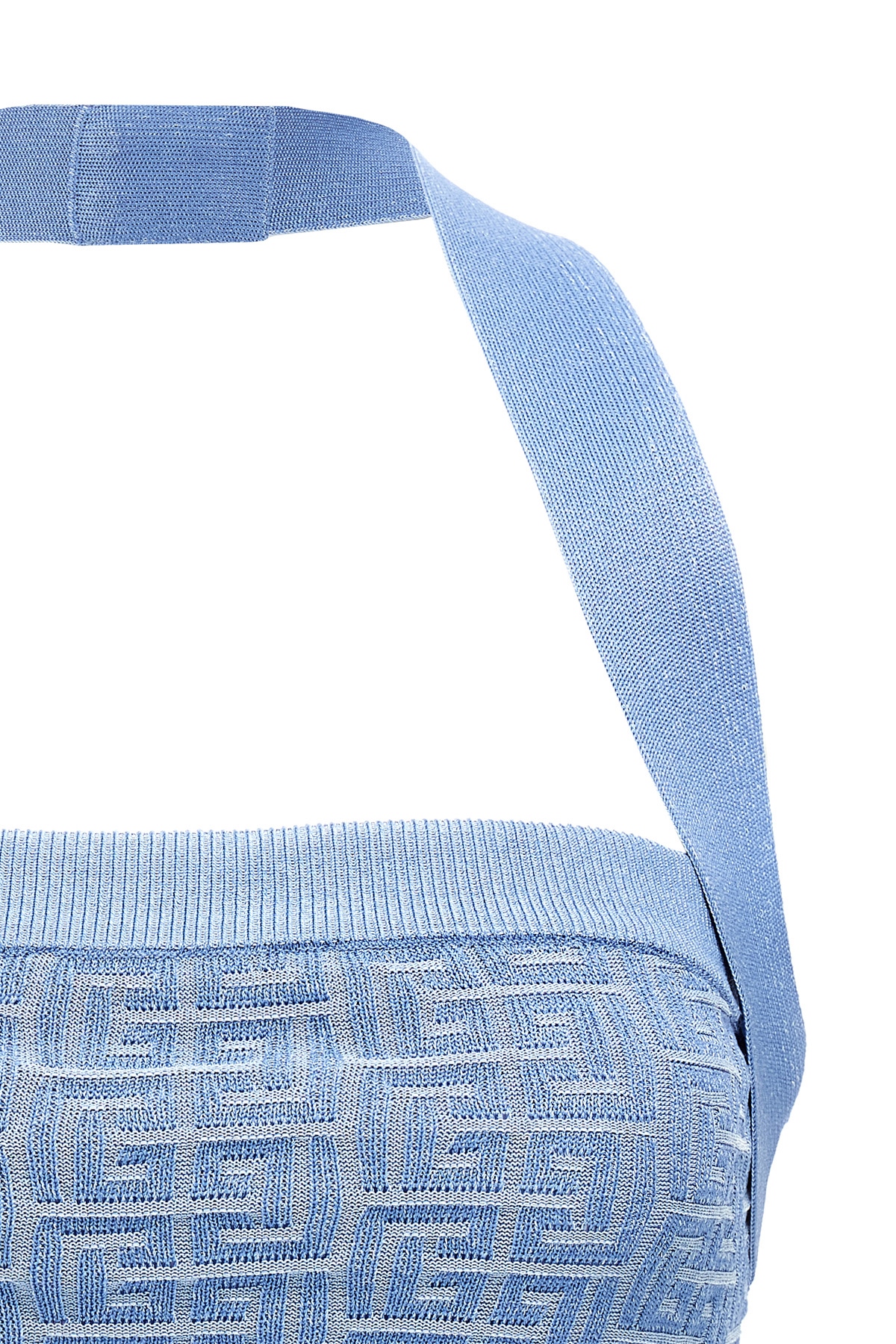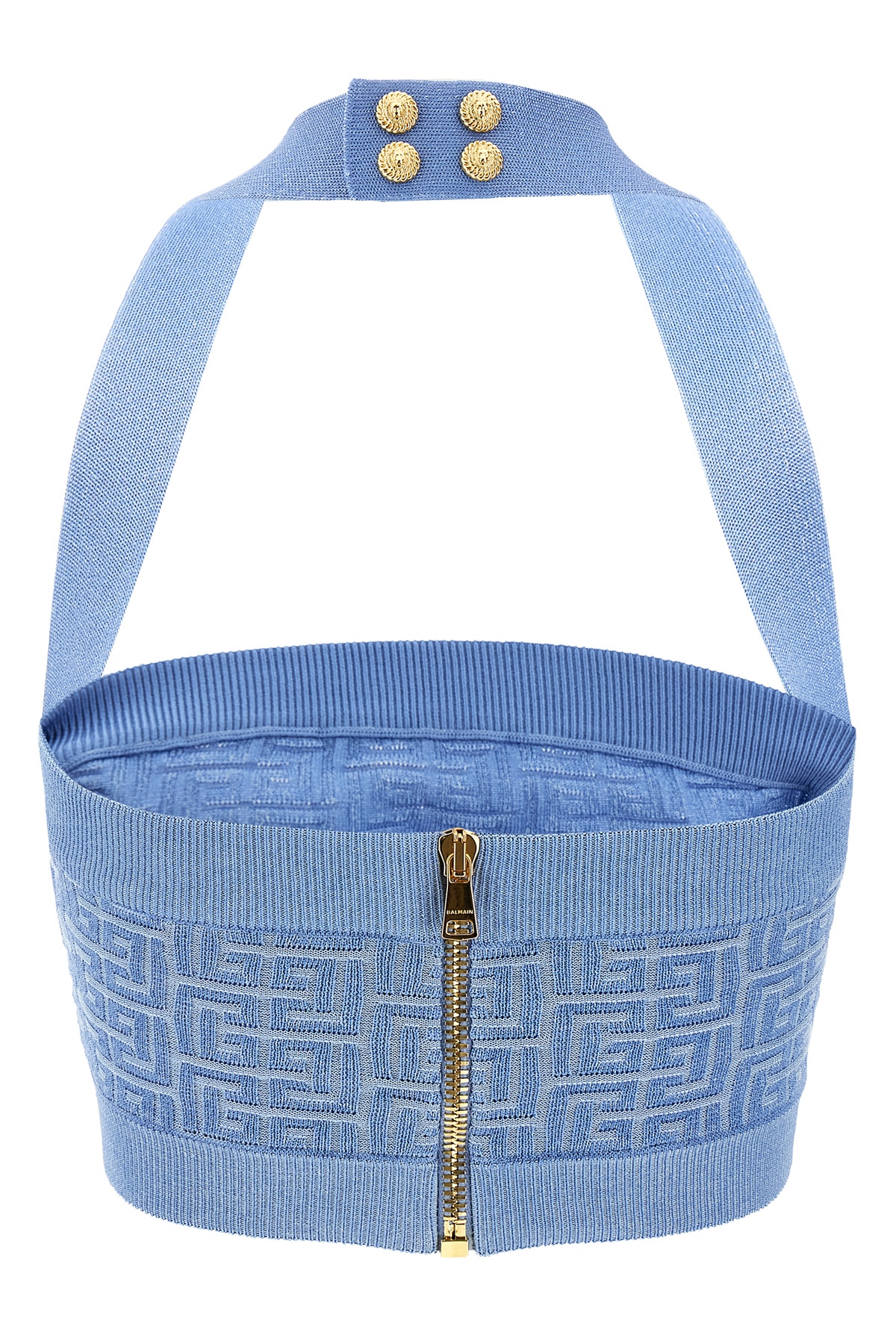 Shiny knit top with labyrinth PB monogram pattern, snap button closure on the neck, back zip closure, crop style.