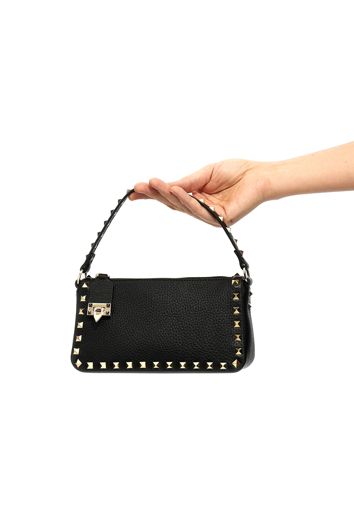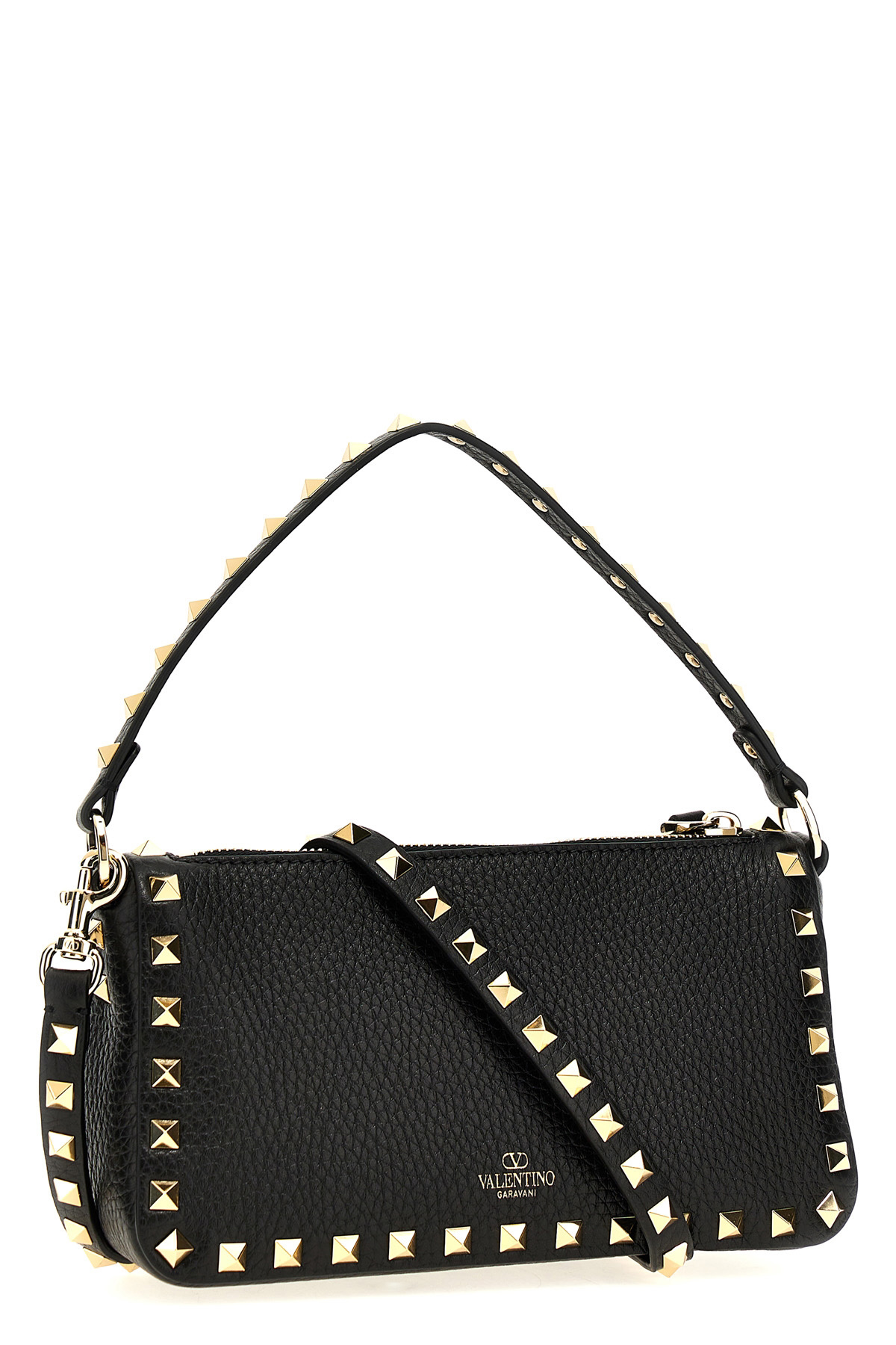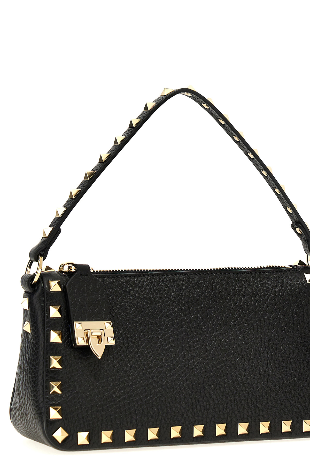 Rockstud Small' leather shoulder bag with stud applique, front embossed logo, zip closure, fixed handle, and removable shoulder strap.