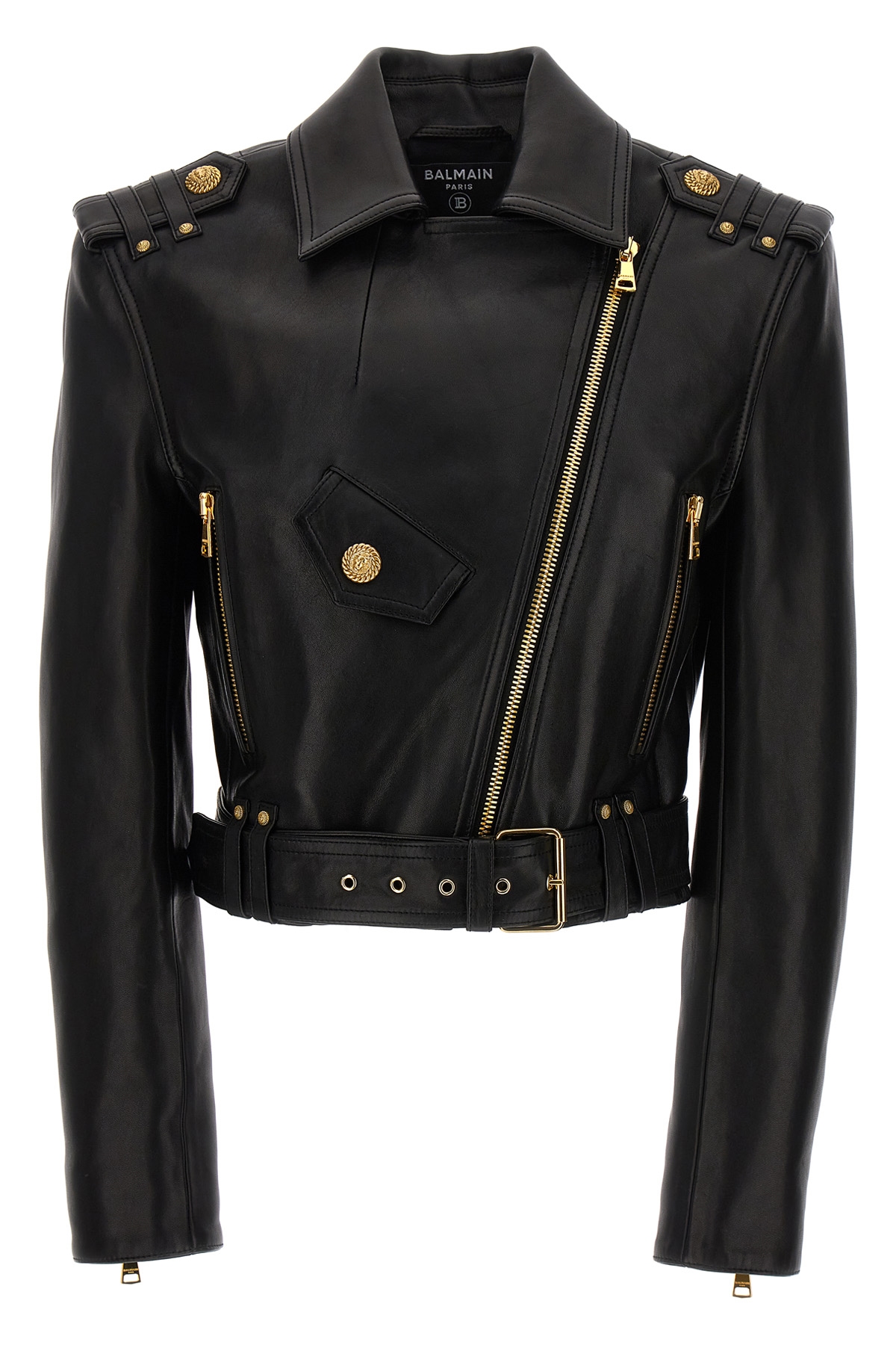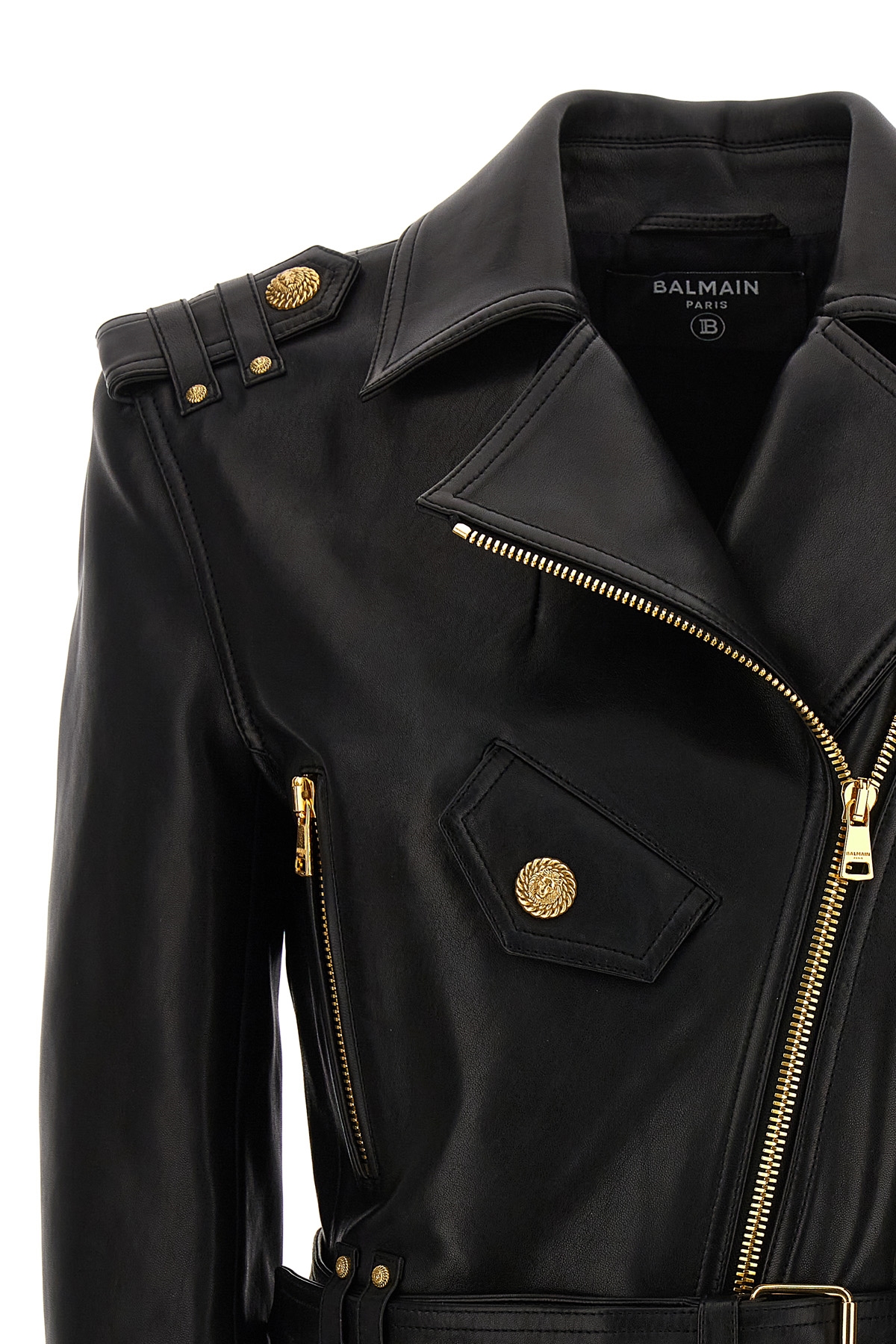 'Biker' leather biker jacket, zip closure, belt at the waist, pockets, long sleeves, logo buttons.