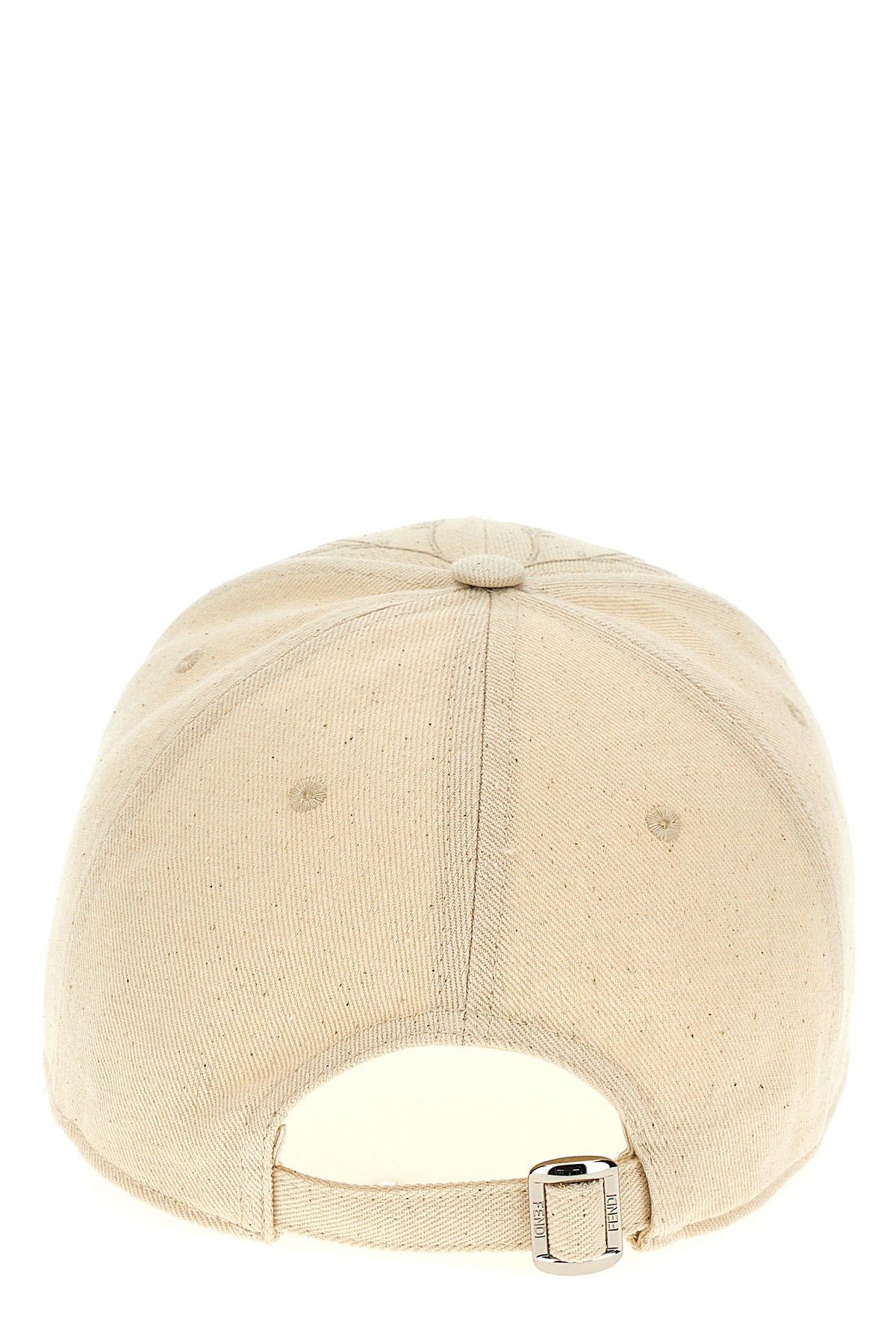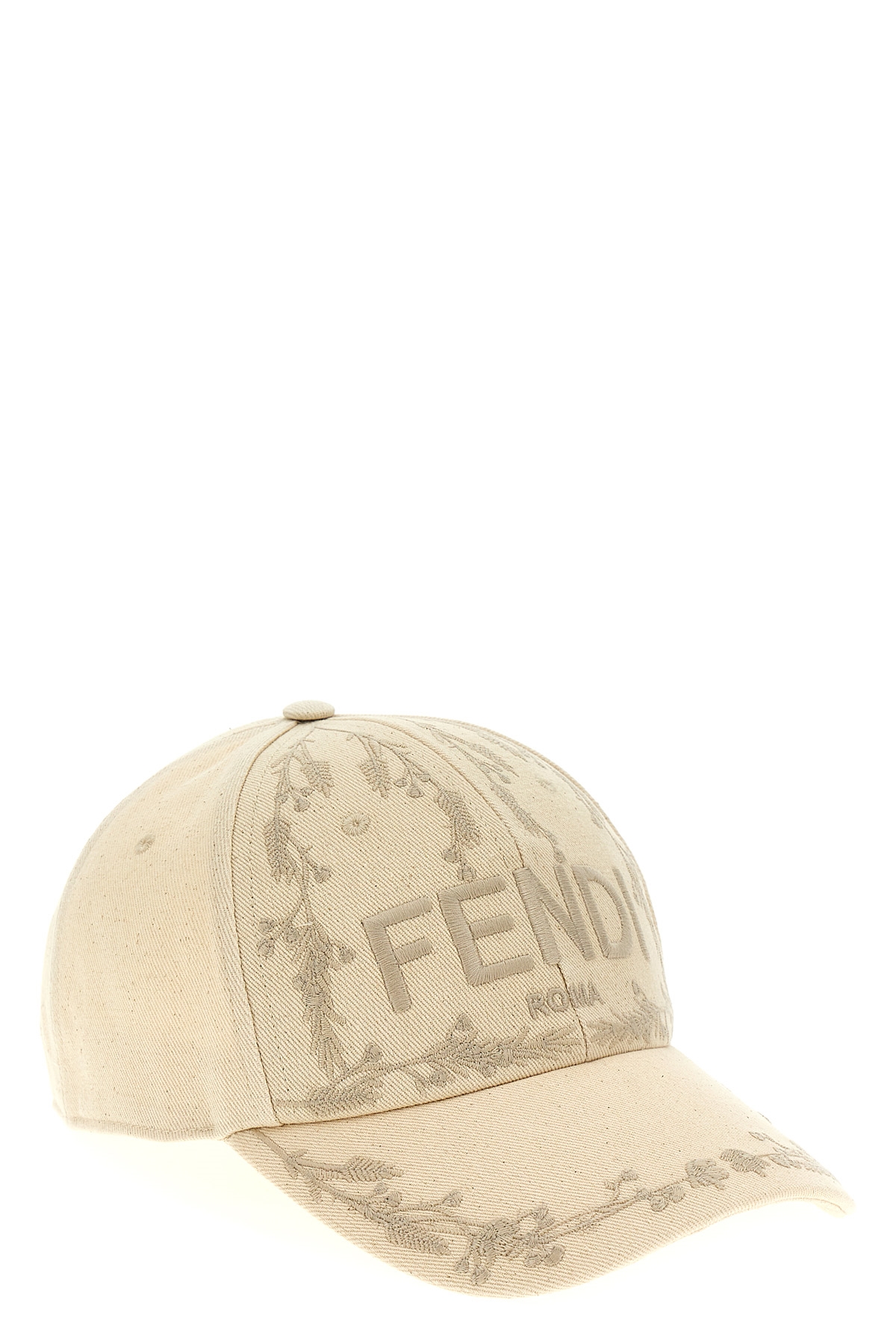 Canvas baseball cap with 'Fendi Roma' logo and floral embroidery, adjustable strap.