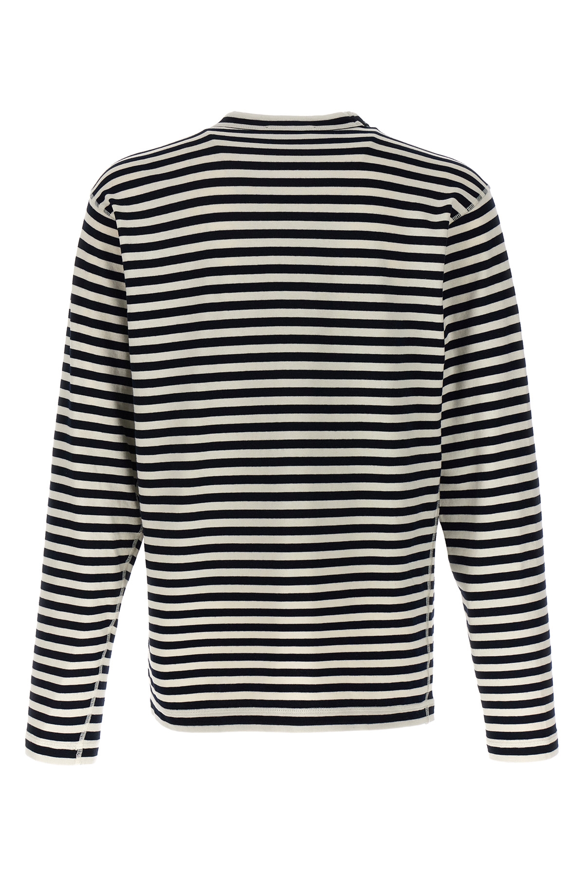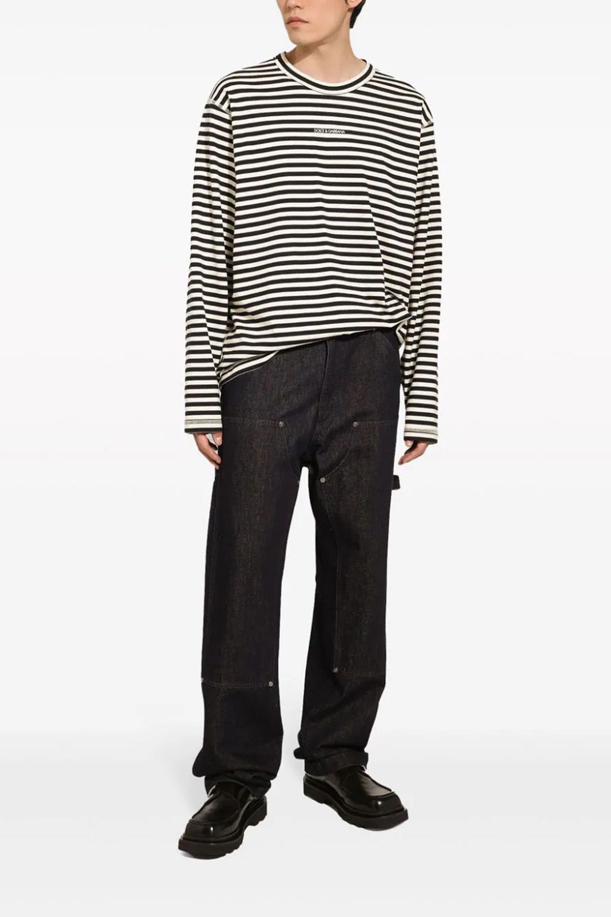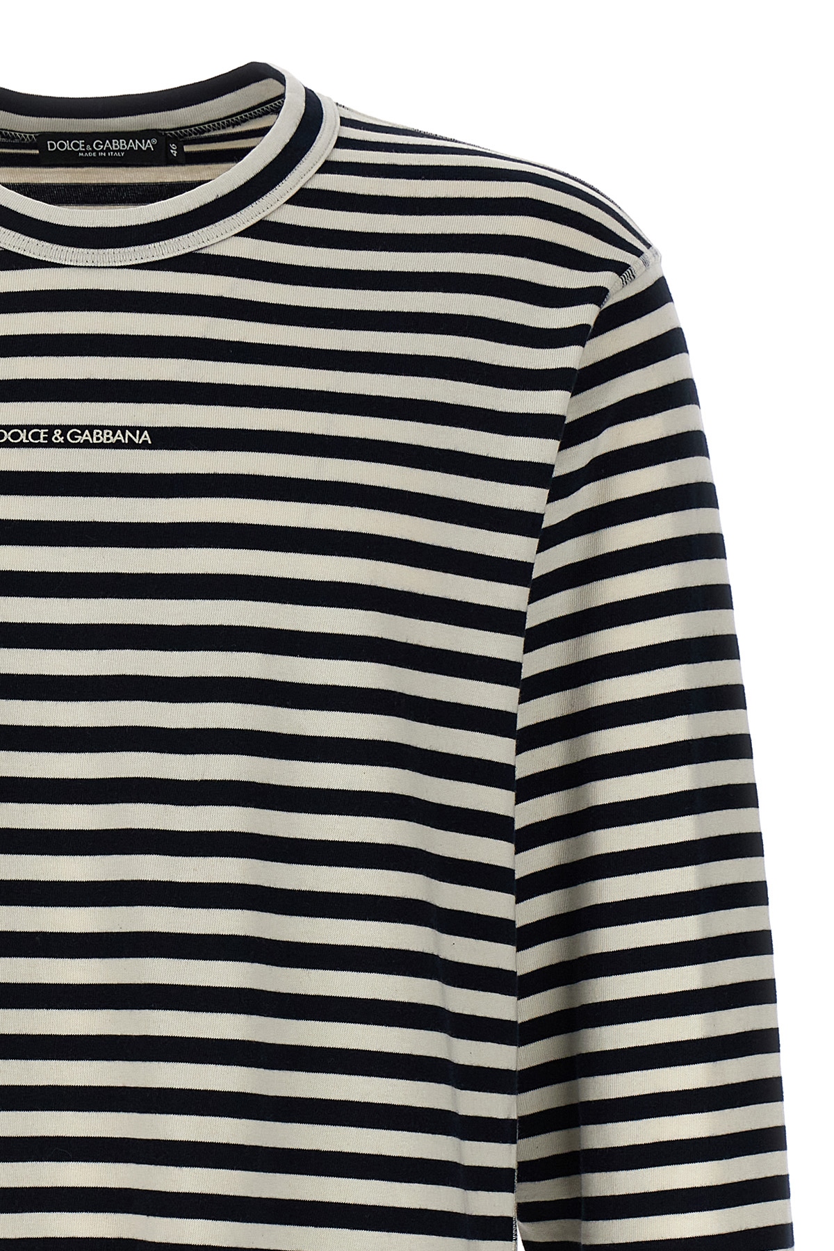 'Marina' striped, crewneck, long amnica cotton t-shirt with front logo print.